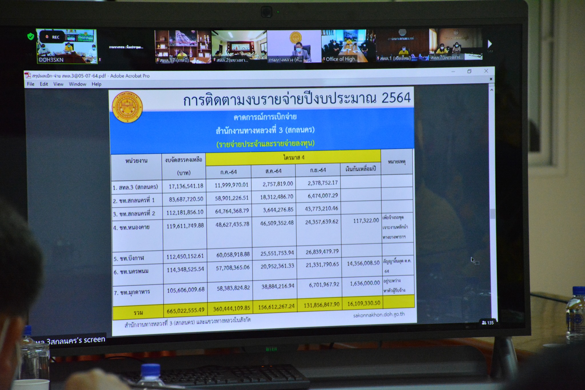 วันที่ 5 กรกฎาคม 2564 ณ ห้องประชุมสำนักงานทางหลวงที่ 3 (สกลนคร) อาคารหลังใหม่ เวลา 09.00 น.นายพัลลภ จันทร์งามปภากูล ผู้อำนวยการสำนักงานทางหลวงที่ 3 พร้อมด้วย นายวุฒิพงศ์ คำภูแสน รองผู้อำนวยการสำนักงานทางหลวงที่ 3 ตำแหน่งที่1 ,นายประวัติ เสวตวงษ์ รองผู้อำนวยการสำนักงานทางหลวงที่ 3 ตำแหน่งที่2 ,นายประสิทธิ์ สาขา ผู้อำนวยการแขวงทางหลวงสกลนครที่ 1 ,ผู้อำนวยการทุกส่วน/ฝ่าย ,วิศวกรส่วนแผนงาน เข้าร่วมประชุมติดตามผลการเบิกจ่ายงบประมาณประจำปี 2564 ของกรมทางหลวง โดยผ่านระบบ Zoom Meeting จากห้องประชุมมนัสคอวนิช ชั้น 2 อาคารพหลโยธิน กรมทางหลวง มีนายสราวุธ ทรงศิวิไล อธิบดีกรมทางหลวง เป็นประธาน ในการประชุมครั้งนี้มีหน่วยงานในสังกัดกรมทางหลวง เข้าร่วมประชุมทางไกลโดยผ่านระบบ Zoom Meeting ทั้ง 18 สำนักงานทางหลวง