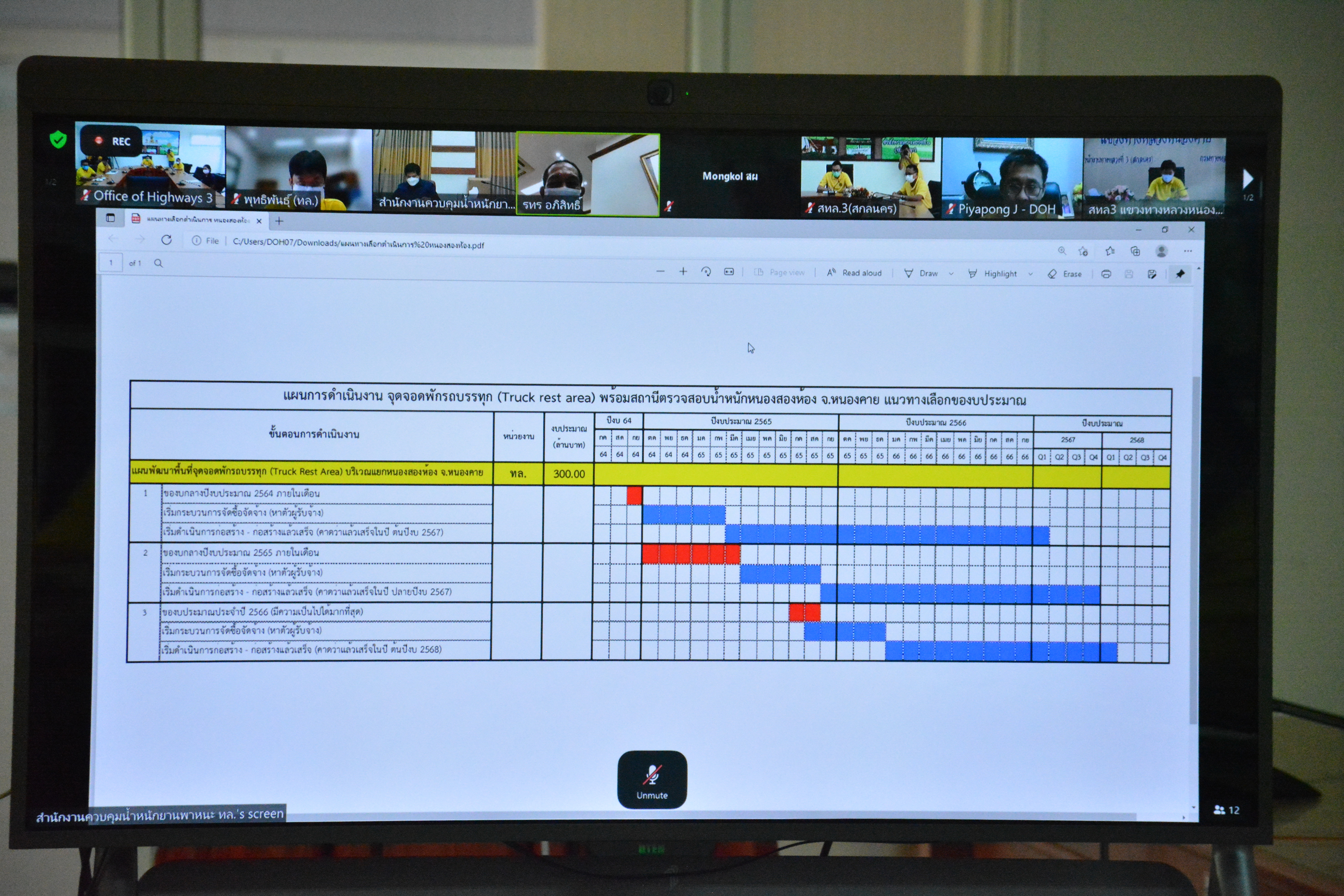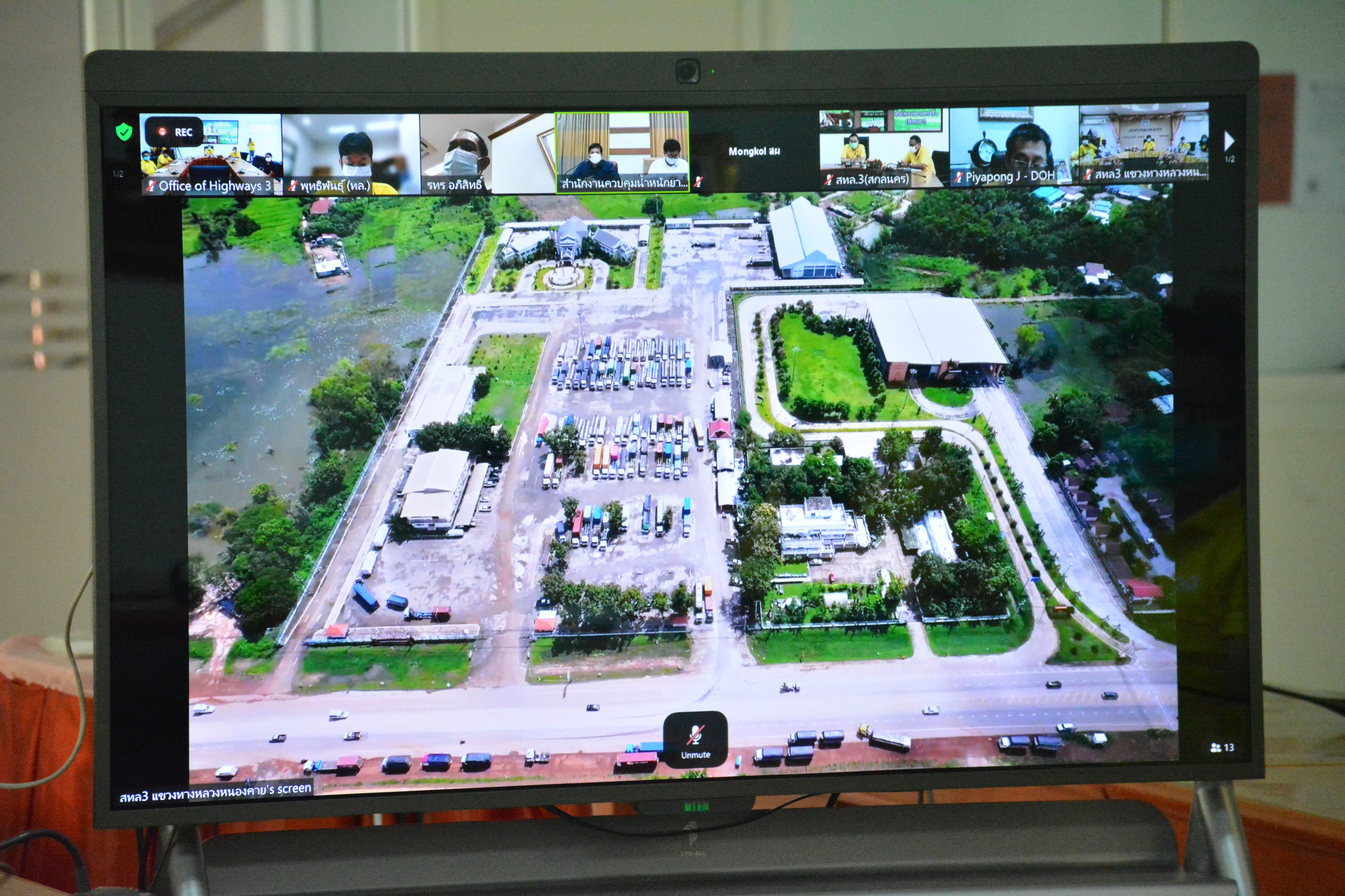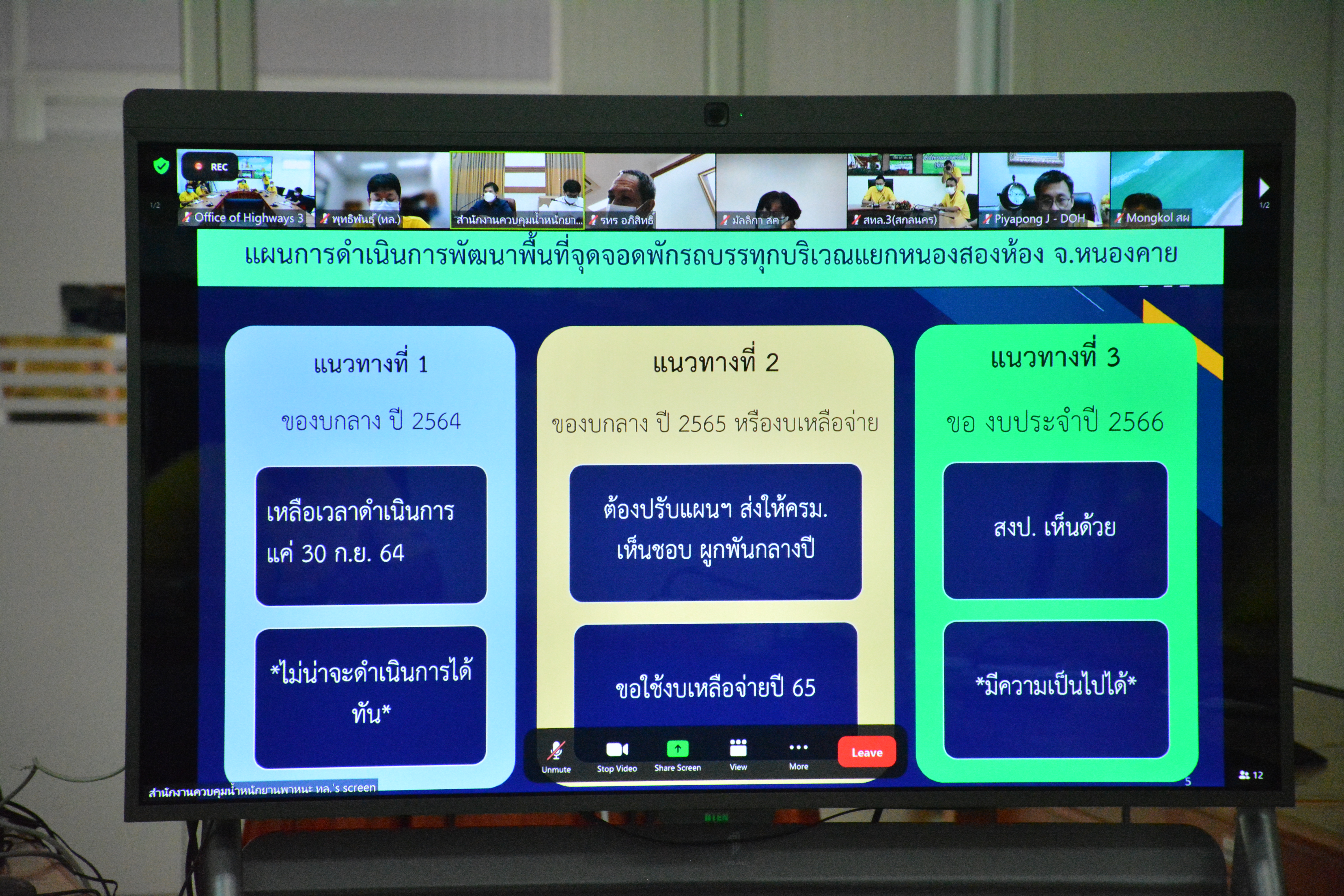 วันที่ 30 สิงหาคม 2564 ณ ห้องประชุมสำนักงานทางหลวงที่ 3 (สกลนคร) อาคารหลังใหม่ เวลา 14.30 นายพัลลภ จันทร์งามปภากูล ผู้อำนวยการสำนักงานทางหลวงที่ 3 พร้อมด้วย นายประวัติ เสวตวงษ์ รองผู้อำนวยการสำนักงานทางหลวงที่ 3 ,นายพงษ์ศักดิ์ อาจลา ผู้อำนวยการส่วนสำรวจและออกแบบ และวิศวกรโยธา/นายช่างโยธา ส่วนแผนงาน ร่วมประชุมเร่งรัดการดำเนินการพัฒนาพื้นที่จุดจอดพักรถบรรทุกบริเวณหนองสองห้องตามกรอบแนวทางการเตรียมความพร้อมรองรับการเปิดให้บริการรถไฟสายสาธารณรัฐประชาชนจีนและสาธารณรัฐประชาธิปไตยประชาชนลาว ในระยะเร่งด่วนครั้งที่ 2/2564 โดยผ่านระบบ Zoom Cloud Meeting มีนายอภิสิทธิ์ พรหมเสน รองอธิบดีกรมทางหลวง เป็นประธาน