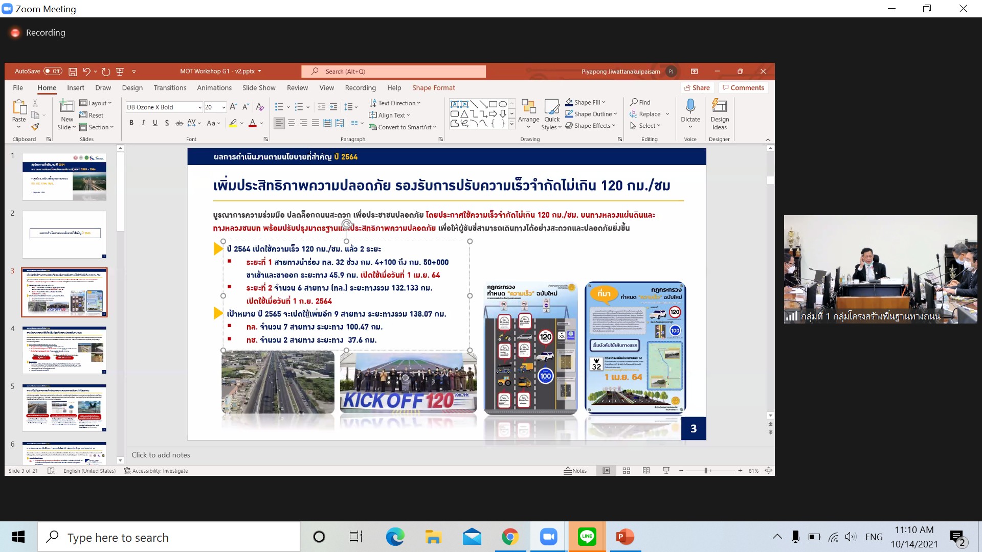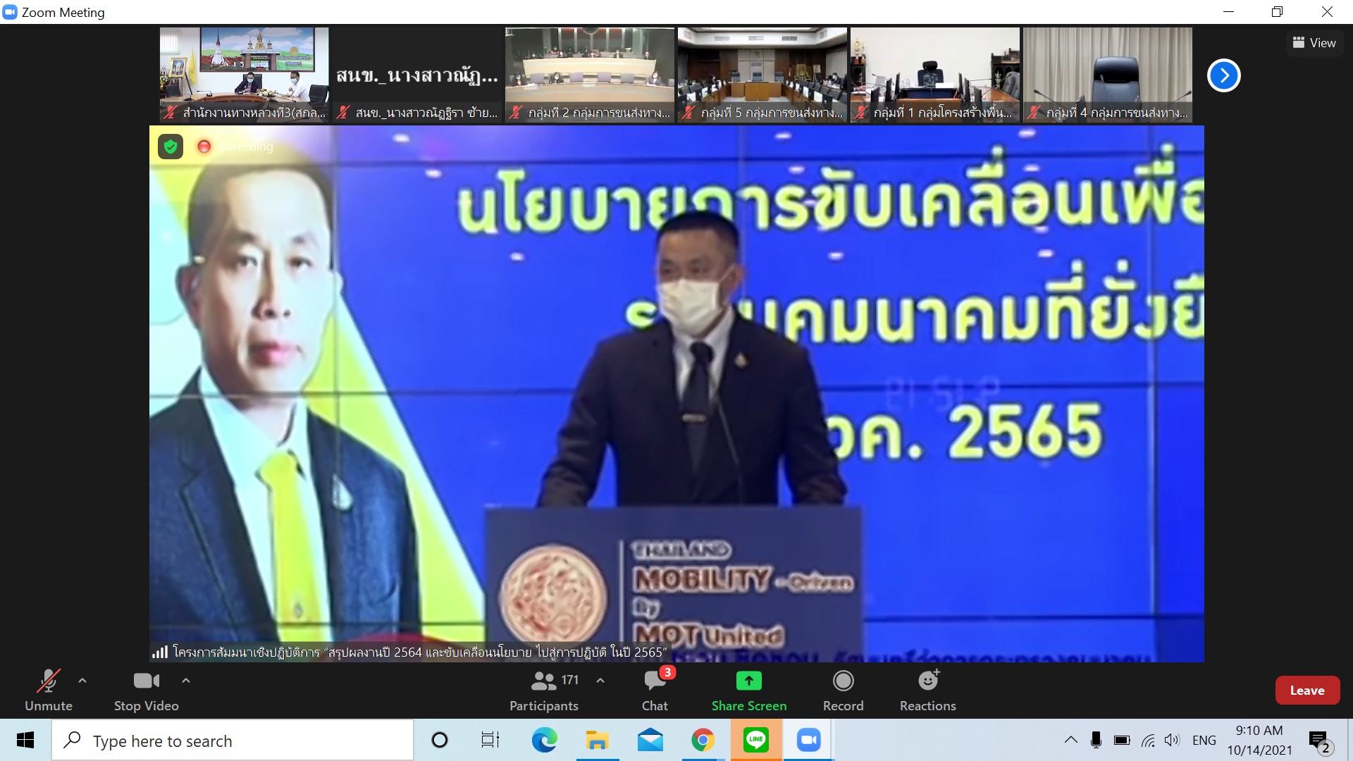 วันที่ 14 – 15 ตุลาคม 2564 ณ ห้องประชุมสำนักงานทางหลวงที่ 3 (สกลนคร) อาคารหลังใหม่ เวลา 09.00 น. นายพัลลภ จันทร์งามปภากูล ผู้อำนวยการสำนักงานทางหลวงที่ 3 พร้อมด้วยนายประวัติ เสวตวงษ์ รองผู้อำนวยการสำนักงานทางหลวงที่ 3 เข้าร่วมโครงการสัมมนาเชิงปฏิบัติการ สรุปผลงานปี 2564 และขับเคลื่อนนโยบายไปสู่การปฏิบัติในปี 2565 (ผู้บริหารระดับต้น ผู้อำนวยการระดับสูง ผู้อำนวยการระดับต้น ของทุกหน่วยงานในสังกัด) โดยผ่านระบบ Zoom Cloud Meeting จากห้องประชุมชั้น 3 อาคารสโมสรและหอประชุมกระทรวมคมนาคม มีนายศักดิ์สยาม ชิดชอบ รัฐมนตรีกระทรวงคมนาคม เป็นประธาน