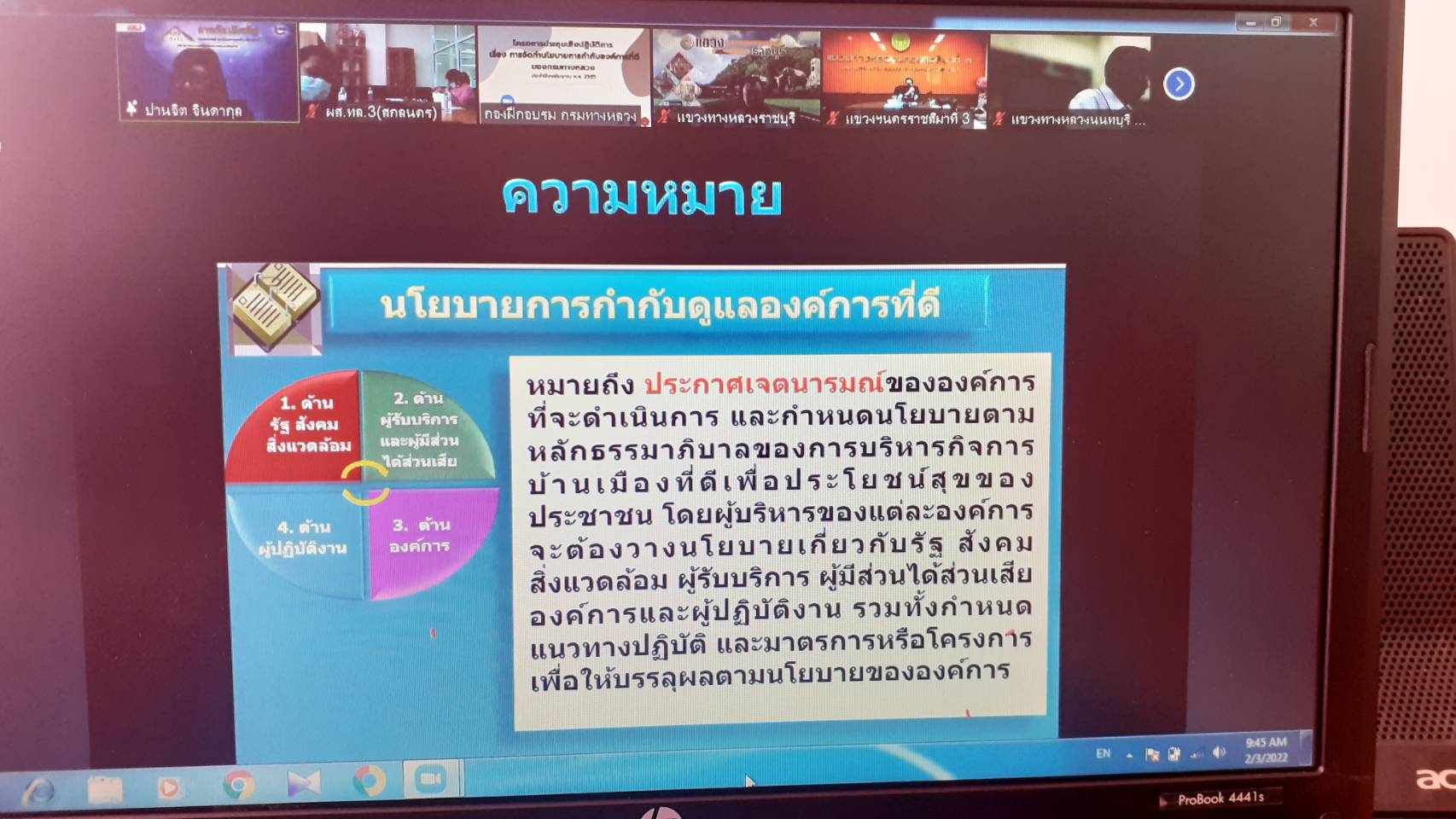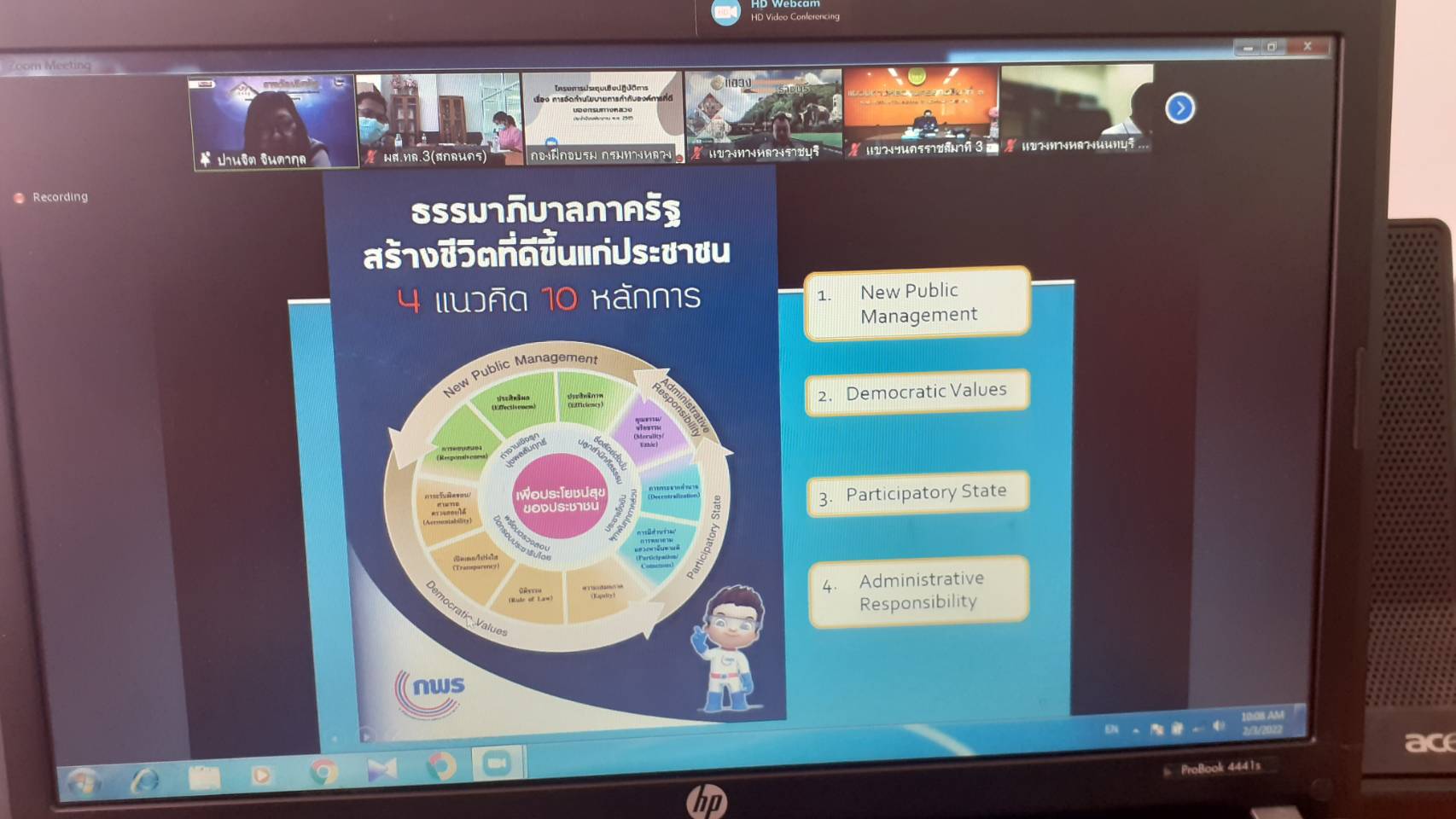 วันที่ 3 กุมภาพันธ์ 2565 ณ ห้องประชุมชั้น 2 สำนักงานทางหลวงที่ 3 (สกลนคร) อาคารหลังใหม่ เวลา 09.00 นายพัลลภ จันทร์งามปภากูล ผู้อำนวยการสำนักงานทางหลวงที่ 3 พร้อมด้วยนางนภาพิศ สุวรรณศรี ผู้อำนวยการส่วนบริหาร นางญาณวรรณ บุษดี นักจัดการงานทั่วไปชำนาญการ และนางมุทิชา นนตะเสน จพ.ธุรการชำนาญงาน ร่วมโครงการประชุมเชิงปฏิบัติการ เรื่องการจัดทำนโยบายการกำกับดูแลองค์กรการที่ดีของกรมทางหลวง ประจำปีงบประมาณ พ.ศ.2565 โดยผ่านระบบ Zoom Cloud Meeting มีวิทยากรจากกองฝึกอบรมกรมทางหลวงบรรยายให้ความรู้แก่ บุคลากร เจ้าหน้าที่ ของสำนักงานทางหลวง แขวงทางหลวง หมวดทางหลวง ในสังกัดกรมทางหลวง ที่เข้าร่วมโครงการฯ