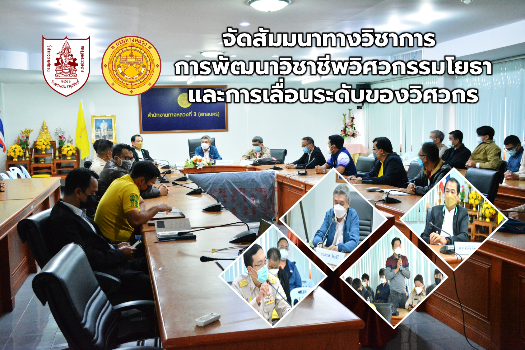 วันที่21 กุมภาพันธ์ 2565 เวลา 09.00น.-12.00น.สำนักงานทางหลวงที่ 3 (สกลนคร)จัดสัมมนาทางวิชาการ ในหัวข้อการพัฒนาวิชาชีพวิศวกรรมโยธาและการเลื่อนระดับของวิศวกร เพื่อให้ความรู้ด้านวิชาการและแนวทางการเลื่อนระดับของวิศวกรในสังกัดฯ นายพัลลภ จันทร์งามปภากูล ผู้อำนวยการสำนักงานทางหลวงที่ 3 พร้อมด้วย นายประวัติ เสวตวงษ์ รองผู้อำนวยการสำนักงานทางหลวงที่ 3 ตำแหน่งที่ 2 นายประสิทธิ์ สาขา ผู้อำนวยการแขวงทางหลวงสกลนครที่ 1 และนายเดชา พรวนพิทักษ์ ผู้อำนวยการแขวงทางหลวงนครพนม นำวิศวกรโยธา หัวหน้าหมวดทางหลวงในสังกัด และนายช่างโยธา ร่วมสัมมนาทางวิชาการ ณ ห้องประชุมทวีพัฒน์ ตินะมาส