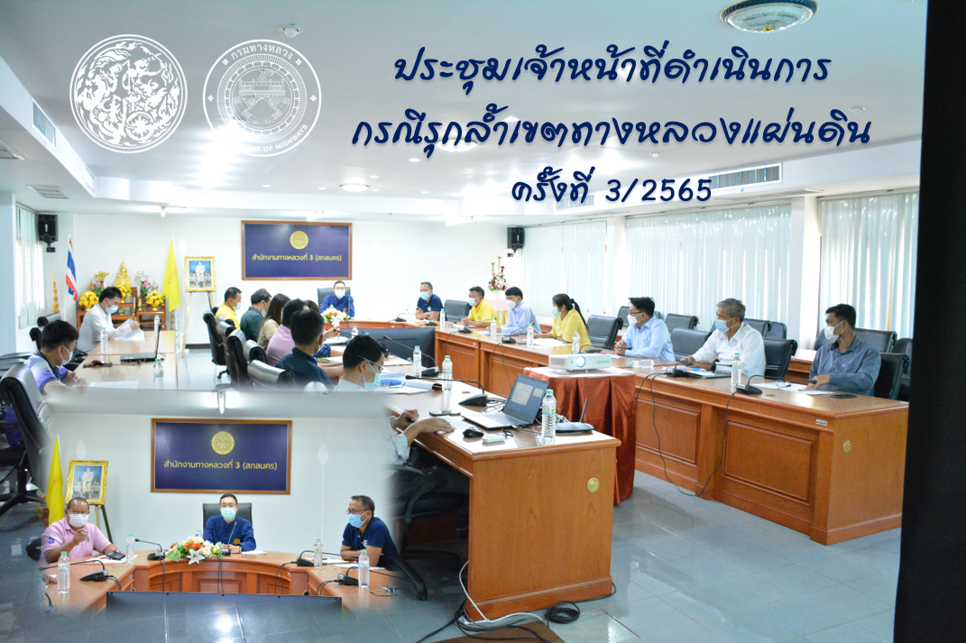วันที่ 2 มีนาคม 2565 เวลา 13.30น. นายพัลลภ จันทร์งามปภากูล ผู้อำนวยการสำนักงานทางหลวงที่ 3 เป็นประธาน ประชุมเจ้าหน้าที่ดำเนินการกรณีรุกล้ำเขตทางหลวงแผ่นดิน ครั้งที่3/2565 ทางหลวงหมายเลข 22 สายอุดรธานี – สกลนครในพื้นที่แขวงทางหลวงสกลนครที่ 2(สว่างแดนดินร) และทางหลวงหลวงหมายเลข 2346 ตอน นาหว้า-ดงขวาง กม.26+244 – กม.26+275 ในพื้นที่แขวงทางหลวงนครพนม มีนายวุฒิพงศ์ คำภูแสน รองผู้อำนวยการสำนักงานทางหลวงที่ 3 ตำแหน่งที่1 นายประวัติ เสวตวงษ์ รองผู้อำนวยการสำนักงานทางหลวงที่ 3 ตำแหน่งที่ 2 นายวิชาญ ผิวดำ ผู้อำนวยการแขวงทางหลวงสกลนครที่ 2 (สว่างแดนดิน) นายเดชา พรวนพิทักษ์ ผู้อำนวยการแขวงทางหลวงนครพนม นายภมร ทับทิมทอง รองผู้อำนวยการแขวงทางหลวงสกลนครที่ 2 (สว่างแดนดิน)ฝ่ายปฏิบัติการ นางไพรพรรณ เทือกทอง รองผู้อำนวยการแขวงทางหลวงสกลนครที่ 2 (สว่างแดนดิน) ฝ่ายบริหาร นายยอดเพ็ชร คำแสงดี รองผู้อำนวยการแขวงทางหลวงนครพนม ฝ่ายปฎิบัติการ นายปัญญา พึ่งประจวบ รองผู้อำนวยการแขวงทางหลวงนครพนม ฝ่ายวิศวกรรม นายพุฒิพงษ์ สุดหล้า หัวหน้างานแผนงาน แขวงทางหลวงนครพนม นายหนูกาญ เจริญไชย ผู้อำนวยการส่วนกฎหมายและกรรมสิทธิ์ที่ดิน นางนภาพิศ สุวรรณศรี ผู้อำนวยการส่วนบริหาร นายอำนาจ สาไชยันต์ ผู้อำนวยการส่วนเทคโนโลยีสารสนเทศ นายวีรวัฒน์ บุงนาแซง นิติกรปฎิบัติการ นายมนตรี อินธุโสภณ หัวหน้าหมวดหมวดทางหลวงสว่างแดนดิน นายเสถียร สายสมบัติ หัวหน้าหมวดทางหลวงพังโคน และนายศิลวัต หินสอ ผู้ช่วยหมวดทางหลวงพังโคน ร่วมประชุม ณ ห้องประชุมทวีพัฒน์ ตินะมาส