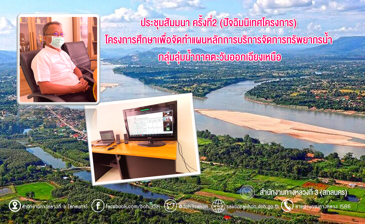 วันที่ 27 พฤษภาคม 2565 เวลา08.30-12.00น. นายประวัติ เสวตวงษ์ รองผู้อำนวยการสำนักงานทางหลวงที่ 3 ร่วมประชุมสัมมนา ครั้งที่2(ปัจฉิมนิเทศโครงการ) โครงการศึกษาเพื่อจัดทำแผนหลักการบริการจัดการทรัพยากรน้ำ กลุ่มลุ่มน้ำภาคตะวันออกเฉียงเหนือ โดยผ่านระบบ Zoom Cloud Meeting จากห้องประชุมแกรนด์เบญจวรรณ โรงแรมหนองคายธาวิลล่า อำเภอเมือง จังหวัดหนองคาย