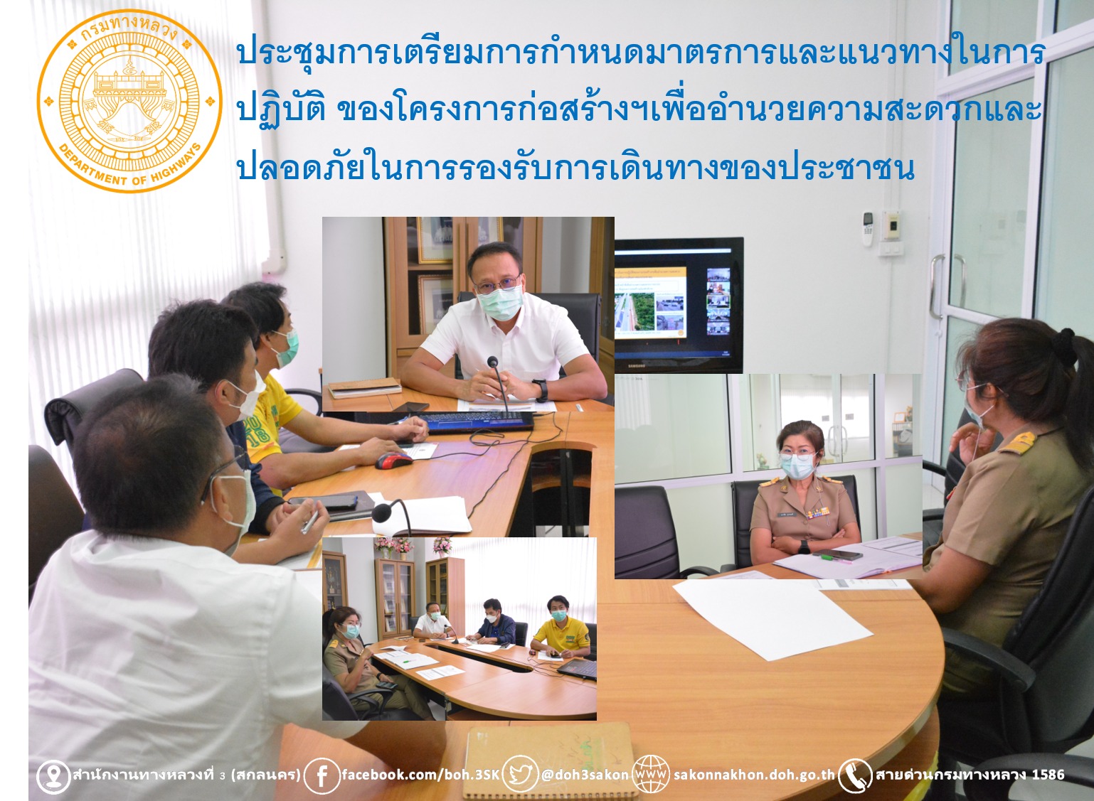 วันที่ 11 กรกฎาคม 2565 เวลา 13.30 น. นายประวัติ เสวตวงษ์ รองผู้อำนวยการสำนักงานทางหลวงที่ 3 พร้อมด้วย นางนภาพิศ สุวรรณศรี ผู้อำนวยการส่วนบริหารงาน นายอำนาจ สาไชยันต์ ผู้อำนวยการส่วนเทคโนโลยีสารสนเทศ ประชุมการเตรียมการกำหนดมาตรการและแนวทางในการปฏิบัติ ของโครงการก่อสร้างฯเพื่ออำนวยความสะดวกและปลอดภัยในการรองรับการเดินทางของประชาชน ในช่วงวันอาสาฬหบูชาและวันเข้าพรรษา ระหว่างวันที่ 13-17 กรกฎาคม 2565 และวันเฉลิมพระชนมพรรษาฯ ระหว่างวันที่ 28-31 กรกฎาคม 2565 โดยผ่านระบบ Zoom Cloud Meeting โดยนายไพฑูรย์ พงษ์ชวลิต รองอธิบดีกรมทางหลวง ฝ่ายบริหาร รักษาราชการแทน รองอธิบดีกรมทางหลวง ฝ่ายบำรุงทาง เป็นประธาน