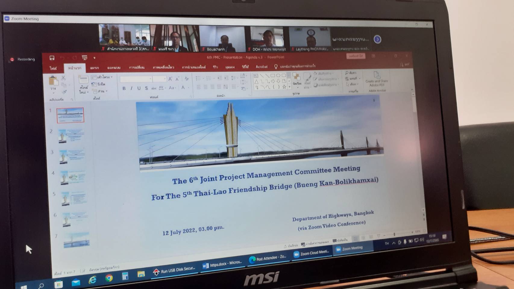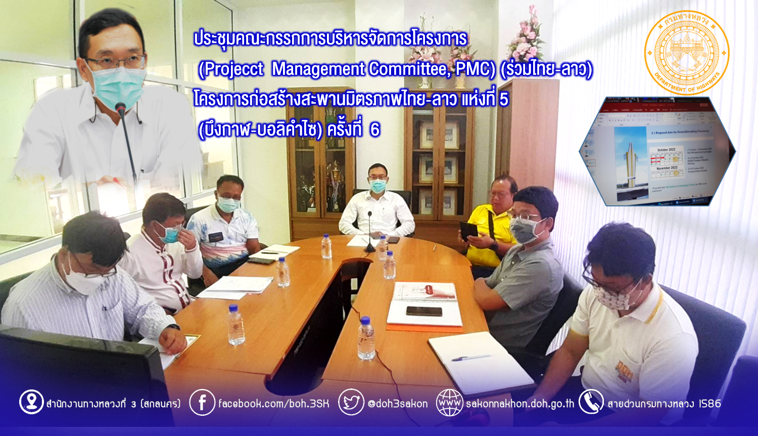 วันที่ 12 กรกฎาคม 2565 ณ ห้องประชุมชั้นสอง สำนักงานทางหลวงที่ 3 (สกลนคร) อาคารหลังใหม่ เวลา15.00 น. นายพัลลภ จันทร์งามปภากูล ผู้อำนวยการสำนักงานทางหลวงที่ 3 พร้อมด้วย นายวุฒิพงศ์ คำภูแสน รองผู้อำนวยกาสำนักงานทางหลวงที่ 3 ตำแหน่งที่1 นายประวัติ เสวตวงษ์ รองผู้อำนวยการสำนักงานทางหลวงที่ 3 ตำแหน่งที่2 นายพงษศักดิ์ อาจลา ผู้อำนวยการส่วนสำรวจและออกแบบ นายหนูกาญ เจริญไชย ผู้อำนวยการส่วนกฎหมายและกรรมสิทธิ์ที่ดิน นายผดุง ศรีโคตา วิศวกรโยธาปฏิบัติการ ส่วนแผนงาน และนายวุฒินันต์ ทัศคร วิศวกรโยธาชำนาญการ ส่วนสำรวจและออกแบบ ร่วมประชุมคณะกรรมการบริหารจัดการโครงการ(Project Management Committee , PMC)(ร่วมไทย-ลาว) โครงการก่อสร้างสะพานมิตรภาพไทย-ลาว แห่งที่ 5 (บึงกาฬ-บอลิคำไซ) ครั้งที่ 6 เพื่อกำหนดวันจัดพิธีวางศิลาฤกษ์ ของโครงการก่อสร้างสะพานมิตรภาพไทย-ลาว แห่งที่ 5 (บึงกาฬ-บอลิคำไซ โดยผ่านระบบ Zoom Cloud Meeting จากห้องประชุมสวัสดิ์วรวิถี ชั้น2 อาคารพลหโยธิน กรมทางหลวง มีนายมนตรี เดชาสกุลสม รองอธิบดีกรมทางหลวง เป็นประธานร่วมไทย-ลาว