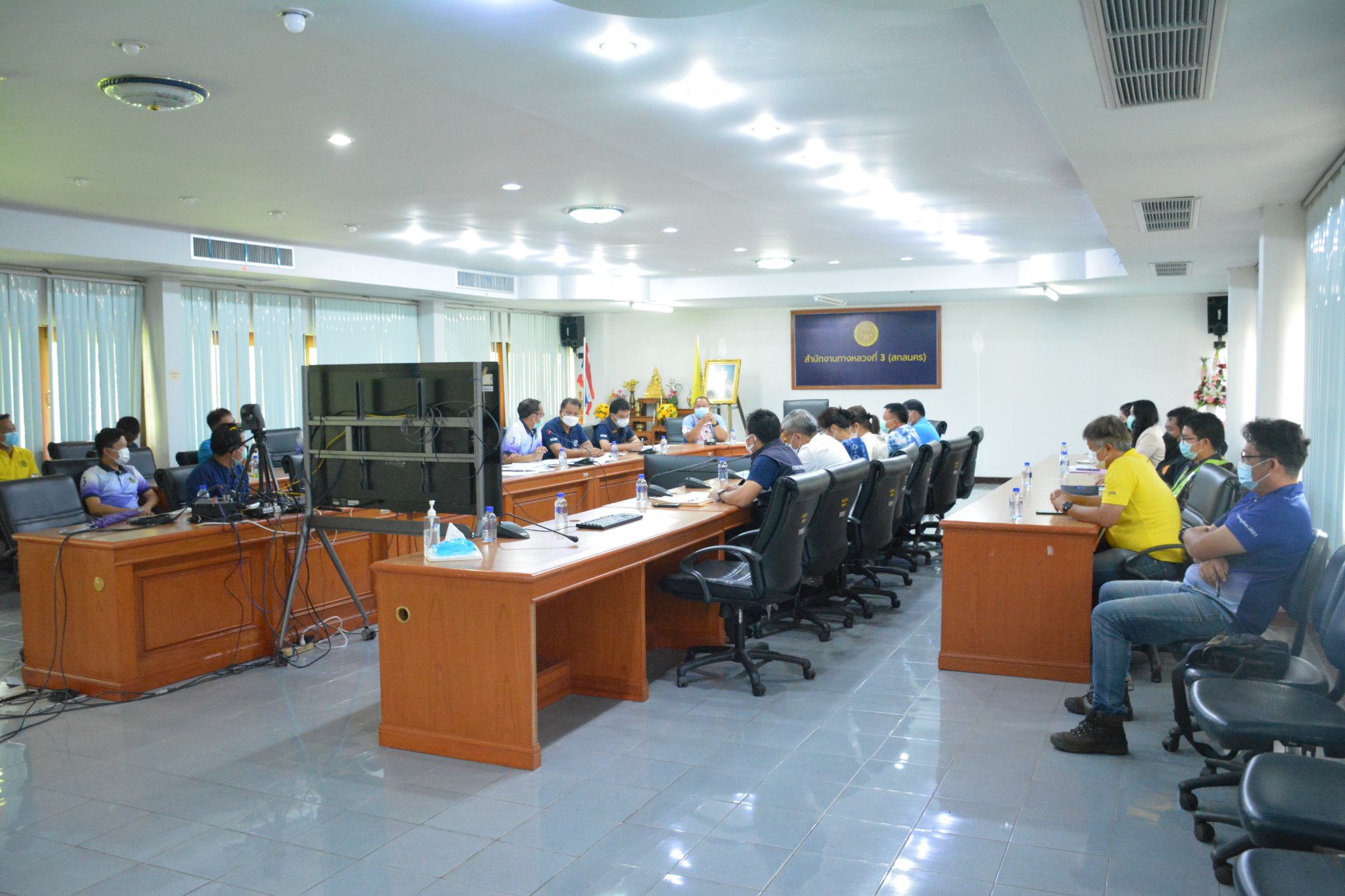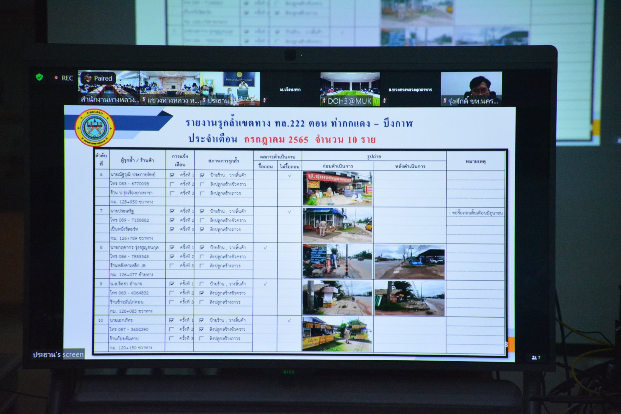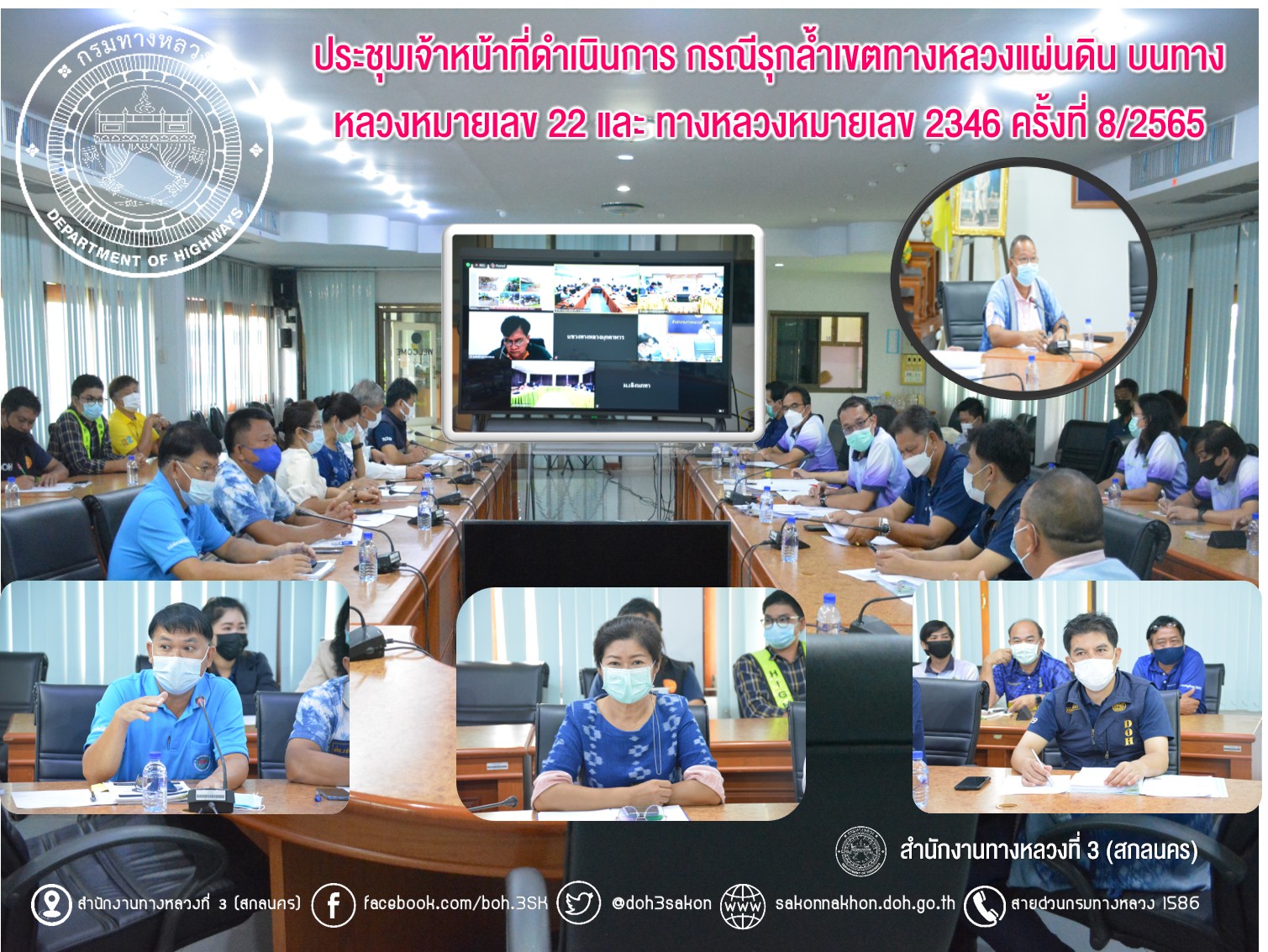 วันที่ 22 กรกฎาคม 2565 เวลา 09.30 น. นายวุฒิพงศ์ คำภูแสน รองผู้อำนวยการสำนักงานทางหลวงที่ 3 ตำแหน่งที่ 1 รักษาราชการแทน ผู้อำนวยการสำนักงานทางหลวงที่ 3 ประธาน ประชุมเจ้าหน้าที่ดำเนินการกรณีรุกล้ำเขตทางหลวงแผ่นดิน ครั้งที่ 8/2565 ของแขวงทางหลวงในสังกัด กรณีรุกล้ำเขตทางหลวงหมายเลข 22 สายอุดรธานี – สกลนคร และทางหลวงหมายเลข 2346 ตอน นาหว้า-ดงขวาง มีนางนภาพิศ สุวรรณศรี ผู้อำนวยการส่วนบริหาร นายอำนาจ สาไชยันต์ ผู้อำนวยการส่วนเทคโนโลยีสารสนเทศ นายวีรวัฒน์ บุ่งนาแซง นิติกรปฎิบัติการ ผู้อำนวยการแขวงทางหลวง รองผู้อำนวยการแขวง ทางหลวงในสังกัด ร่วมประชุม ณ ห้องประชุมทวีพัฒน์ ตินะมาส ในการประชุมครั้งนี้มีเจ้าหน้าที่แขวงทางหลวง หัวหน้าหมวดทางหลวงในสังกัด ที่เกี่ยวข้องร่วมประชุมผ่านระบบ Zoom Cloud Meeting ของสำนักงานทางหลวงที่ 3 (สกลนคร)