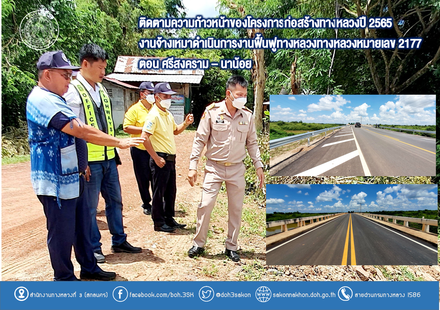 วันที่ 25 กรกฎาคม 2565เวลา 10.00น.นายวุฒิพงศ์ คำภูแสน รองผู้อำนวยการสำนักงานทางหลวงที่ 3ประธานกรรมการตรวจรับพัสดุ พร้อมคณะกรรมการตรวจรับพัสดุ ลงพื้นที่ตรวจรับงานโครงการก่อสร้างทางหลวง เลขที่สัญญา นพ.5/2565 งวดที่ 3(สุดท้าย) งานจ้างเหมาดำเนินการงานฟื้นฟูทางหลวงทางหลวงหมายเลข 2177ตอน ศรีสงคราม – นาน้อย ห้างหุ้นส่วนจำกัด อภิษฎาคอนส์ เป็นผู้รับจ้าง