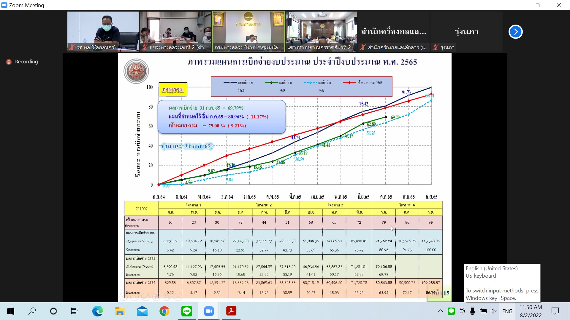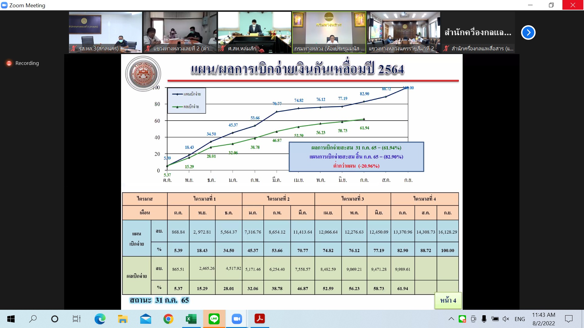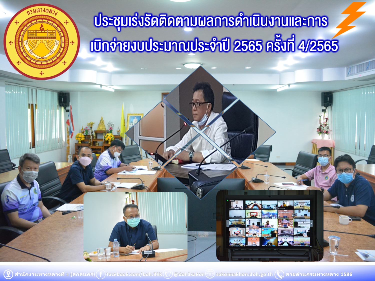 วันที่ 2 สิงหาคม 2565 เวลา 11.00 นายสราวุธ ทรงศิวิไล อธิบดีกรมทางหลวงเป็นประธาน ประชุมเร่งรัดติดตามผลการดำเนินงานและการเบิกจ่ายเงินงบประมาณประจำปี พ.ศ.2565 ครั้งที่ 4/2565 ของกรมทางหลวง โดยผ่านระบบ Zoom Cloud Meeting จากห้องประชุมมนัส คอวนิช กรมทางหลวง สำนักงานทางหลวงที่ 3 (สกลนคร) โดยนายประวัติ เสวตวงษ์ รองผู้อำนวยการสำนักงานทางหลวงที่ 3 พร้อมด้วยนายพงษ์ศักดิ์ อาจลา ผู้อำนวยการส่วนสำรวจและออกแบบ นางรุ่งดาว ชมพูวิเศษ หัวหน้างานการเงิน และวิศวกรโยธา นายช่างโยธาส่วนแผนงาน เข้าร่วมประชุมผ่านระบบ Zoom Cloud Meeting ณ ห้องประชุมทวีพัฒน์ ตินะมาส ในการประชุมครั้งนี้มีหน่วยงานสังกัดกรมทางหลวง ทั้ง 18 สำนักงานทางหลวง เข้าร่วมประชุมด้วย