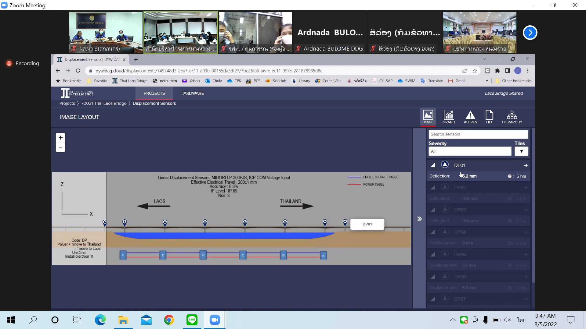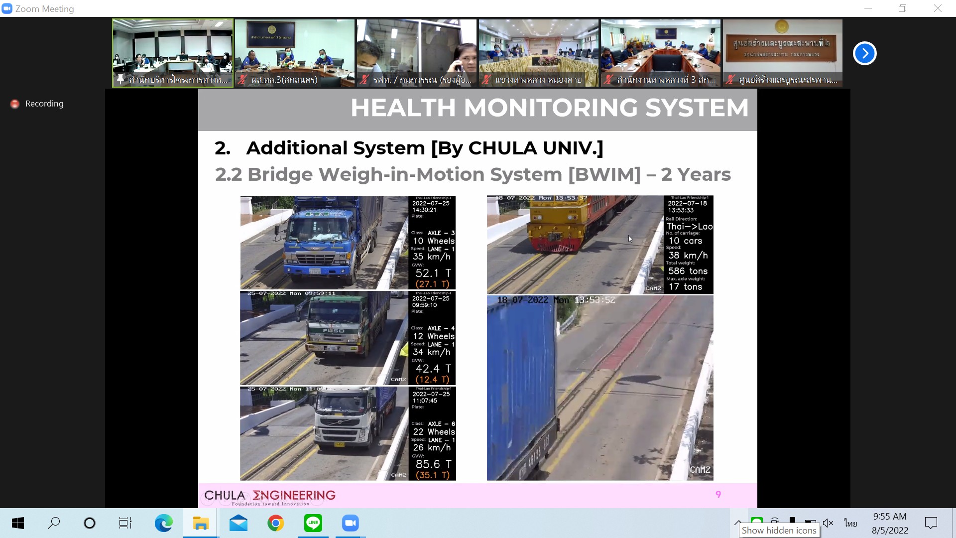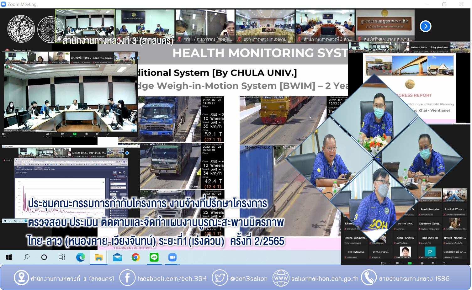 วันที่ 5 สิงหาคม 2565 ณ ห้องประชุมทวีพัฒน์ ตินะมาส สำนักงานทางหลวงที่ 3 (สกลนคร) เวลา 09.30 น.นายพัลลภ จันทร์งามปภากูล ผู้อำนวยการสำนักงานทางหลวงที่ 3 พร้อมด้วยนายวุฒิพงศ์ คำภูแสน รองผู้อำนวยการสำนักงานทางหลวงที่ 3 ตำแหน่งที่1 นายประวัติ เสวตวงษ์ รองผู้อำนวยการสำนักงานทางหลวงที่ 3 ตำแหน่งที่2 นายพงษ์ศักดิ์ อาจลา ผู้อำนวยการส่วนสำรวจและออกแบบ นายอำนาจ สาไชยันต์ ผู้อำนวยการส่วนเทคโนโลยีสารสนเทศ และนายธนพนธ์ กิตติธรรม นายช่างโยธาชำนาญงาน เข้าร่วมประชุมคณะกรรมการกำกับโครงการ งานจ้างที่ปรึกษาโครงการตรวจสอบ ประเมิน ติดตามและจัดทำแผนงานบูรณะสะพานมิตรภาพไทย-ลาว (หนองคาย-เวียงจันทน์) ระยะที่1(เร่งด่วน) ครั้งที่ 2/2565 โดยผ่านระบบ Zoom Cloud Meeting จากห้องประชุมชั้น 5 สำนักบริหารโครงการทางหลวงระหว่างประเทศ กรมทางหลวง ในการประชุมครั้งนี้มีคณะกรรมการฯจากสาธารณรัฐประชาธิปไตยประชาชนลาว เข้าร่วมประชุมด้วย