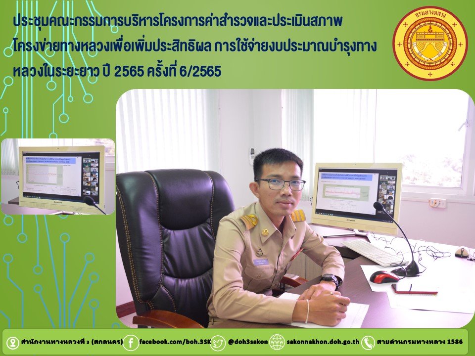 วันที่ 15 กรกฎาคม 2565 เวลา 10.30 น. นายธนากรณ์ ติยะบุตร วิศวกรโยธาปฏิบัติการ เข้าร่วมประชุม?คณะกรรมการบริหารโครงการค่าสำรวจและประเมินสภาพโครงข่ายทางหลวงเพื่อเพิ่มประสิทธิผล การใช้จ่ายงบประมาณบำรุงทางหลวงในระยะยาว ปี 2565 ครั้งที่ 6/2565 โดยผ่านระบบ Zoom Cloud Meeting ณ ห้องประชุม 1 ชั้น 3 สำนักบริหารบำรุงทาง กรมทางหลวง มีนายพิชญ รุ่งเรืองวิโรจน์ ประธานคณะกรรมการบริหารโครงการ โครงการค่าสำรวจและประเมินสภาพโครงข่ายทางหลวงฯ