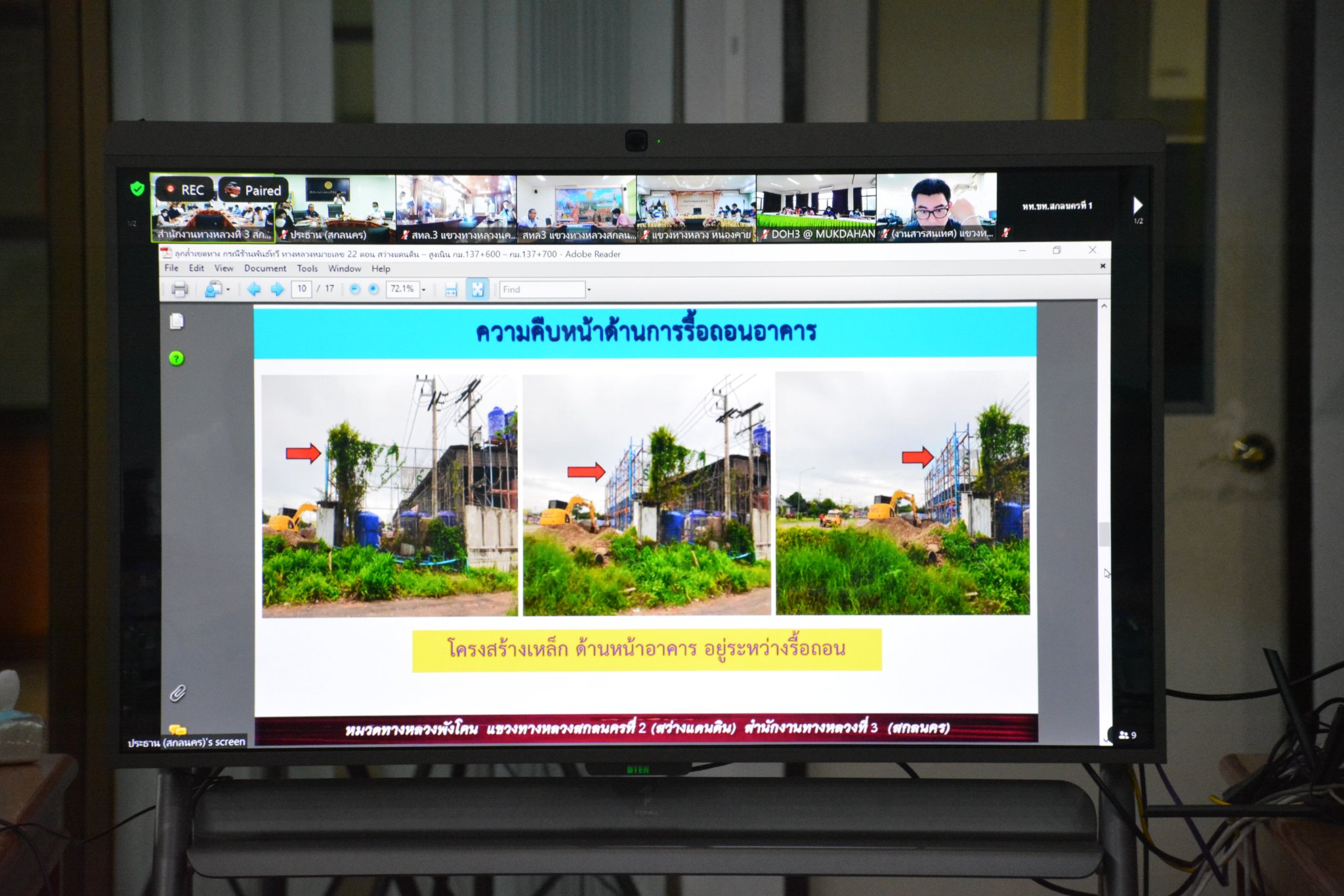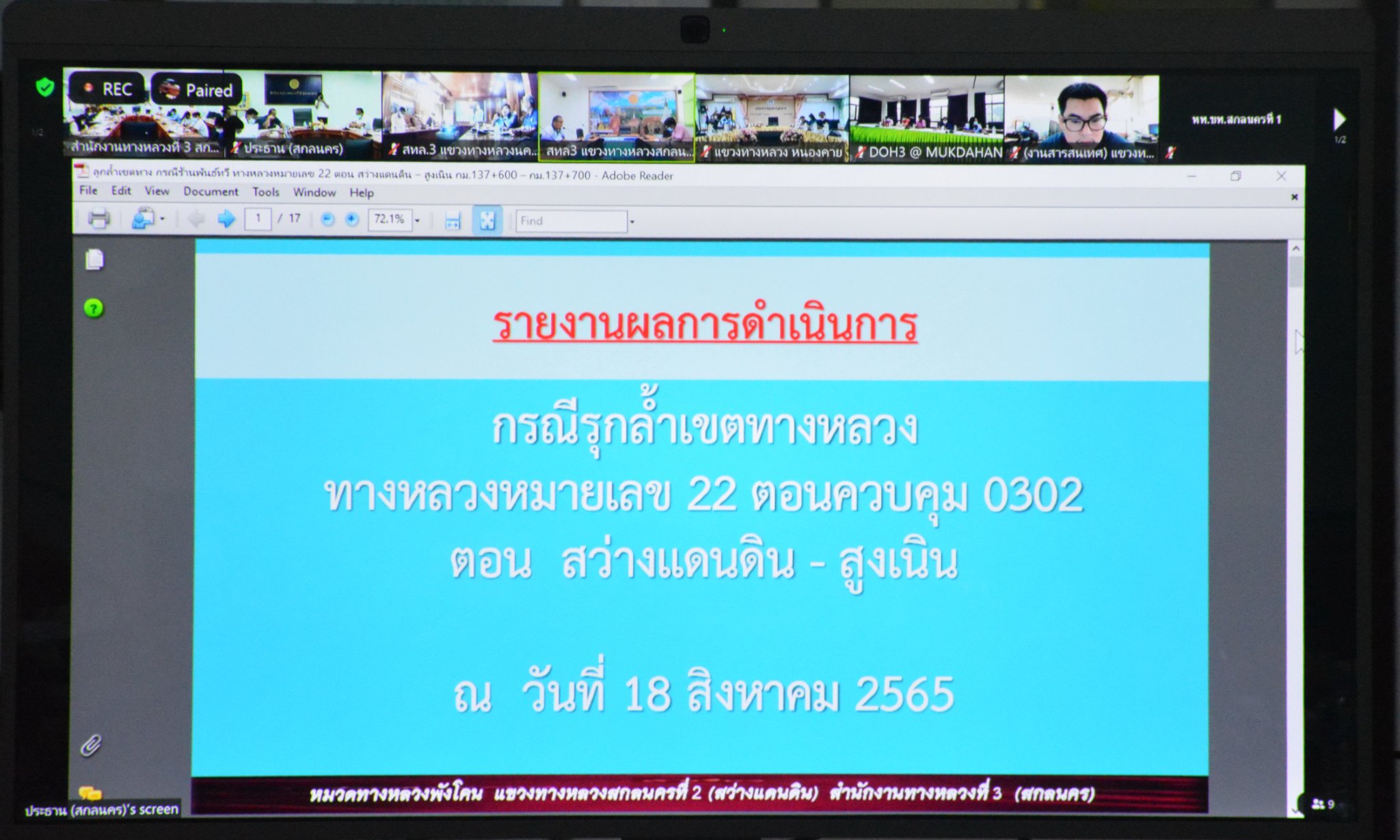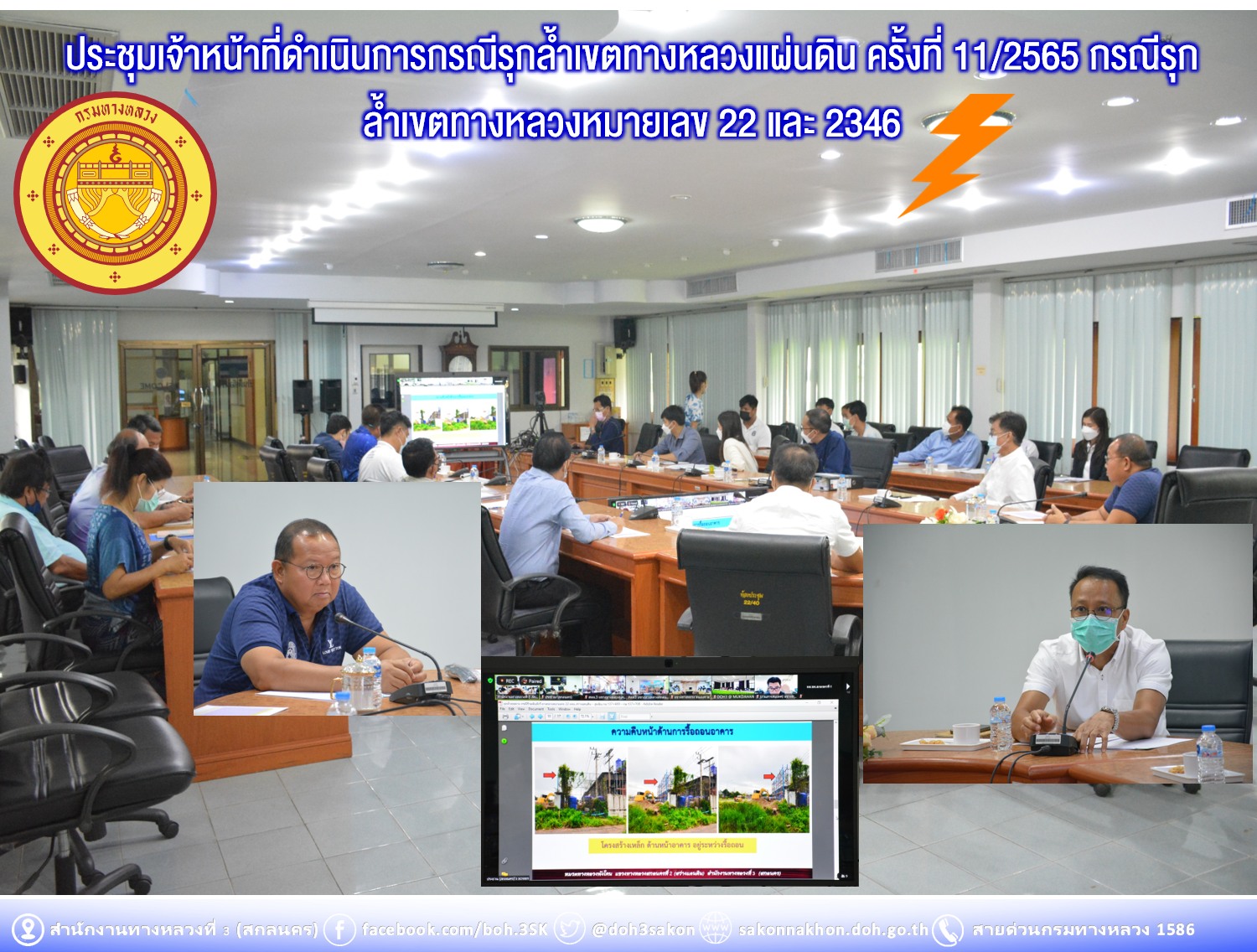 นที่ 19 สิงหาคม 2565 เวลา 09.30 น. นายวุฒิพงศ์ คำภูแสน รองผู้อำนวยการสำนักงานทางหลวงที่ 3 ตำแหน่งที่ 1 พร้อมด้วยนายประวัติ เสวตวงษ์รองผู้อำนวยการสำนักงานทางหลวงที่ 3 ตำแหน่งที่ 2 ประชุมเจ้าหน้าที่ดำเนินการกรณีรุกล้ำเขตทางหลวงแผ่นดิน ครั้งที่ 11/2565 ของแขวงทางหลวงในสังกัด กรณีรุกล้ำเขตทางหลวงหมายเลข 22 สายอุดรธานี – สกลนคร และทางหลวงหมายเลข 2346 ตอน นาหว้า-ดงขวาง มีนายเกรียงศักดิ์ ตันปิยะกุล ผู้อำนวยการแขวงทางหลวงมุกดาหาร นางนภาพิศ สุวรรณศรี ผู้อำนวยการส่วนบริหาร นายหนูกาญ เจริญไชย ผู้อำนวยการส่วนกฎหมายและกรรมสิทธิ์ที่ดิน นายอำนาจ สาไชยันต์ ผู้อำนวยการส่วนเทคโนโลยีสารสนเทศ นายวีรวัฒน์ บุ่งนาแซง นิติกรปฎิบัติการ ผู้อำนวยการแขวงทางหลวง รองผู้อำนวยการแขวงทางหลวงในสังกัด ร่วมประชุม ณ ห้องประชุมทวีพัฒน์ ตินะมาส ในการประชุมครั้งนี้มีเจ้าหน้าที่แขวงทางหลวง หัวหน้าหมวดทางหลวงในสังกัด ที่เกี่ยวข้องร่วมประชุมผ่านระบบ Zoom Cloud Meeting ของสำนักงานทางหลวงที่ 3 (สกลนคร)
