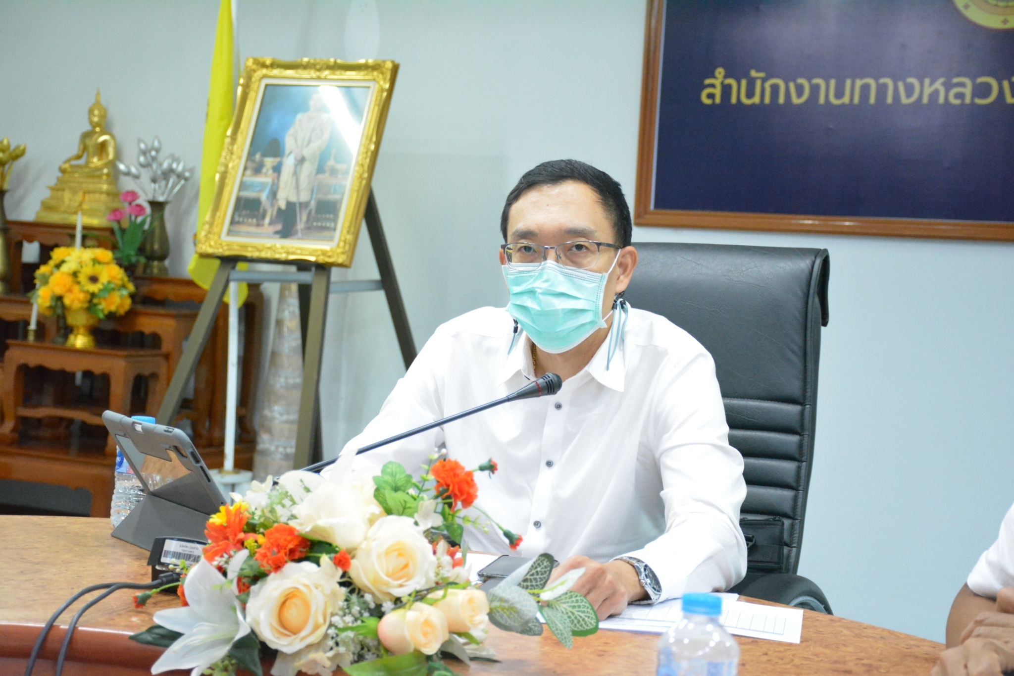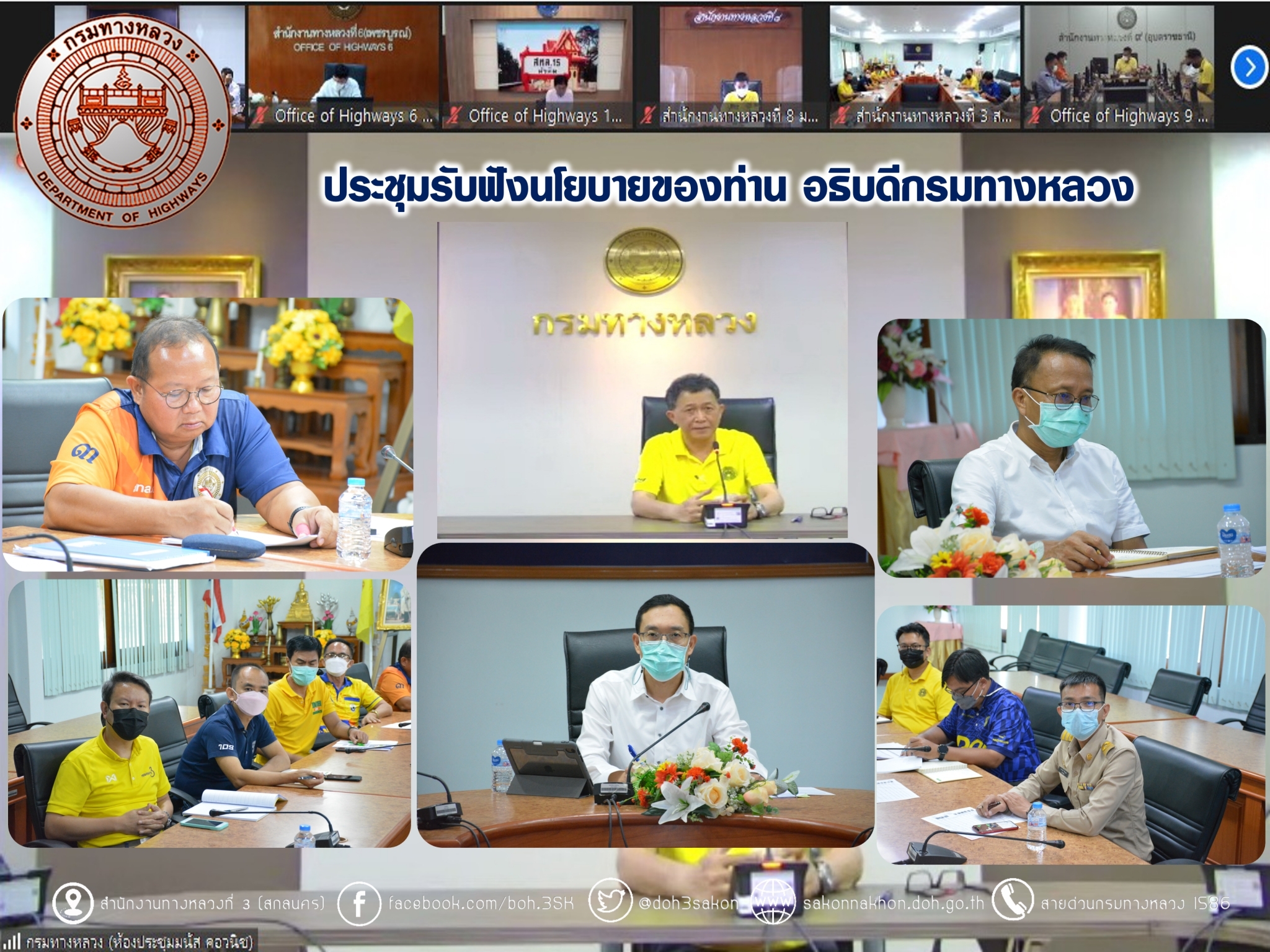 วันที่ 29 สิงหาคม 2565 เวลา 16.00 น. นายพัลลภ จันทร์งามปภากูล ผู้อำนวยการสำนักงานทางหลวงที่ 3 พร้อมด้วยนายวุฒิพงศ์ คำภูแสน รองผู้อำนวยการสำนักงานทางหลวงที่ 3 ตำแหน่งที 1 นายประวัติ เสวตวงษ์ รองผู้อำนวยการสำนักงานทางหลวงที่ 3 ตำแหน่งที่ 2 นายชินชพัทธ์ มุลทาทอง ผู้อำนวยการส่วนแผนงาน นายรณฤทธิ์ ภูผิวเดือน ผู้อำนวยการส่วนควบคุมงานก่อสร้าง นายพงษ์ศักดิ์ อาจลา ผู้อำนวยการส่วนสำรวจและออกแบบ และวิศวกรโยธา นายช่างโยธา ส่วนแผนงาน ร่วมประชุมรับฟังนโยบายของกรมทางหลวง โดยผ่านระบบ Zoom Cloud Meeting จากห้องประชุมมนัส คอวนิช กรมทางหลวง มีนายสราวุธ ทรงศิวิไล อธิบดีกรมทางหลวง เป็นประธาน การประชุมในครั้งนี้มีหน่วยสังกัดกรมทางหลวงทั้ง 18 สำนักงานทางหลวงเข้าร่วมประชุม