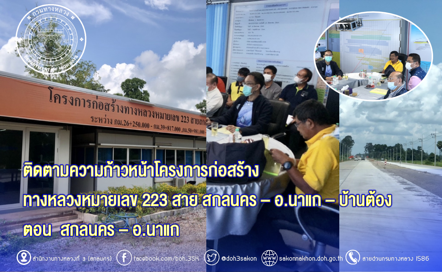 วันที่ 14 กันยายน 2565 เวลา10.20น. นายนรินทร์ ศรีสมพันธุ์ วิศวกรใหญ่ด้านวางแผนและวางโครงการก่อสร้าง ประธานกรรมการตรวจรับพัสดุ พร้อมด้วยนายพัลลภ จันทร์งามปภากูล ผู้อำนวยการสำนักงานทางหลวงที่ 3 กรรมการตรวจรับพัสดุ และคณะกรรมการตรวจรับพัสดุ ลงพื้นที่ติดตามความก้าวหน้าของโครงการก่อสร้าง งานจ้างเหมาแผนงานบูรณาการพัฒนาพื้นที่ระดับภาค ทางหลวงหมายเลข 223 สาย สกลนคร – อ.นาแก – บ้านต้อง ตอน สกลนคร – อ.นาแก ระหว่าง กม.26+250-กม.39+817,กม.50+981-กม.53+164 ระยะทาง 15.750 กม. วงเงินงบประมาณ 599,292,000 บาท (ตรวจรับงวดที่ 6 ) เพื่อให้การดำเนินงานก่อสร้างทางหลวงแผ่นดินได้ตามแบบมาตรฐานของกรมทางหลวง กระทรวงคมนาคม โดยมี บริษัท ซอย์ซัพพอร์ติ้ง จำกัด เป็นผู้รับจ้าง พร้อมรับฟังบรรยายสรุปผลการดำเนินงานของโครงการฯ ณ ห้องประชุมสำนักงานชั่วคราวของโครงการฯ ควบคุมงานก่อสร้างโดยสำนักก่อสร้างทางที่ 3 กรมทางหลวง กระทรวงคมนาคม