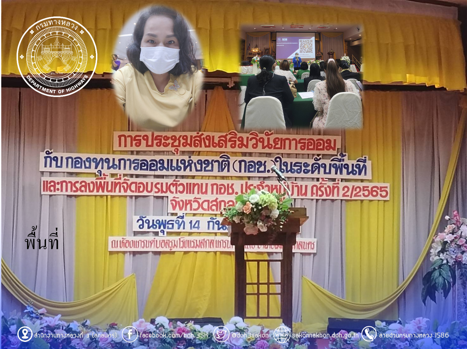 วันที่ 14 ก.ย.65 เวลา 08.30-12.00 น. นางพวงเพชร เบญจมาศ หัวหน้างานสารบรรณ เป็นตัวแทน สำนักงานทางหลวงที่ 3 (สกลนคร) เข้าร่วมประชุมส่งเสริมวินัยการออมกับกองทุนการออมแห่งชาติ (กอช.)ในระดับพื้นที่ ณ ห้องประชุมแกนด์บอลลูน โรงแรมสกลแกรนด์พาเลซ จ.สกลนคร