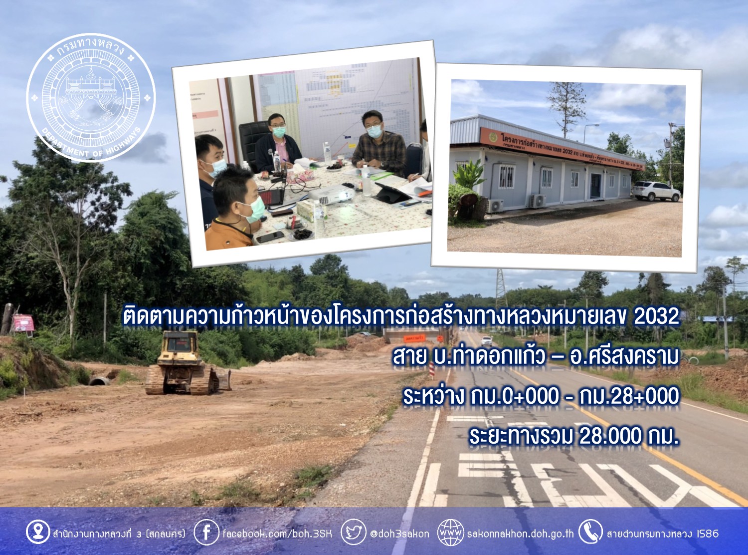 วันที่ 20 กันยายน 2565 เวลา10.00 นายไพฑูรย์ รองอธิบดีกรมทางหลวง ฝ่ายบริหาร ประธานกรรมการตรวจรับพัสดุ มอบหมายให้นายพัลลภ จันทร์งามปภากูล ผู้อำนวยการสำนักงานทางหลวงที่ 3 นายเดชา พรวนพิทักษ์ ผู้อำนวยการแขวงทางหลวงนครพนม กรรมการตรวจรับพัสดุ และคณะกรรมการตรวจรับพัสดุ ลงพื้นที่ติดตามความก้าวหน้าของโครงการก่อสร้างทางหลวงหมายเลข 2032 สาย บ.ท่าดอกแก้ว – อ.ศรีสงคราม ระหว่าง กม.0+000 - กม.28+000 ระยะทางรวม 28.000 กม. วงเงินงบประมาณ 979,437,479 บาท (ตรวจรับงานงวดที่ 3) เพื่อให้การดำเนินงานก่อสร้างทางหลวงแผ่นดินได้ตามแบบมาตรฐานของกรมทางหลวง กระทรวงคมนาคม มีบริษัท บัญชากิจ จำกัด เป็นผู้รับจ้าง พร้อมรับฟังบรรยายสรุปผลการดำเนินงานของโครงการฯ ณ ห้องประชุมสำนักงานชั่วคราวของโครงการฯ ควบคุมการก่อสร้างโดยสำนักก่อสร้างทางที่ 2 กรมทางหลวง