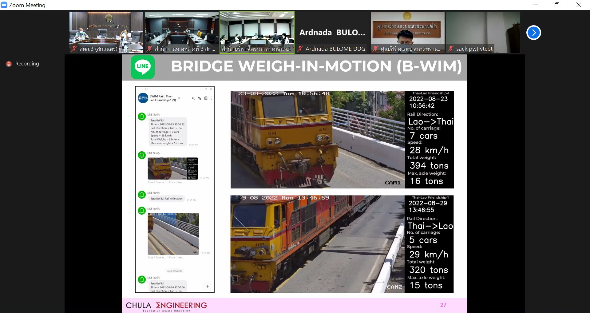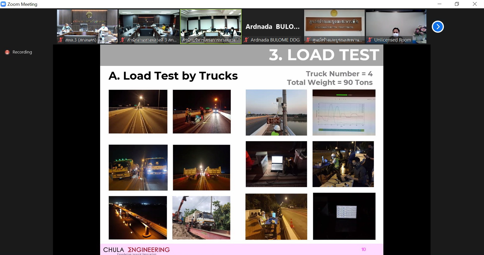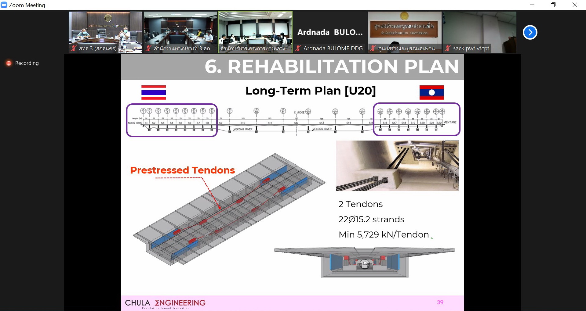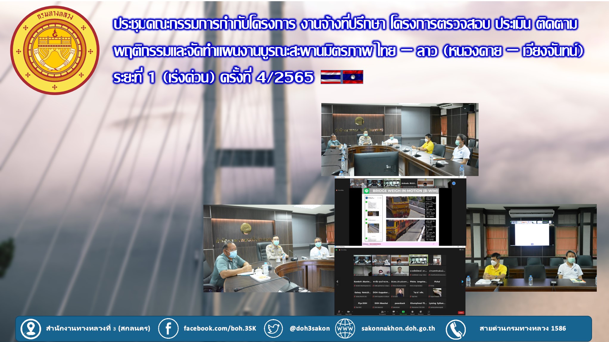 วันที่ 3 ตุลาคม 2565 เวลา 13.30 น. นายพัลลภ จันทร์งามปภากูล พร้อมด้วยนายวุฒิพงศ์ คำภูแสน รองผู้อำนวยการสำนักงานทางหลวงที่ 3 ตำแหน่งที่ 1 นายประวัติ เสวตวงษ์ รองผู้อำนวยการสำนักงานทางหลวงที่ 3 ตำแหน่งที่ 2 นายชินนพัทธ์ มุลทาทอง ผู้อำนวยการส่วนแผนงาน และนายธนพนธ์ กิตติธรรม นายช่างโยธาชำนาญงาน ส่วนแผนงาน ร่วมประชุมคณะกรรมการกำกับโครงการ งานจ้างที่ปรึกษา โครงการตรวจสอบ ประเมิน ติดตามพฤติกรรมและจัดทำแผนงานบูรณะสะพานมิตรภาพ ไทย – ลาว (หนองคาย–เวียงจันทน์) ระยะที่ 1 (เร่งด่วน) ครั้งที่ 4/2565 โดยผ่านระบบ Zoom Cloud Meeting ณ ห้องประชุมทวีพัฒน์ ตินะมาส ชั้น 3 อาคารหลังใหม่