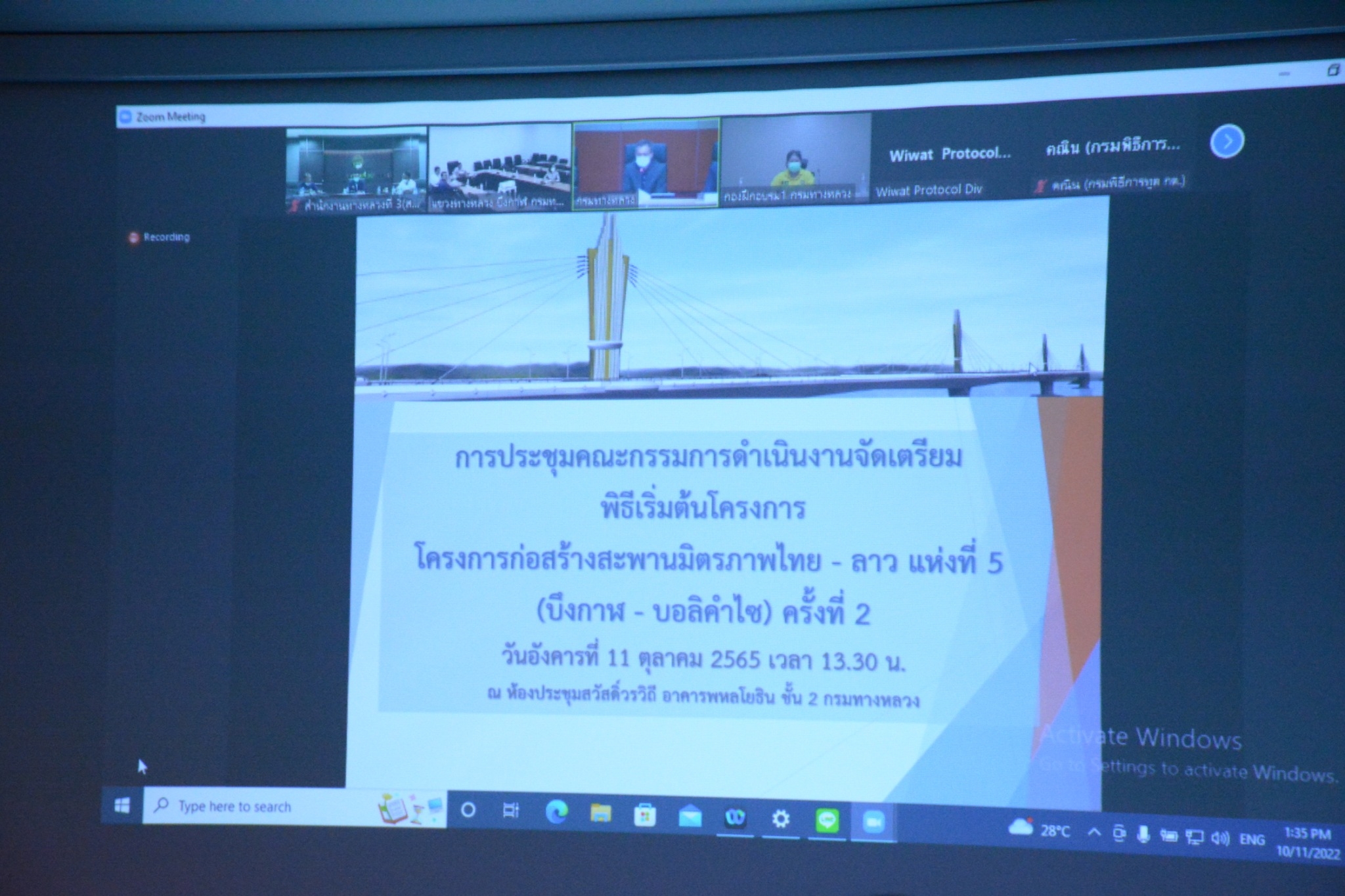 วันที่ 11 ตุลาคม 2565 เวลา 13.30 น. นายพัลลภ จันทร์งามปภากูล พร้อมด้วยนายวุฒิพงศ์ คำภูแสน รองผู้อำนวยการสำนักงานทางหลวงที่ 3 ตำแหน่งที่ 1 นายประวัติ เสวตวงษ์ รองผู้อำนวยการสำนักงานทางหลวงที่ 3 ตำแหน่งที่ 2 นายชินนพัทธ์ มุลทาทอง ผู้อำนวยการส่วนแผนงาน นายพงษ์ศักดิ์ อาจลา ผู้อำนวยการส่วนสำรวจและออกแบบ นางนภาพิศ สุวรรณศรี ผู้อำนวยการส่วนบริหารงานทั่วไป นายอำนาจ สาไชยันต์ ผู้อำนวยการส่วนเทคโนโลยีสารสนเทศ และนายผดุง ศรีโคตา วิศวกรโยธาปฏิบัติการ ร่วมประชุมคณะกรรมการดำเนินงานจัดเตรียมพิธีเริ่มต้นโครงการก่อสร้างสะพานมิตรภาพไทย-ลาว แห่งที่ 5 (บึงกาฬ – บอลิคำไซ) ครั้งที่ 2 มีนายมนตรี เดชาสกุลสม รองอธิบดีกรมทางหลวง ฝ่ายวิชาการ เป็นประธาน ประชุมโดยผ่านระบบ Zoom Cloud Meeting จากห้องประชุมสวัสดิ์วรวิถี ชั้น 2 อาคารพหลโยธิน กรมทางหลวง กรุงเทพมหานคร