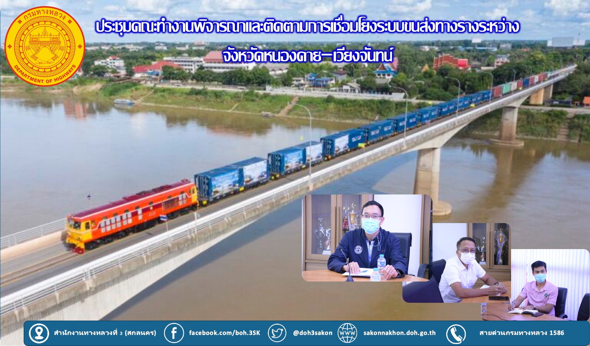 วันที่ 11 ตุลาคม 2565 เวลา 15.00 น. นายพัลลภ จันทร์งามปภากูล ผู้อำนวยการสำนักงานทางหลวงที่ 3 พร้อมด้วย นายประวัติ เสวตวงษ์ รองผู้อำนวยการสำนักงานทางหลวงที่ 3 และนายชินนพัทธ์ มุลทาทอง ผู้อำนวยการส่วนแผนงาน ร่วมประชุมคณะทำงานพิจารณาและติดตามการเชื่อมโยงระบบขนส่งทางรางระหว่างจังหวัดหนองคาย–เวียงจันทน์ โดยผ่านระบบ Zoom Cloud Meeting ณ ห้องประชุมชั้น 2 อาคารหลังใหม่