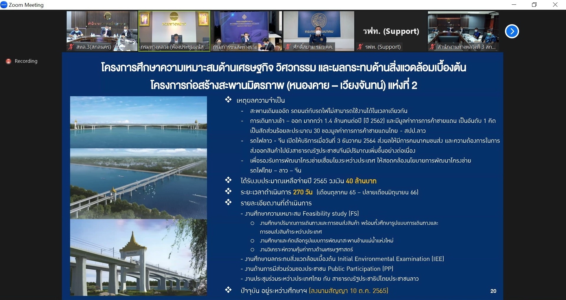 นายสราวุธ ทรงศิวิไล อธิบดีกรมทางหลวง ได้รายงานความก้าวหน้าของโครงการศึกษาความเหมาะสมด้านเศรษฐกิจ วิศวกรรม และผลกระทบสิ่งแวดล้อมเบื้องต้น โครงการก่อสร้างสะพานมิตรภาพ (หนองคาย – เวียงจันทน์) แห่งที่ 2 ซึ่งปัจจุบันอยู่ระหว่างศึกษางาน (ลงนามสัญญา 10 ตุลาคม 2565) ระยะเวลาดำเนินการ 270 วัน ในเดือน ตุลาคม 2565 ถึงปลายเดือน มิถุนายน 2566 ได้รับงบประมาณเหลือจ่ายปี 2565 วงเงิน 40 ล้านบาท ให้ที่ประชุมทราบ