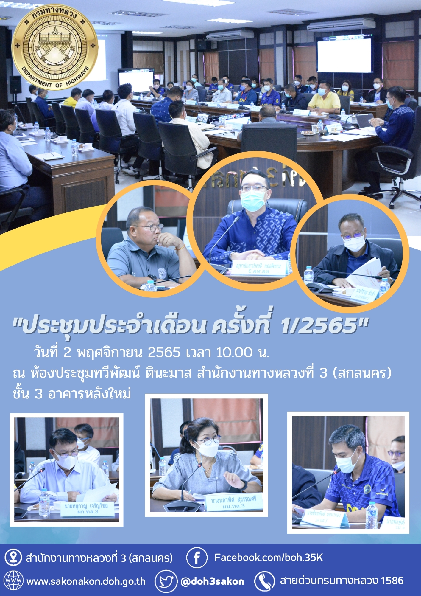 วันที่ 2 พฤศจิกายน 2565 เวลา10.00 น.นายพัลลภ จันทร์งามปภากูล ผู้อำนวยการสำนักงานทางหลวงที่ 3 เป็นประธาน ประชุมประจำเดือนครั้งที่1/2565 มีนายวุฒิพงศ์ คำภูแสน รองผู้อำนวยการสำนักงานทางหลวงที่ 3 ตำแหน่งที่ 1 นายประวัติ เสวตวงษ์ รองผู้อำนวยการสำนักงานทางหลวงที่ 3 ตำแหน่งที่ 2 ผู้อำนวยการแขวงทางหลวง/รองผู้อำนวยการแขวงทางหลวงในสังกัด และผู้อำนวยการส่วน /ฝ่าย / งาน ของสำนักงานทางหลวงที่ 3 (สกลนคร) ร่วมประชุม ณ ห้องประชุมทวีพัฒน์ ตินะมาส ชั้น 3 อาคารหลังใหม่ ส่วนผู้อำนวยการแขวงทางหลวงหนองคาย และผู้อำนวยการแขวงทางหลวงมุกดาหาร ร่วมประชุมผ่านระบบ Zoom Cloud Meeting ของสำนักงานทางหลวงที่ 3 (สกลนคร)