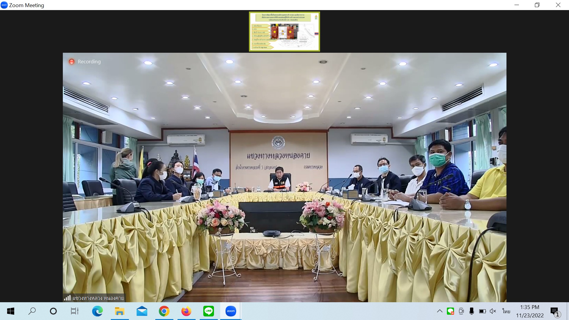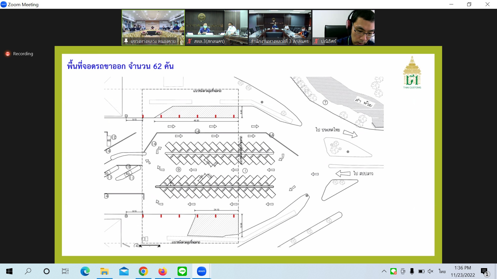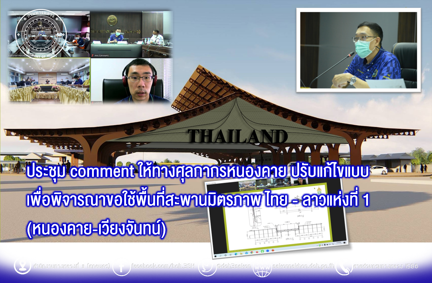 วันที่ 23 พฤศจิกายน 2565 เวลา 13.30 น. นายพัลลภ จันทร์งามปภากูล ผู้อำนวยการสำนักงานทางหลวงที่ 3 เป็นประธาน ประชุม comment ให้ทางศุลกากรหนองคาย ปรับแก้ไขแบบ เพื่อพิจารณาขอใช้พื้นที่สะพานมิตรภาพ ไทย - ลาวแห่งที่ 1 (หนองคาย-เวียงจันทน์) ของศุลกากรหนองคาย ในการประชุมครั้งนี้มีนายประวัติ เสวตวงษ์ รองผู้อำนวยการสำนักงานทางหลวงที่ 3 และนายธนพนธ์ กิตติธรรม นายช่างโยธาชำนาญงาน ส่วนแผนงาน ร่วมประชุม ณ ห้องประชุมทวีพัฒน ตินะมาส ชั้น 3 สำนักงานทางหลวงที่ 3 อาคารหลังใหม่ ส่วนผู้อำนวยการแขวงทางหลวงหนองคาย เจ้าหน้าที่ศุลกากรหนองคาย และเจ้าหน้าที่เกี่ยวข้อง ร่วมประชุมผ่านระบบ Zoom Cloud Meeting ของสำนักงานทางหลวงที่ 3 (สกลนคร)