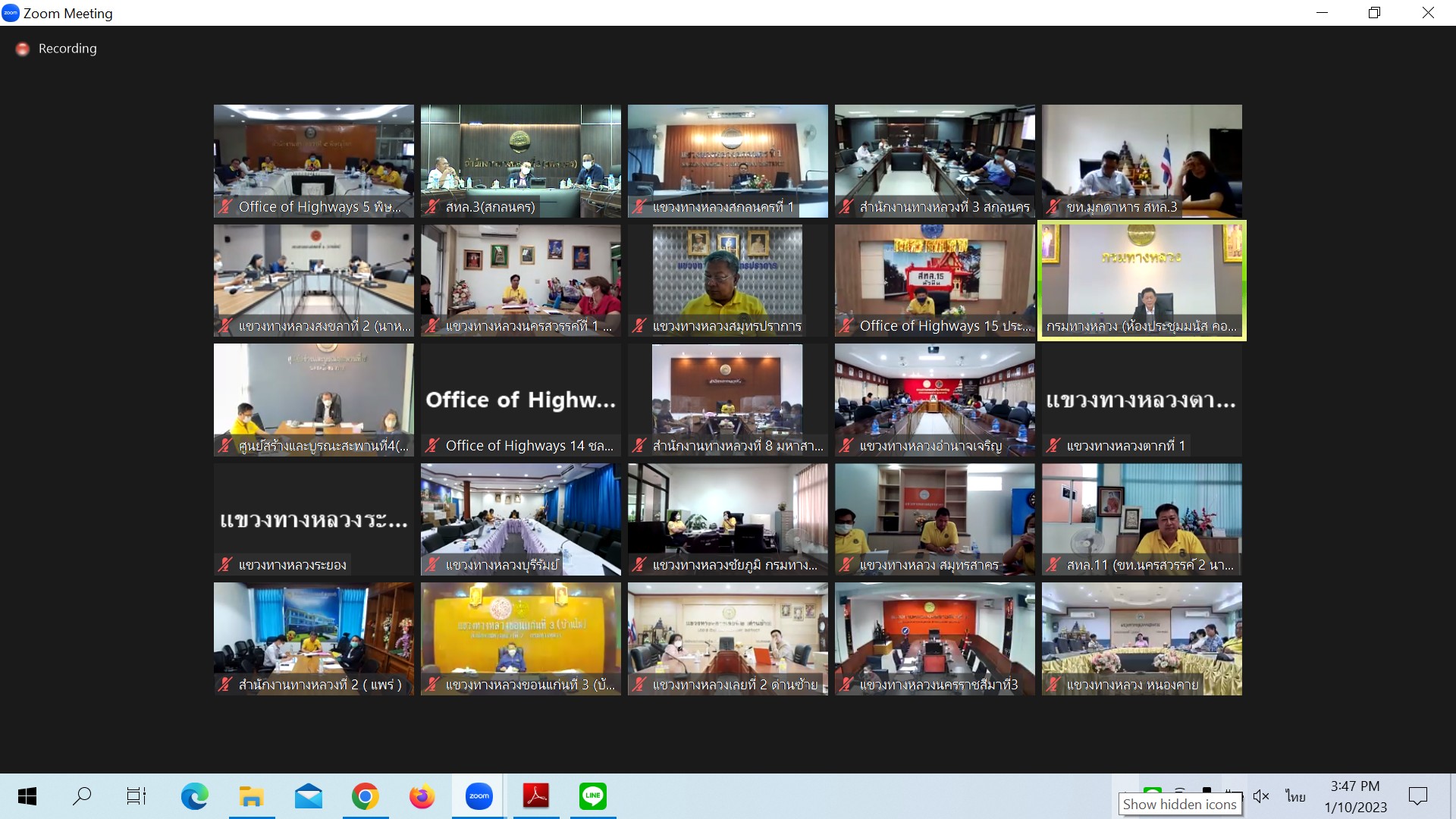สำนักงานทางหลวงที่ 3 (สกลนคร) นายพัลลภ จันทร์งามปภากูล ผู้อำนวยการสำนักงานทางหลวงที่ 3 พร้อมด้วยนายวุฒิพงศ์ คำภูแสน รองผู้อำนวยการสำนักงานทางหลวงที่ 3 ตำแหน่งที 1 นายประวัติ เสวตวงษ์ รองผู้อำนวยการสำนักงานทางหลวงที่ 3 ตำแหน่งที่ 2 นายชินนพัทธ์ มุลทาทอง ผู้อำนวยการส่วนแผนงาน นายหนูกาญ เจริญไชย ผู้อำนวยการส่วนกฎหมายและกรรมสิทธิ์ที่ดิน อำนาจ สาไชยันต์ ผู้อำนวยการส่วนเทคโนโลยีสารสนเทศ และวิศวกรโยธาส่วนแผนงาน ร่วมประชุมเร่งรัดติดตามการดำเนินงานและการเบิกจ่ายงบประมาณประจำปี 2566 ผ่านระบบ Zoom Cloud Meeting ณ ห้องประชุมทวีพัฒน์ ตินะมาส อาคารหลังใหม่