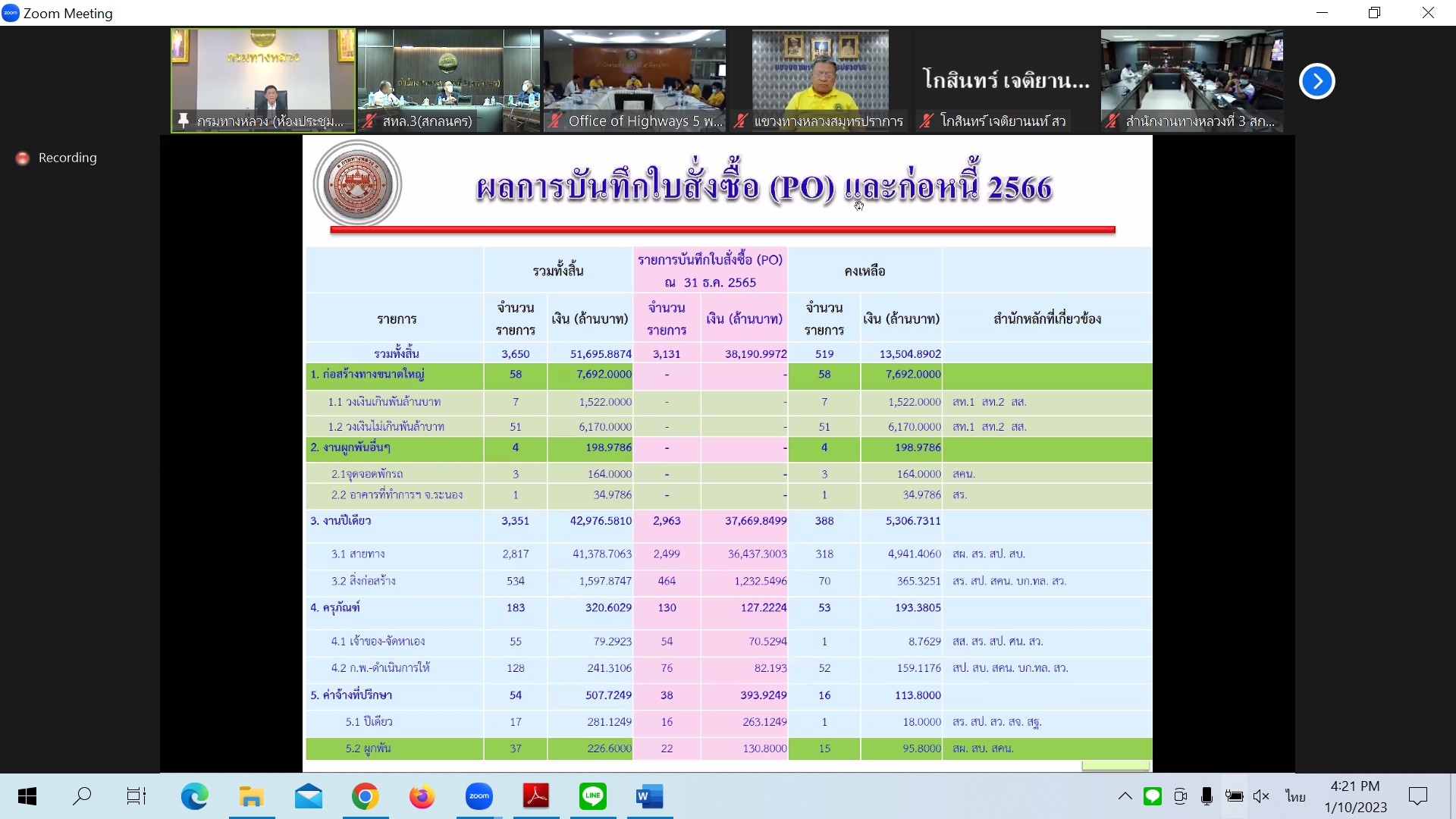 เพื่อติดตามผลการดำเนินงาน และปัญหาอุปสรรคงานก่อสร้างทางหลวงปี2566 ของสำนักงานทางหลวง และศูนย์สร้างทางและสะพาน ในสังกัดกรมทางหลวง ผ่านระบบ Zoom Cloud Meeting จากห้องประชุมมนัส คอวนิช กรมทางหลวง