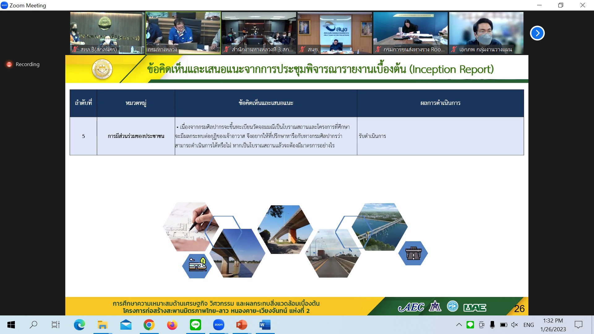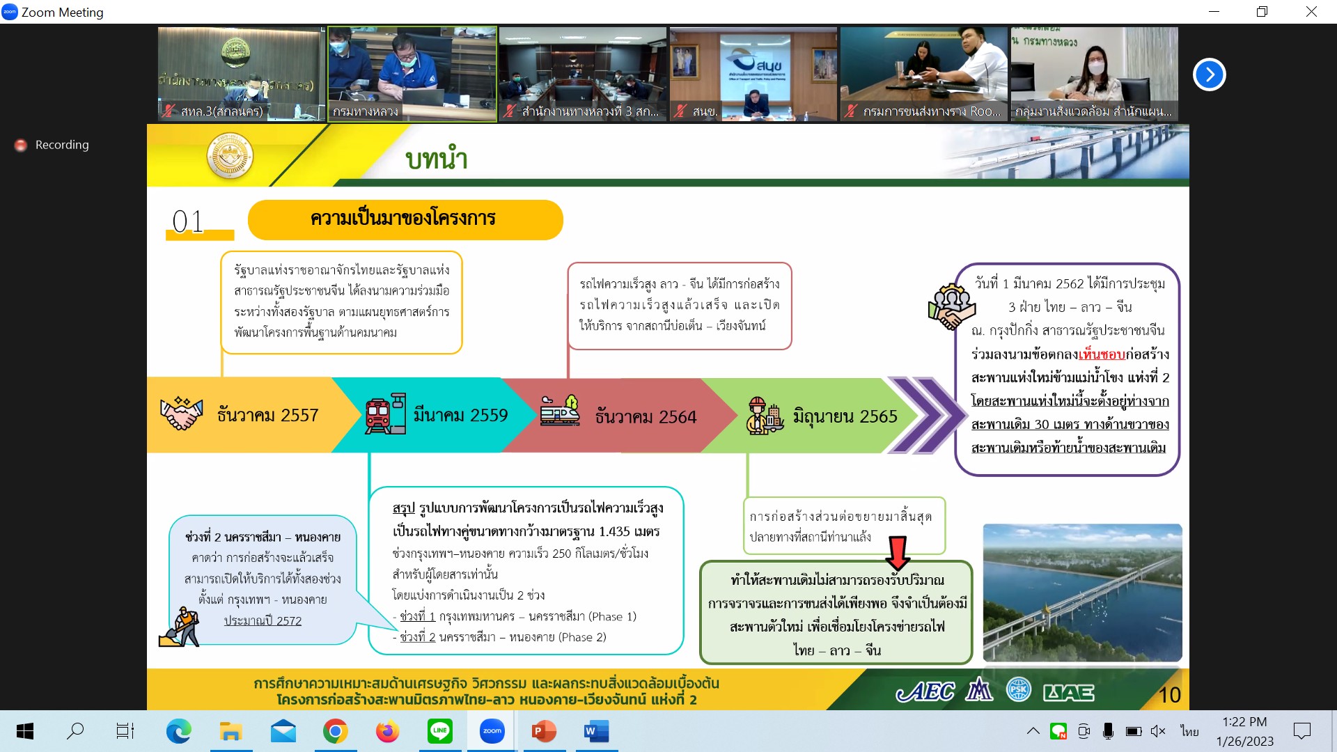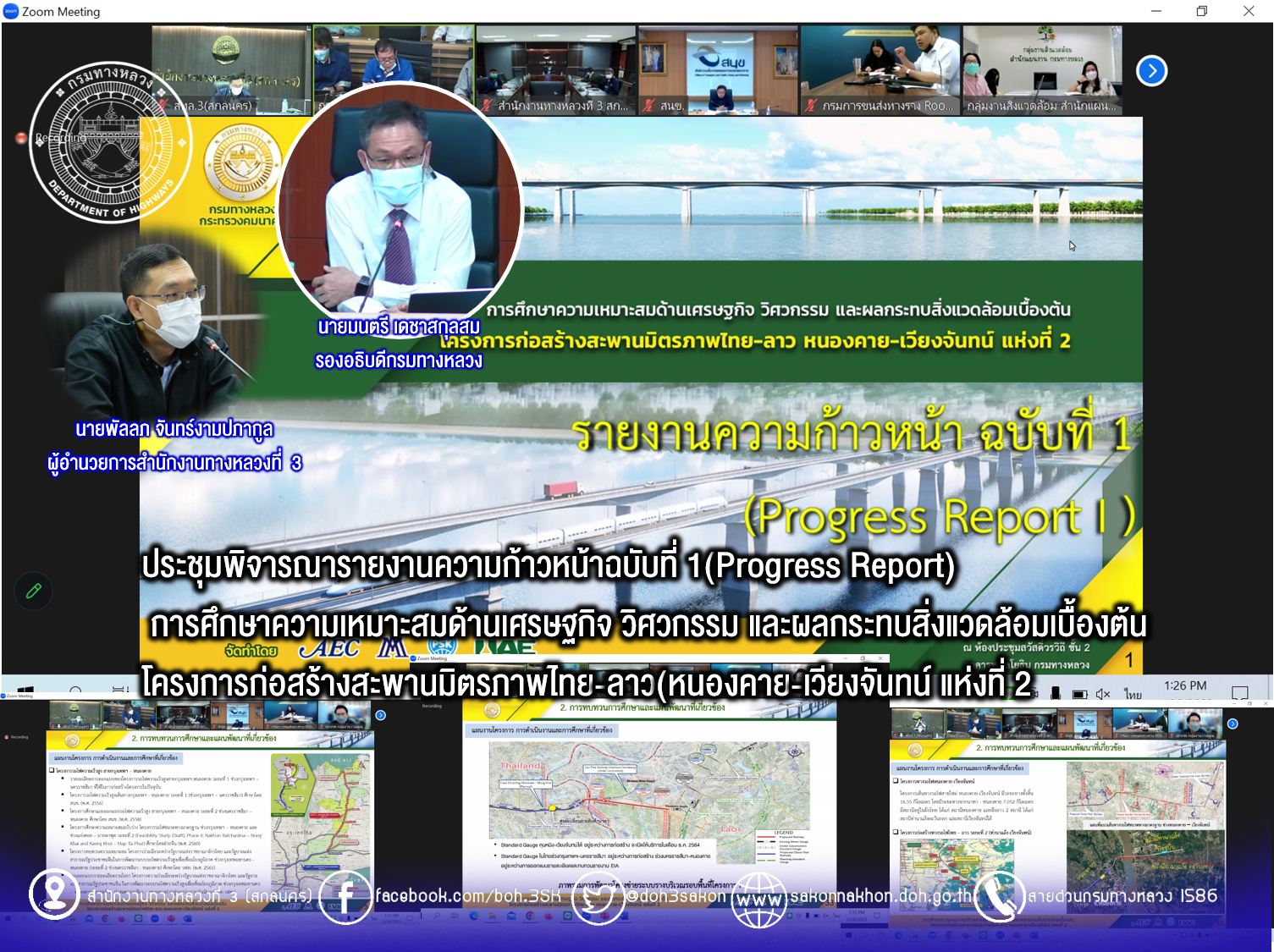 วันที่ 26 มกราคม 2566 เวลา 13.30 น.นายมนตรี เดชาสกุลสม รองอธิบดีกรมทางหลวง ฝ่ายวิชาการเป็นประธาน ประชุมพิจารณารายงานความก้าวหน้าฉบับที่ 1(Progress Report) การศึกษาความเหมาะสมด้านเศรษฐกิจ วิศวกรรม และผลกระทบสิ่งแวดล้อมเบื้องต้น โครงการก่อสร้างสะพานมิตรภาพไทย-ลาว(หนองคาย-เวียงจันทน์ แห่งที่ 2 ผ่านระบบ Zoom Meeting จากห้องประชุมสวัสดิ์วรวิถี ชั้น2 อาคารพหลโยธิน กรมทางหลวง