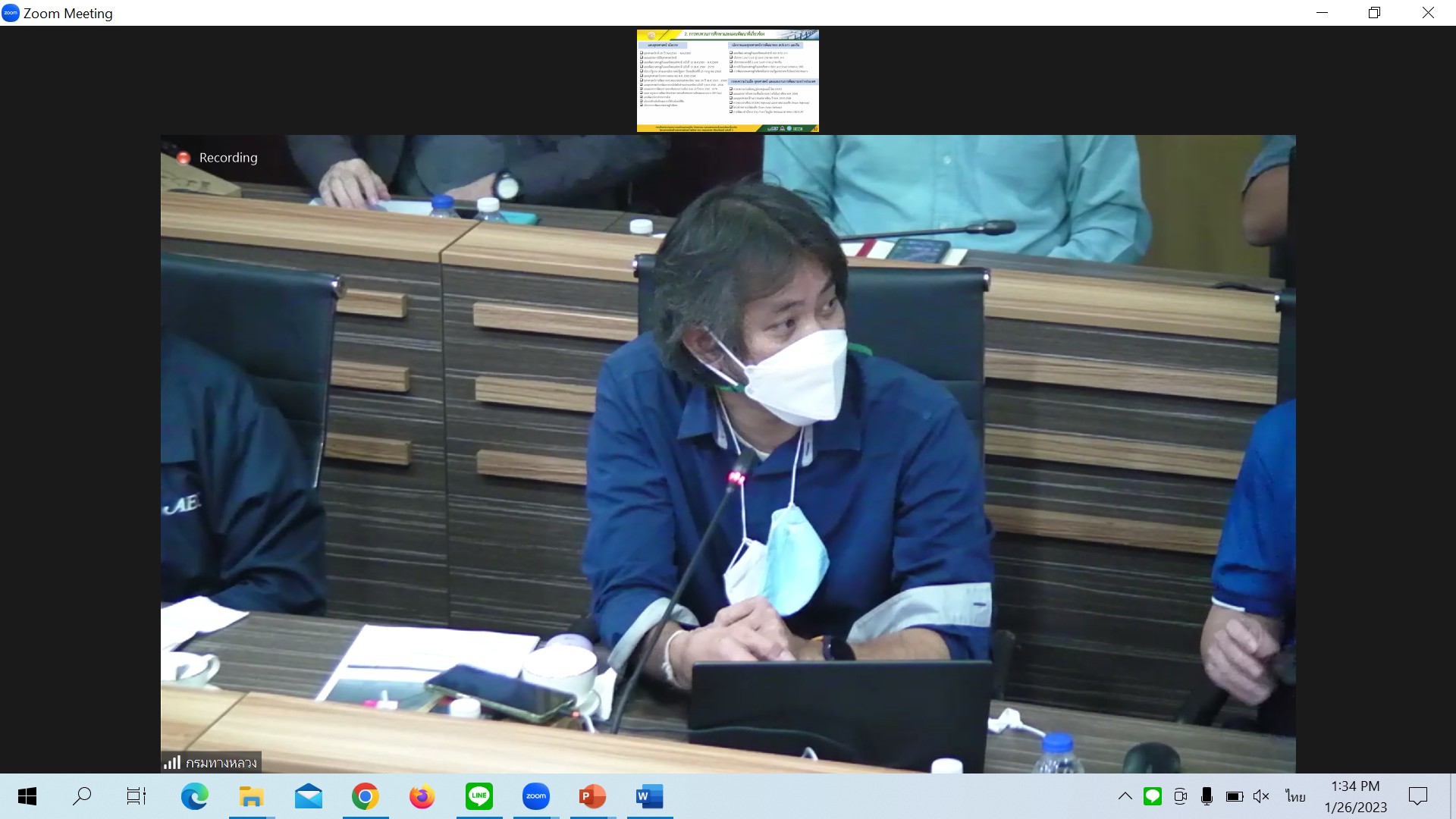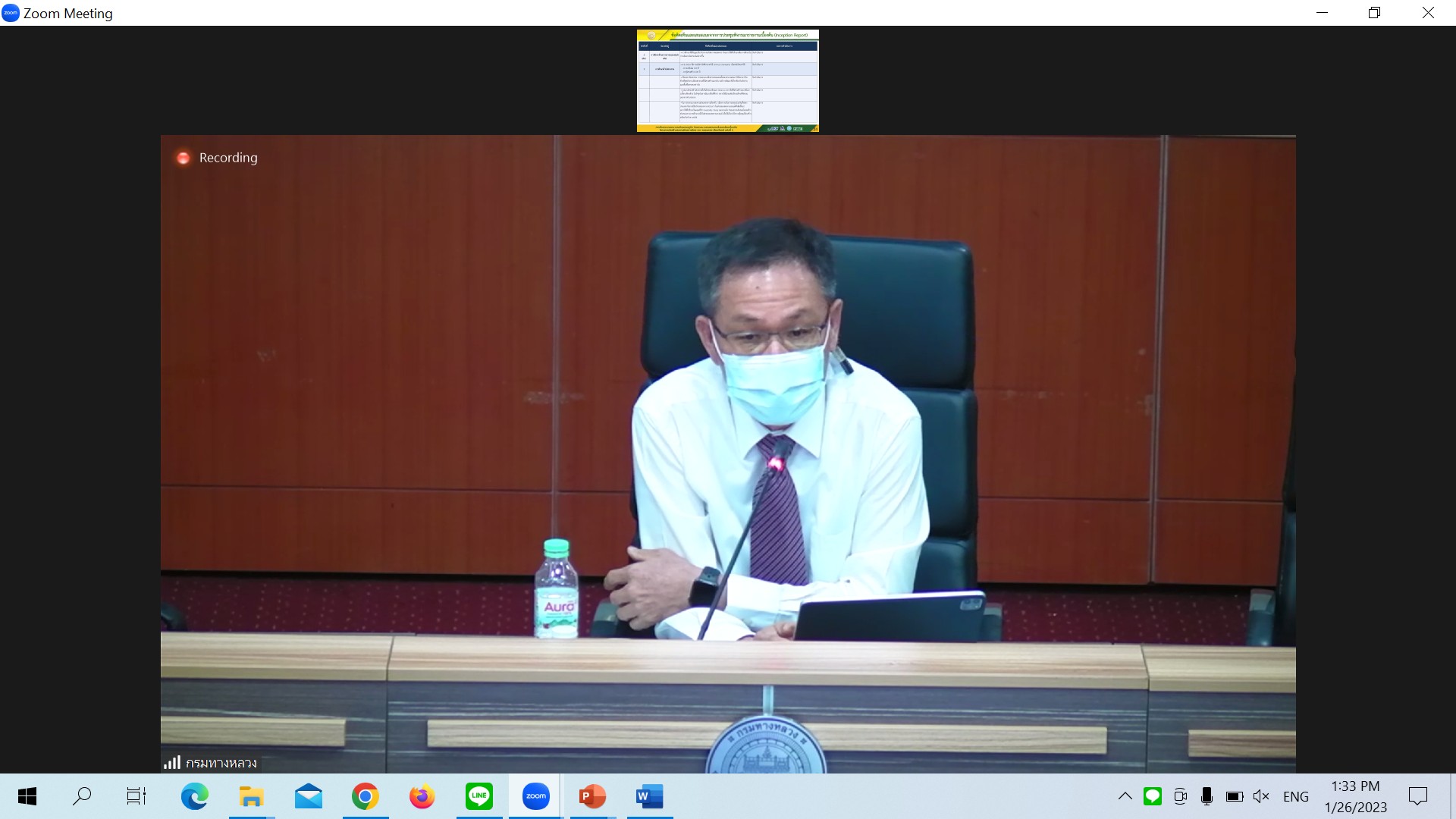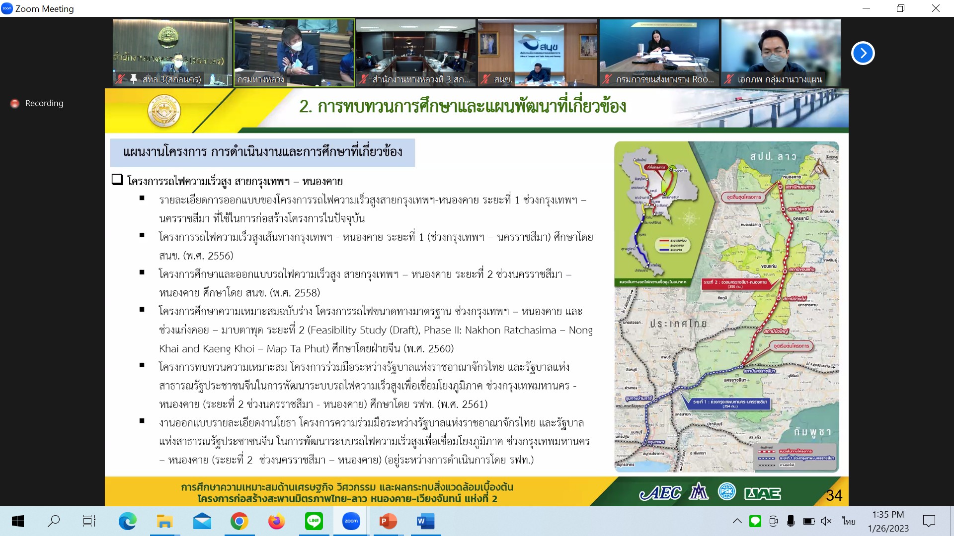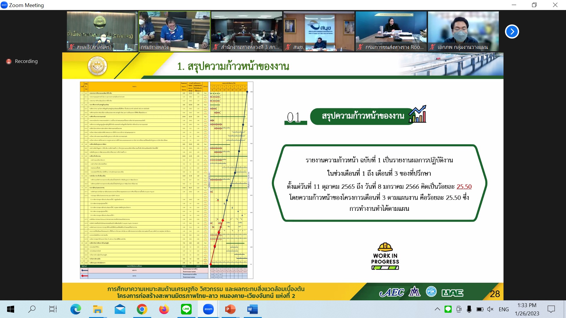 วันที่ 26 มกราคม 2566 เวลา 13.30 น.นายมนตรี เดชาสกุลสม รองอธิบดีกรมทางหลวง ฝ่ายวิชาการเป็นประธาน ประชุมพิจารณารายงานความก้าวหน้าฉบับที่ 1(Progress Report) การศึกษาความเหมาะสมด้านเศรษฐกิจ วิศวกรรม และผลกระทบสิ่งแวดล้อมเบื้องต้น โครงการก่อสร้างสะพานมิตรภาพไทย-ลาว(หนองคาย-เวียงจันทน์ แห่งที่ 2 ผ่านระบบ Zoom Meeting จากห้องประชุมสวัสดิ์วรวิถี ชั้น2 อาคารพหลโยธิน กรมทางหลวง