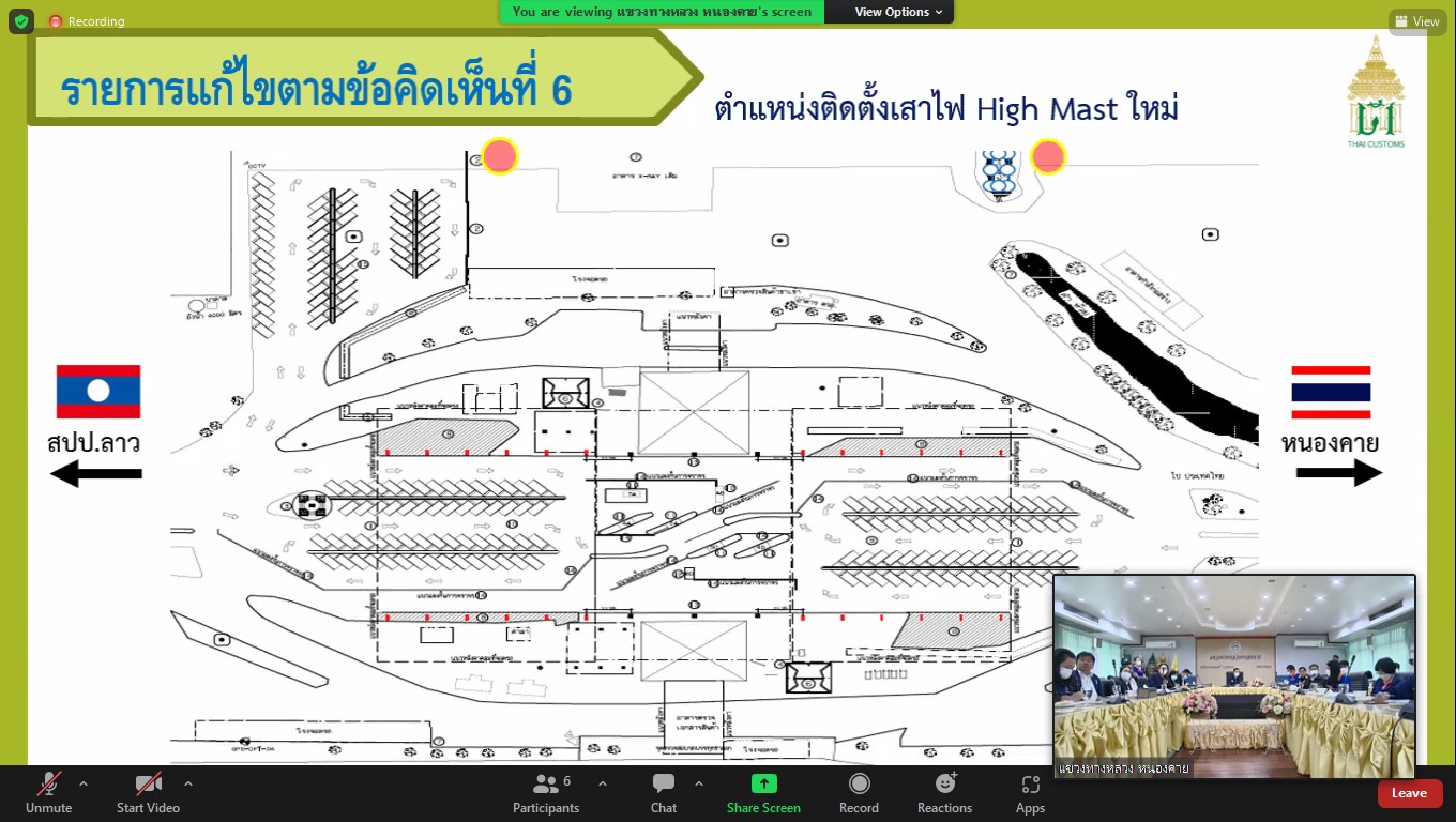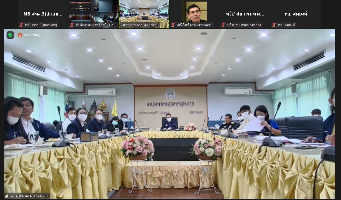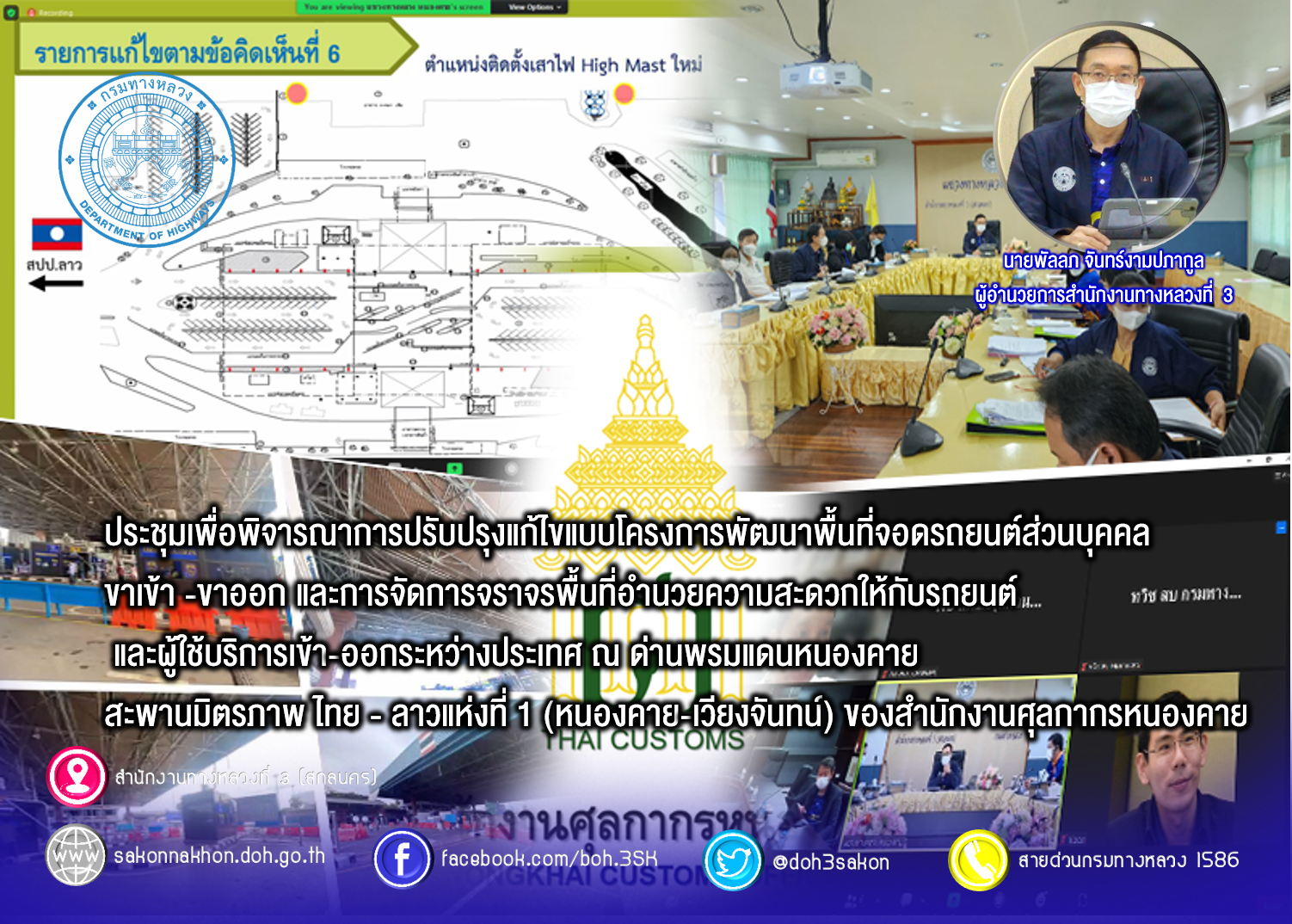 นายพัลลภ จันทร์งามปภากูล ผู้อำนวยการสำนักงานทางหลวงที่ 3 เป็นประธาน ประชุมเพื่อพิจารณาการปรับปรุงแก้ไขแบบโครงการพัฒนาพื้นที่จอดรถยนต์ส่วนบุคคลขาเข้า-ขาออก และการจัดการจราจรพื้นที่อำนวยความสะดวกให้กับรถยนต์ และผู้ใช้บริการเข้า-ออกระหว่างประเทศ ณ ด่านพรมแดนหนองคาย สะพานมิตรภาพ ไทย - ลาวแห่งที่ 1 (หนองคาย-เวียงจันทน์) ของสำนักงานศุลกากรหนองคาย ผ่านระบบ Zoom Cloud Meeting จากห้องแขวงห้องประชุมแขวงทางหลวงหนองคาย