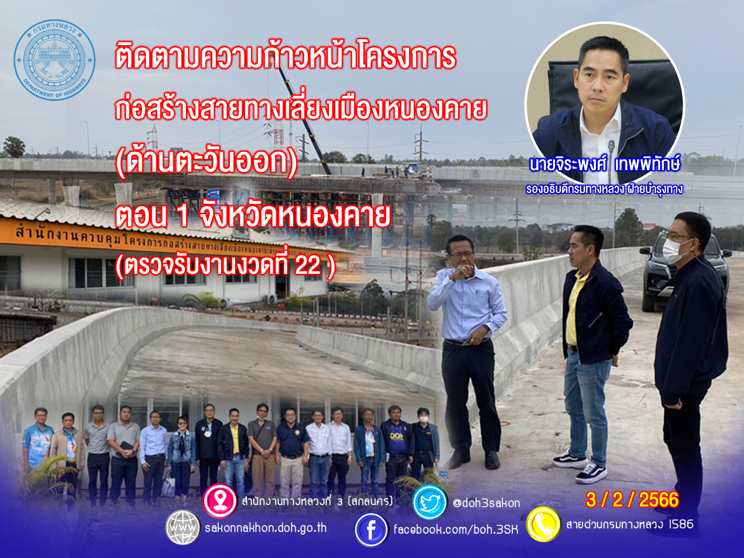 นายจิระพงศ์ เทพพิทักษ์ รองอธิบดีกรมทางหลวง ฝ่ายบำรุงทาง ประธานกรรมการตรวจรับพัสดุ พร้อมด้วยนายพัลลภ จันทร์งามปภากูล ผู้อำนวยการสำนักงานทางหลวงที่ 3 กรรมการตรวจรับพัสดุ และคณะกรรมการตรวจรับพัสดุ ลงพื้นที่ติดตามความก้าวหน้าโครงการก่อสร้างสายทางเลี่ยงเมืองหนองคาย (ด้านตะวันออก) ตอน 1 จังหวัดหนองคาย บนทางหลวงหมายเลข 2 ระหว่าง กม.502+000 - กม.507+750 ระยะทางรวม 5.750 กม. วงเงินงบประมาณ 1,544,634,300บาท (ตรวจรับงานงวดที่ 22)