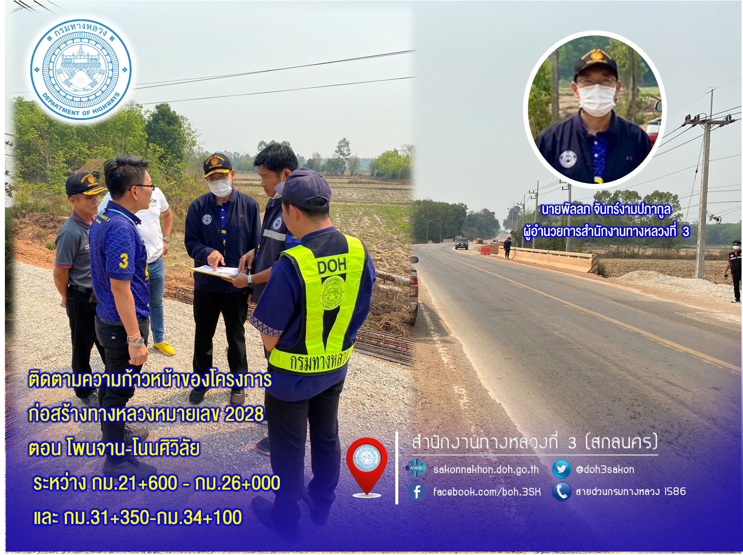 ลงพื้นที่ติดตามความก้าวหน้าของโครงการก่อสร้างทางหลวงหมายเลข 2028 ตอน โพนจาน-โนนศิวิลัย ระหว่าง กม.21+600 - กม.26+000 และ กม.31+350-กม.34+100 ปริมาณงาน 2 แห่ง วงเงินงบประมาณ 78,556,000 บาท (ตรวจรับงานงวดที่ 1) เพื่อให้การดำเนินงานก่อสร้างทางหลวงแผ่นดินได้ตามแบบมาตรฐานของกรมทางหลวง กระทรวงคมนาคม มีห้างหุ้นส่วนจำกัด บัวขาวเฟอร์นิเจอร์ เป็นผู้รับจ้าง ควบคุมการก่อสร้างโดยส่วนควบคุมงานก่อสร้าง สำนักงานทางหลวงที่ 3 (สกลนคร)
