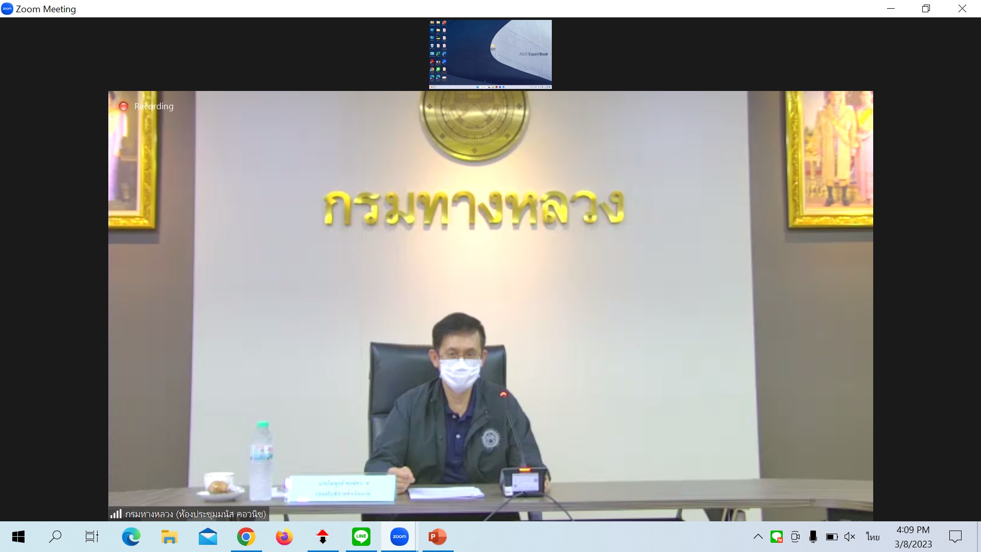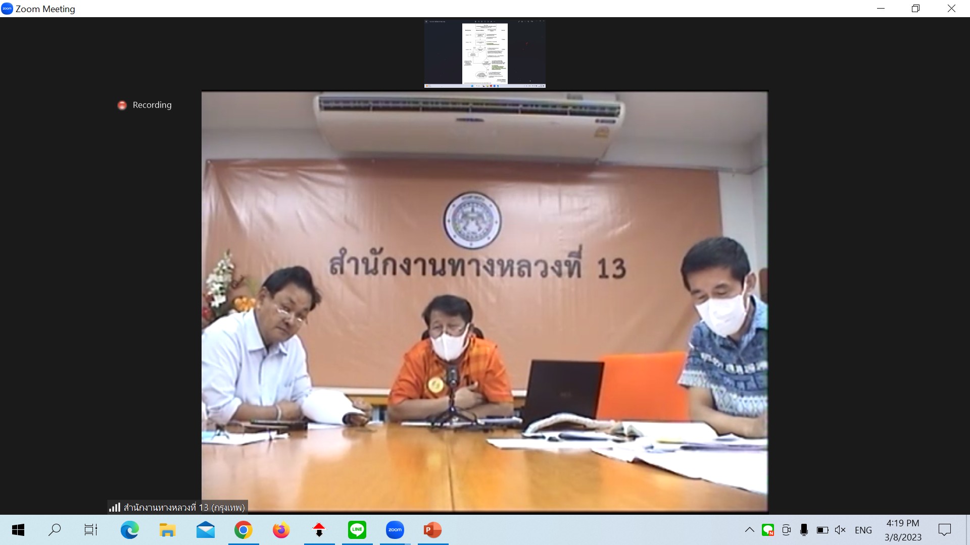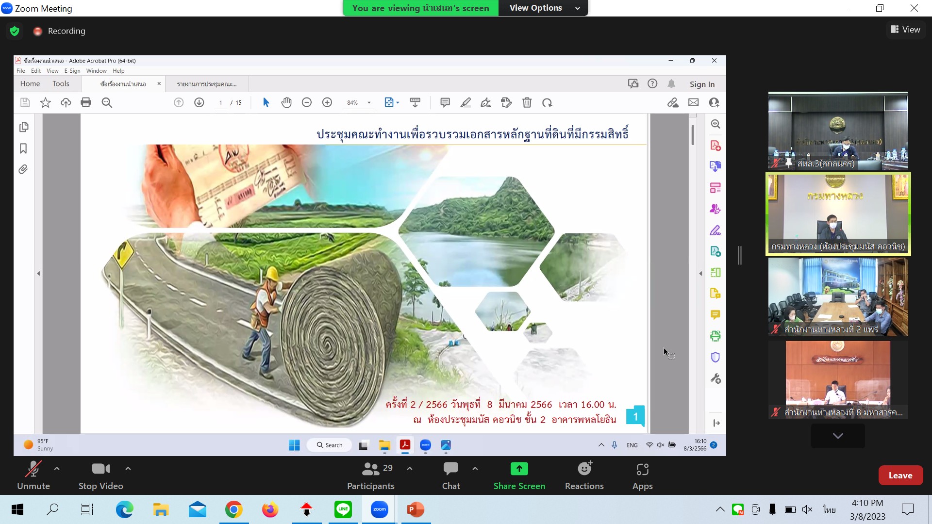 นายไพฑูรย์ พงษ์ชวลิต รองอธิบดีกรมทางหลวง ฝ่ายดำเนินงานเป็นประธาน ประชุมคณะทำงานเพื่อรวบรวมเอกสารหลักฐานที่ดินที่มีกรรมสิทธิ์ ครั้งที่ 2/2566 ผ่านระบบ Zoom Cloud Meeting จากห้องประชุมมนัส คอวอนิช ชั้น 2 อาคารพลโยธิน กรมทางหลวง