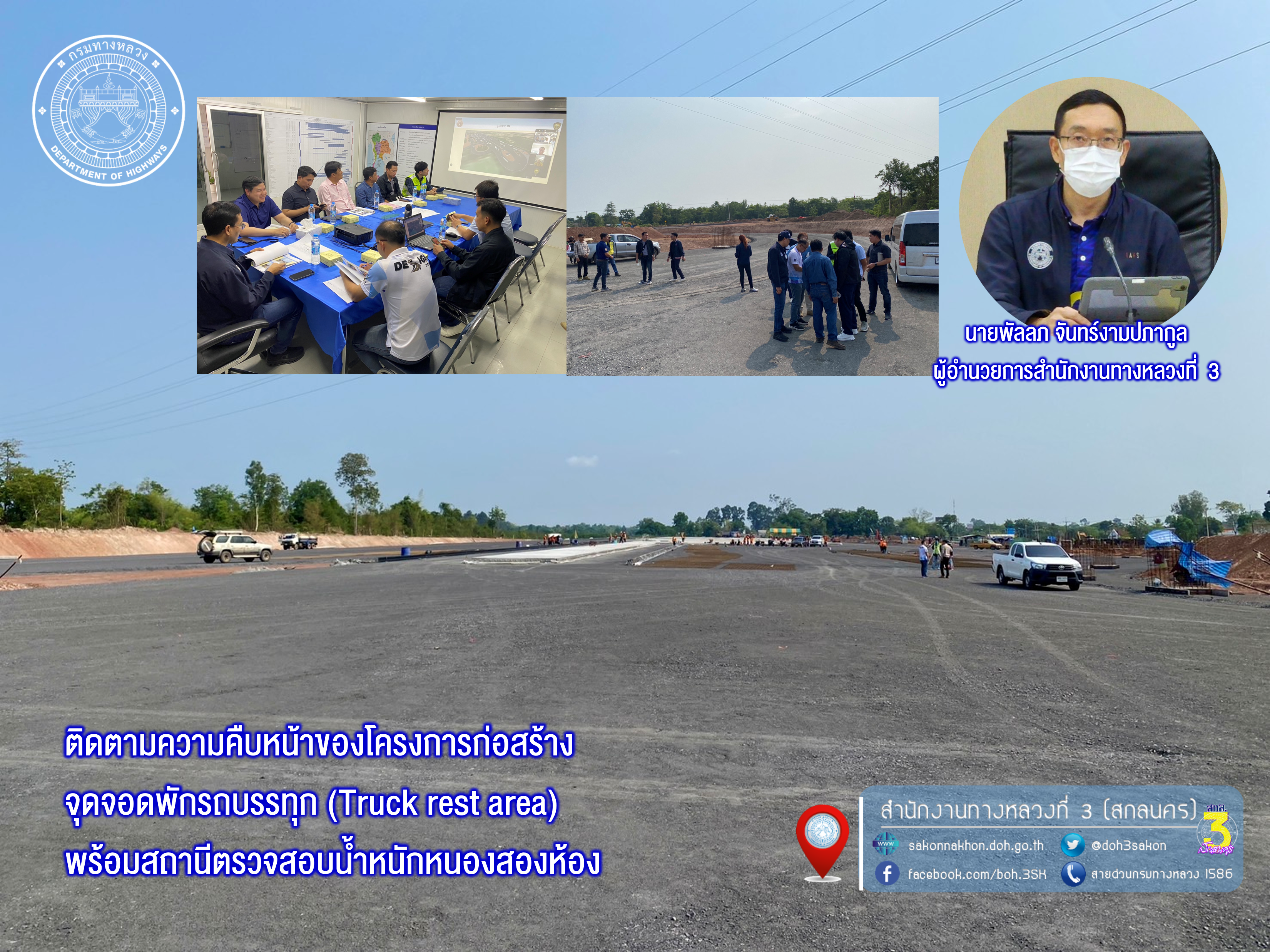 วันที่ 7 พฤษภาคม 2567 เวลา 09.30 น. นายพัลลภ จันทร์งามปภากูล ผู้อำนวยการสำนักงานทางหลวงที่ 3 ประธานกรรมการตรวจรับพัสดุ และคณะกรรมการตรวจรับพัสดุ ลงพื้นที่ติดตามคืบก้าวหน้าของโครงการก่อสร้างจุดจอดพักรถบรรทุก (Truck rest area) พร้อมสถานีตรวจสอบน้ำหนักหนองสองห้อง ทางหลวงหมายเลข 2 ตอน น้ำสวย - สะพานมิตรภาพที่หนองคาย (เขตแดนไทย/ลาว) จ.หนองคาย เพื่อให้การดำเนินงานก่อสร้างเป็นไปตามกรอบแนวทางการพัฒนาพื้นที่ของกรมทางหลวง ให้เป็นจุดจอดพักคอยรถบรรทุกสิ้นค้าขาออก รับรองรถบรรทุกได้ประมาณ 200 คัน พร้อมรับฟังบรรยายสรุปติกตามความก้าวหน้าของโครงการฯ ณ ห้องประชุมสำนักงานโครงการก่อสร้างจุดพักจอดรถบรรทุกฯ จ.หนองคาย