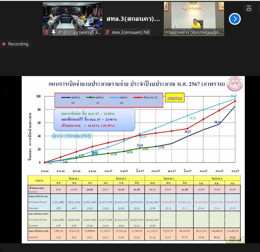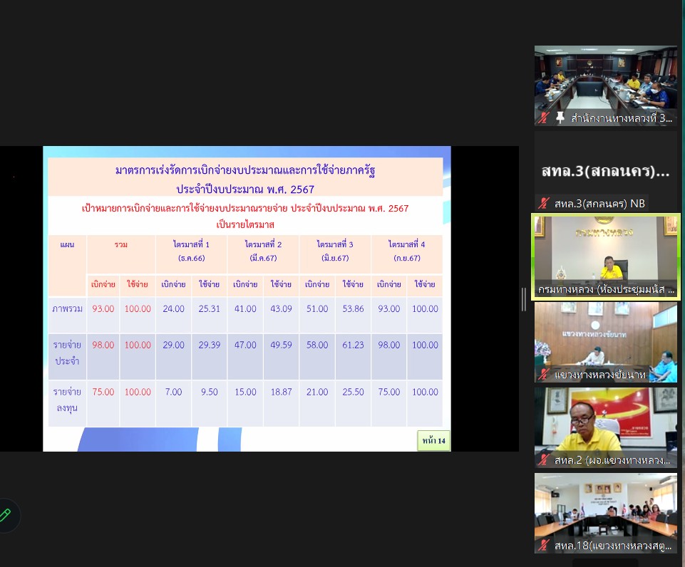 วันที่ 8 พฤษภาคม 2567 เวลา 13.00 - 16.30 น.นายพัลลภ จันทร์งามปภากูล ผู้อำนวยการสำนักงานทางหลวงที่ 3 (สกลนคร) พร้อมด้วย นายชินนพัทธ์ มุลทาทอง ผู้อำนวยการส่วนแผนงาน นางนภาพิศ สุวรรณศรี ผู้อำนวยการฝ่ายบริหารงานทั่วไป นายอำนาจ สาไชยันต์ ผู้อำนวยการส่วนเทคโนโลยีสารสนเทศ นางรุ่งดาว ชมภูวิเศษ หัวหน้างานการเงินและบัญชี วิศวกรโยธา และนายช่างโยธาส่วนแผนงาน เข้าร่วมประชุมเร่งรัดและติดตามผลการดำเนินงานและการเบิกจ่ายเงินงบประมาณประจำปี พ.ศ. 2567 ผ่านระบบออนไลน์ Zoom ณ ห้องประชุมทวีพัฒน์ ตินะมาส ชั้น 3 (อาคารหลังใหม่) จัดโดย กองการเงินและบัญชีฝ่ายจัดสรรและติดตามงบประมาณ กรมทางหลวง