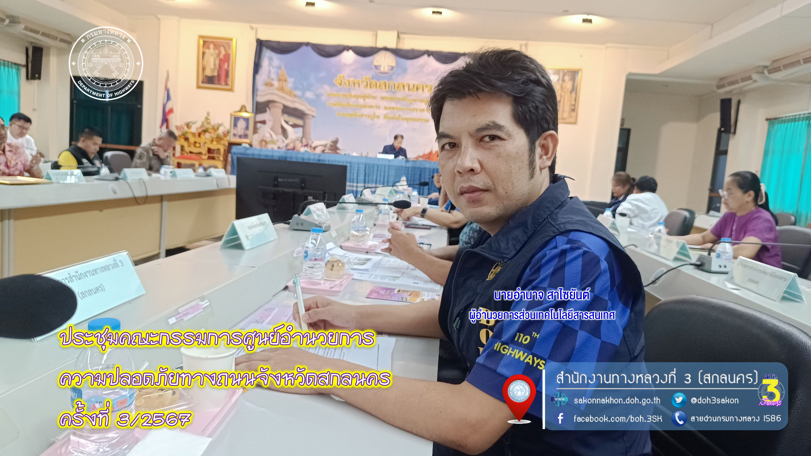 วันที่ 15 พฤษภาคม 2567 เวลา 13.30 - 16.30 น. นายอำนาจ สาไชยันต์ ผู้อำนวยการส่วนเทคโนโลยีสารสนเทศได้รับมอบหมายจาก ผู้อำนวยการสำนักงานทางหลวงที่ 3 ให้เข้าร่วมประชุมคณะกรรมการศูนย์อำนวยการ ความปลอดภัยทางถนนจังหวัดสกลนคร ครั้งที่ 3/2567 ณ ห้องพระธาตุเชิงชุม ชั้น 4 ศาลากลางจังหวัดสกลนคร (หลังใหม่) อำเภอเมืองสกลนคร จังหวัดสกลนคร โดยมี นายพิสิษฐ์ แร่ทอง รองผู้ว่าราชการจังหวัดสกลนคร เป็นประธานการประชุมฯ จัดโดย ศูนย์อำนวยการความปลอดภัยทางถนนจังหวัดสกลนคร