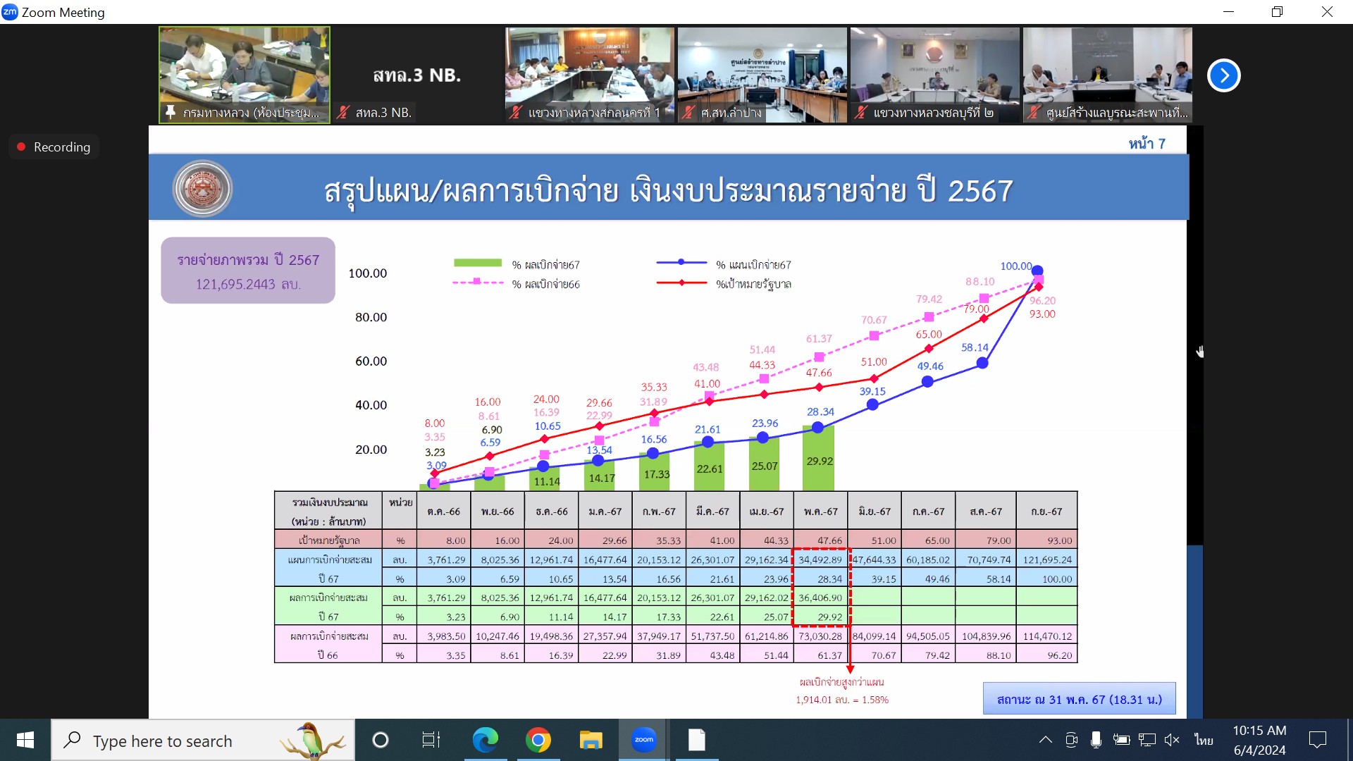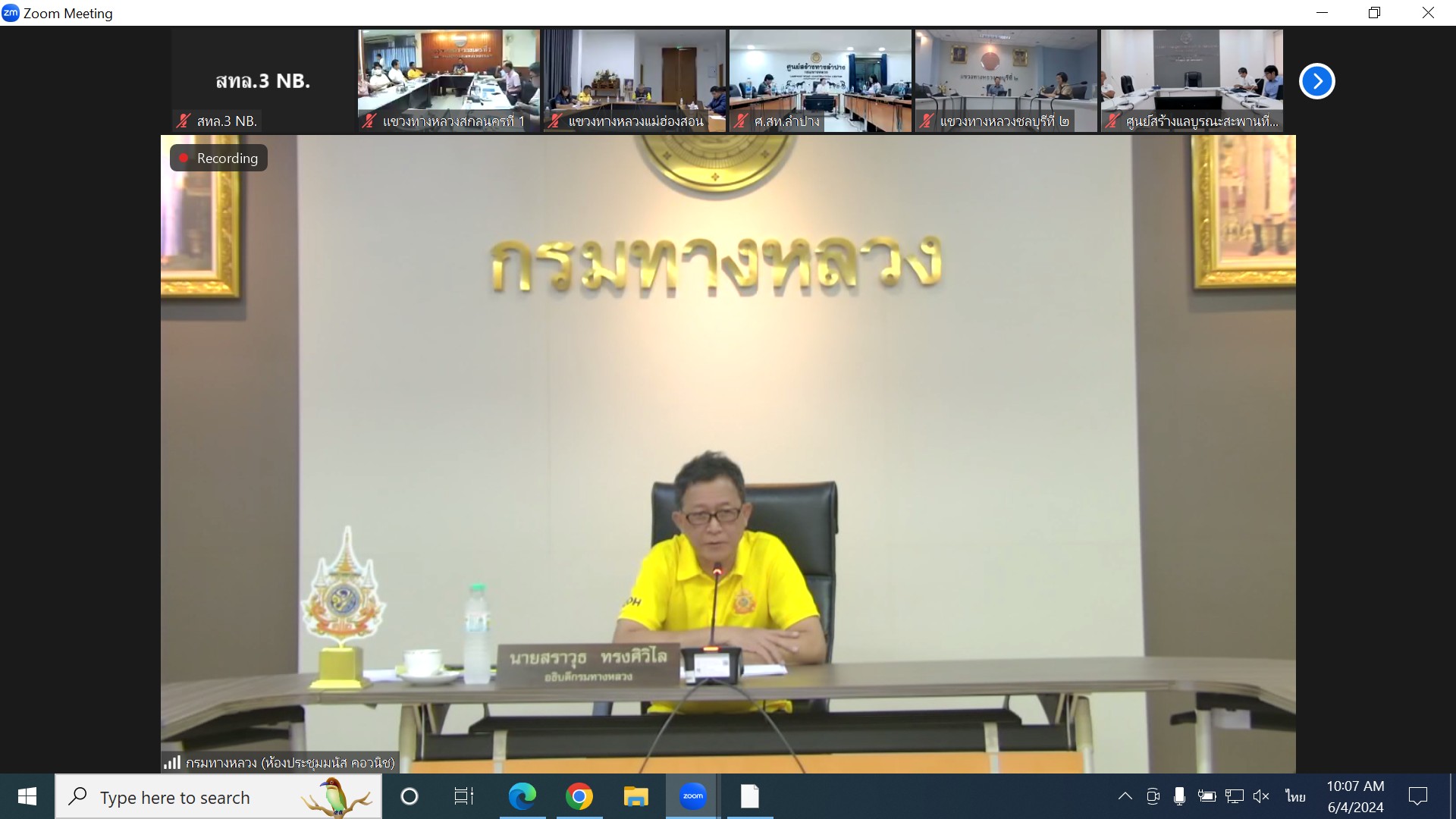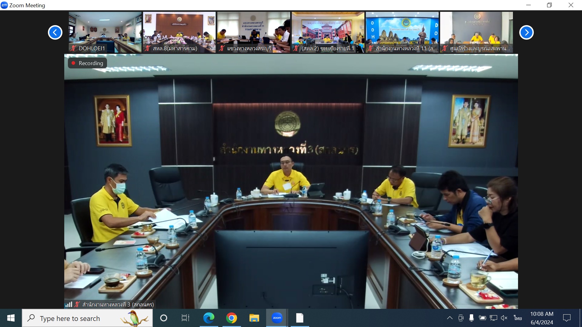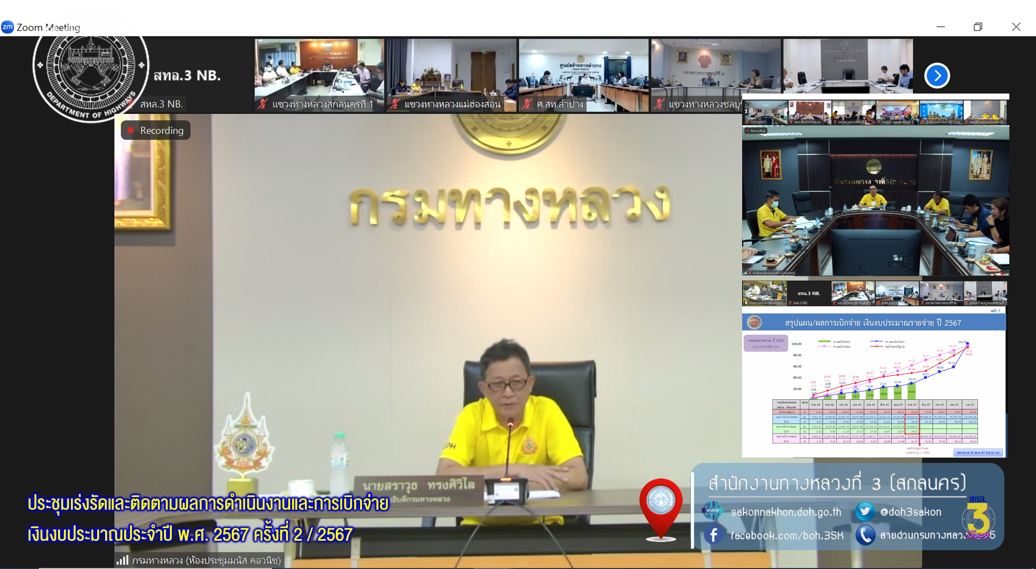 วันที่ 4 มิถุนายน 2567 เวลา 10.00 น.นายพัลลภ จันทร์งามปภากูล ผู้อำนวยการสำนักงานทางหลวงที่ 3 (สกลนคร) พร้อมด้วย นายประวัติ เสวตวงษ์ รองผู้อำนวยการสำนักงานทางหลวงที่ 3 นายชินนพัทธ์ มุลทาทอง ผู้อำนวยการส่วนแผนงาน นางนภาพิศ สุวรรณศรี ผู้อำนวยการฝ่ายบริหารงานทั่วไป นายอำนาจ สาไชยันต์ ผู้อำนวยการส่วนเทคโนโลยีสารสนเทศ นางรุ่งดาว ชมภูวิเศษ หัวหน้างานการเงินและบัญชี วิศวกรโยธาและนายช่างโยธาส่วนแผนงาน เข้าร่วมประชุมเร่งรัดและติดตามผลการดำเนินงานและการเบิกจ่ายเงินงบประมาณประจำปี พ.ศ. 2567 ครั้งที่ 2/2567 ของกรมทางหลวง ผ่านระบบออนไลน์ Zoom ณ ห้องประชุมทวีพัฒน์ ตินะมาส ชั้น 3 (อาคารหลังใหม่) โดยมีนายนายสราวุธ ทรงศิวิไล อธิบดีกรมทางหลวง เป็นประธาน การประชุมในครั้งนี้มีหน่วยงานสังกัดกรมทางหลวงทั้ง 18 สำนักฯ เข้าร่วมประชุมผ่านระบบออนไลน์ Zoom ด้วย