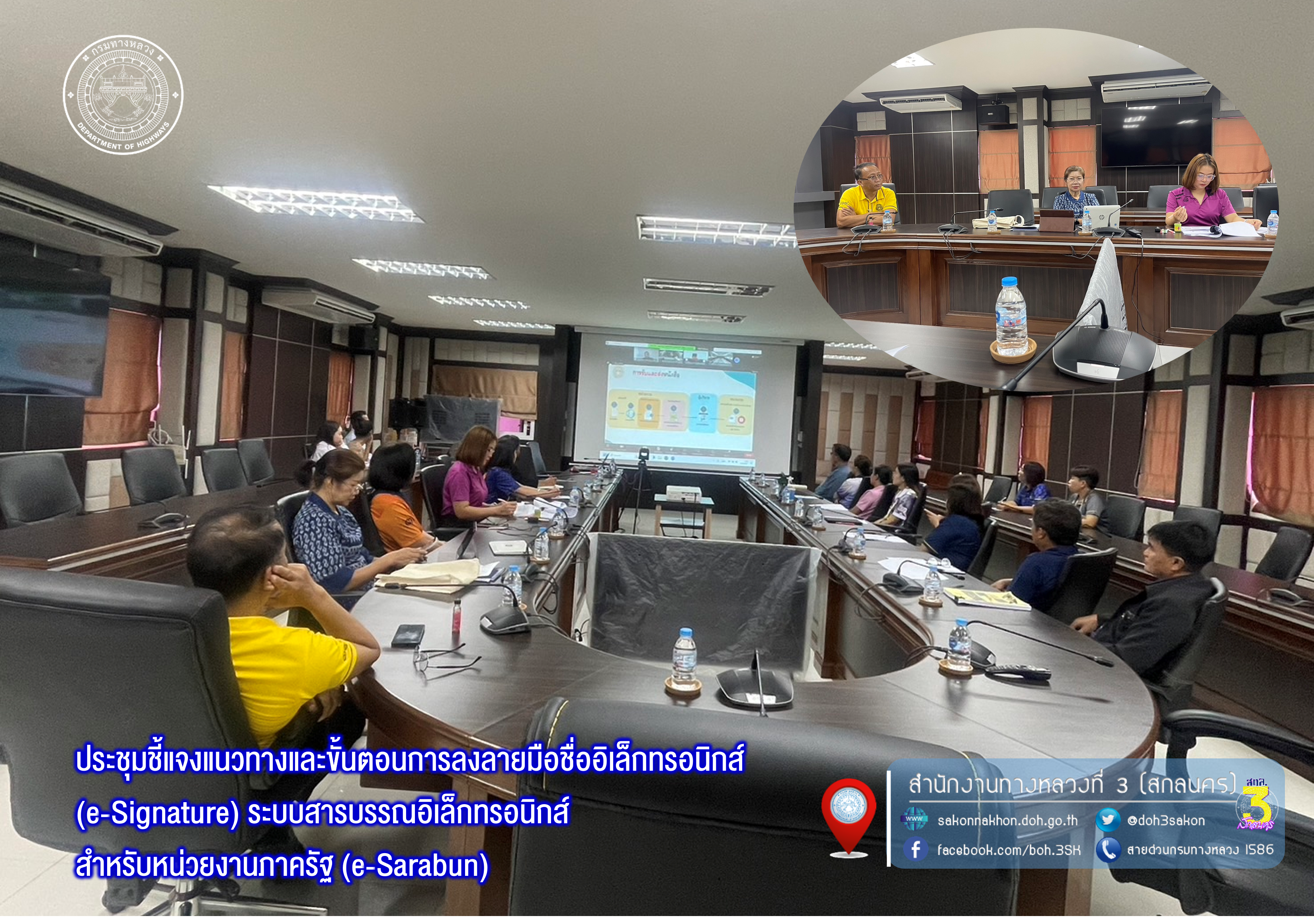 วันที่ 13 มิถุนายน 2567 เวลา 09.30 น.นายประวัติ เสวตวงษ์ รองผู้อำนวยการสำนักงานทางหลวงที่ 3 ตำแหน่งที่ 2 พร้อมด้วย นางนภาพิศ สุวรรณศรี ผบ.ทล.3 นายพงษ์ศักดิ์ อาจลา วบ.ทล.3 นายประวิทย์ คงระกำ ชฟ.ทล.3 นางพวงเพชร เบญมาศ หส.ทล.3 และเจ้าหน้าที่ส่วน/ฝ่าย/งาน ที่เกี่ยวข้อง เข้าร่วมประชุมชี้แจงแนวทางและขั้นตอนการลงลายมือชื่ออิเล็กทรอนิกส์ (e-Signature) ระบบสารบรรณอิเล็กทรอนิกส์สำหรับหน่วยงานภาครัฐ (e-Sarabun) ผ่านระบบ Zoom Cloud Meeting ณ ห้องประชุมทวีพัฒน์ ตินะมาส ชั้น 3 (อาคารหลังใหม่) จัดโดย ศูนย์เทคโนโลยีสารสนเทศ กรมทางหลวง