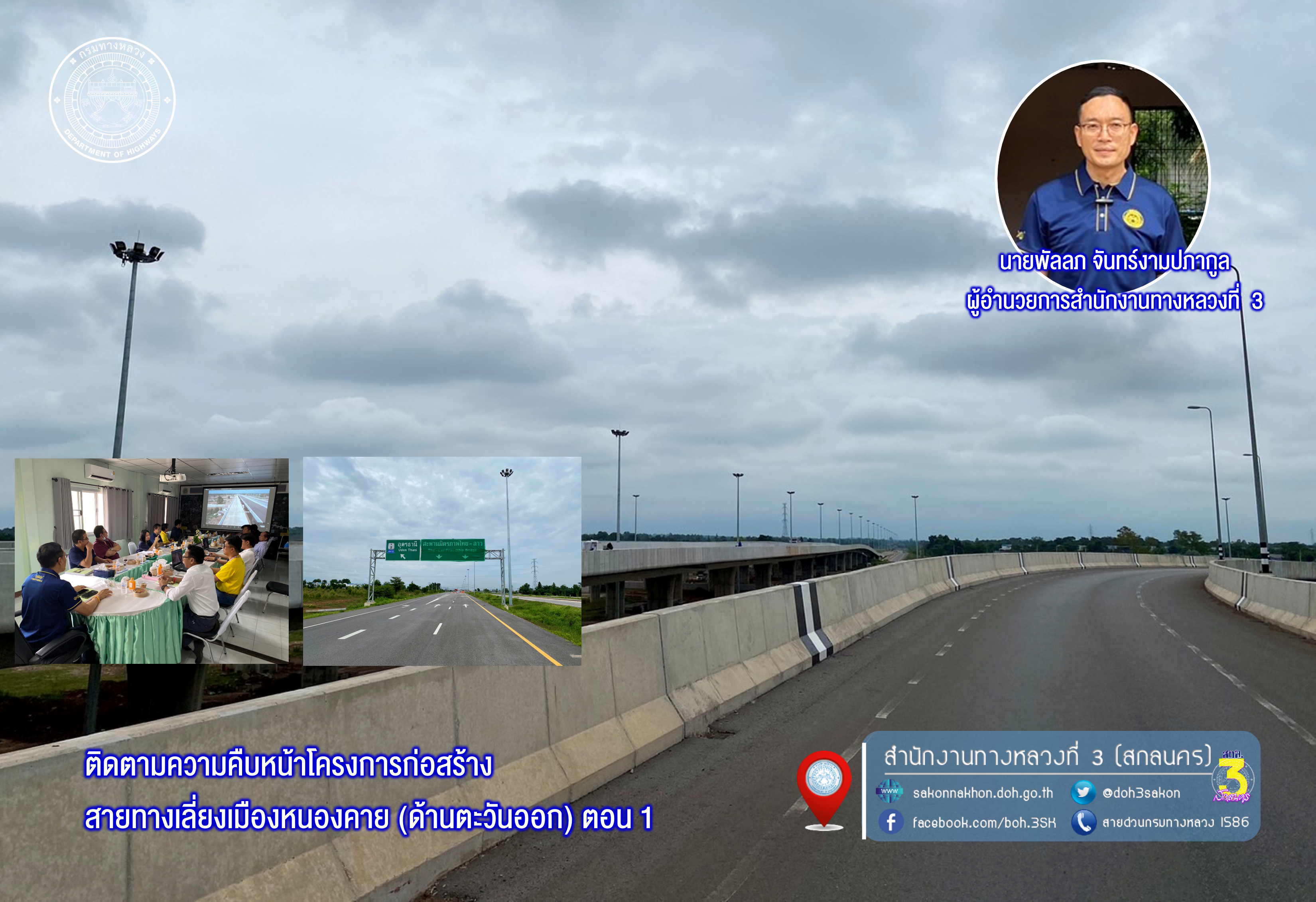วันที่ 10 กรกฎาคม 2567 เวลา 10.30 น. นายจิระพงศ์ เทพพิทักษ์ รองอธิบดีกรมทางหลวง ประธานกรรมการตรวจรับพัสดุ มอบให้นายพัลลภ จันทร์งามปภากูล ผู้อำนวยการสำนักงานทางหลวงที่ 3 กรรมการตรวจรับพัสดุ พร้อมด้วยคณะกรรมการตรวจรับพัสดุ ลงพื้นที่ติดตามความคืบหน้าโครงการก่อสร้างสายทางเลี่ยงเมืองหนองคาย (ด้านตะวันออก) ตอน 1 จังหวัดหนองคาย บนทางหลวงหมายเลข 2 ระหว่าง กม.502+000 - กม.507+750 ระยะทางรวม 5.750 กม. วงเงินงบประมาณ 1,544,634,300บาท (ตรวจรับงานงวดที่ 35) มีบริษัท ซิโน-ไทย เอ็นจีเนียริ่ง แอนด์ คอนสตรัคชั่น จำกัด(มหาชน) เป็นผู้รับจ้าง เพื่อให้การดำเนินงานก่อสร้างทางหลวงแผ่นดินได้ตามแบบมาตรฐานของกรมทางหลวง กระทรวงคมนาคม พร้อมรับฟังบรรยายสรุปผลการดำเนินงานของโครงการฯ ณ ห้องประชุมสำนักงานชั่วคราวของโครงการฯ ควบคุมการก่อสร้างโดยสำนักก่อสร้างสะพาน กรมทางหลวง
