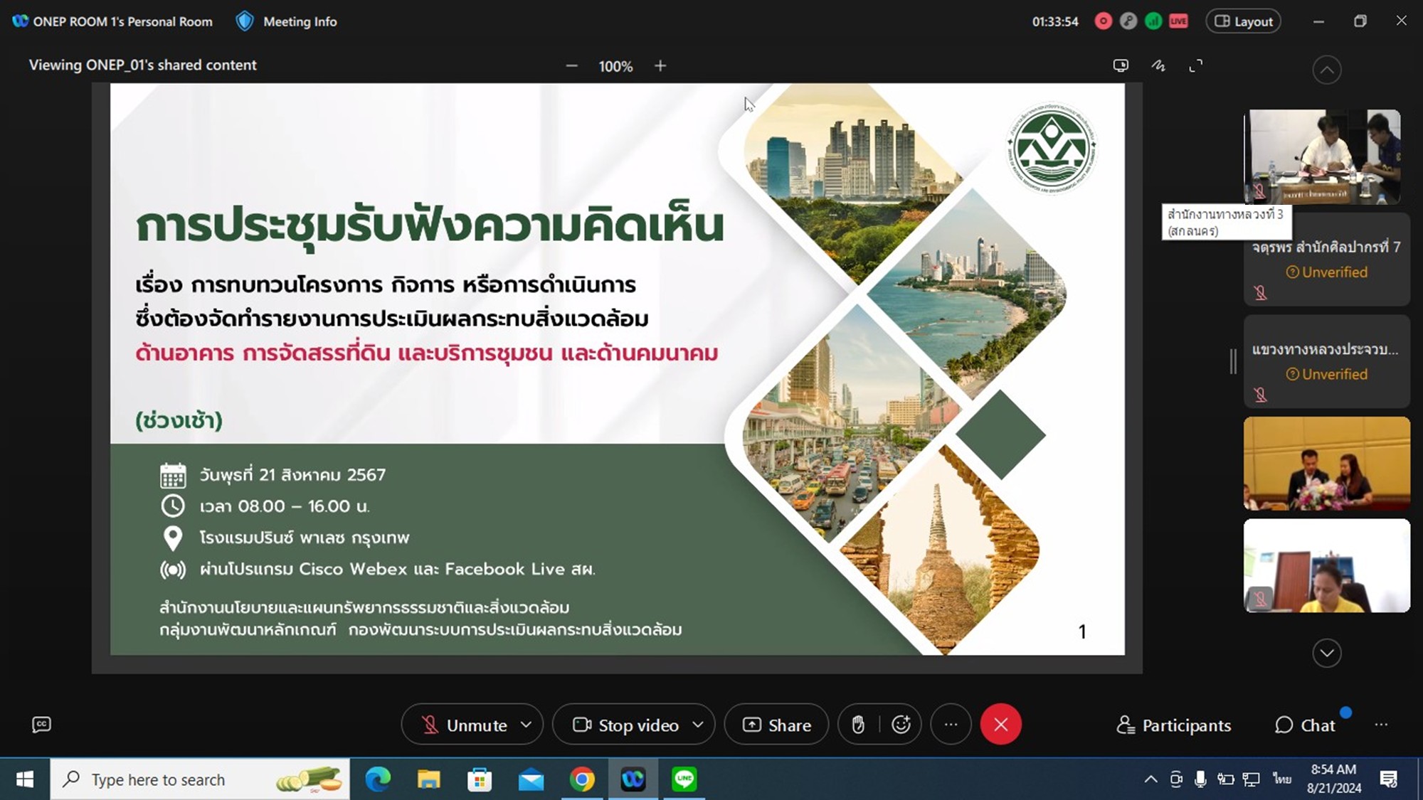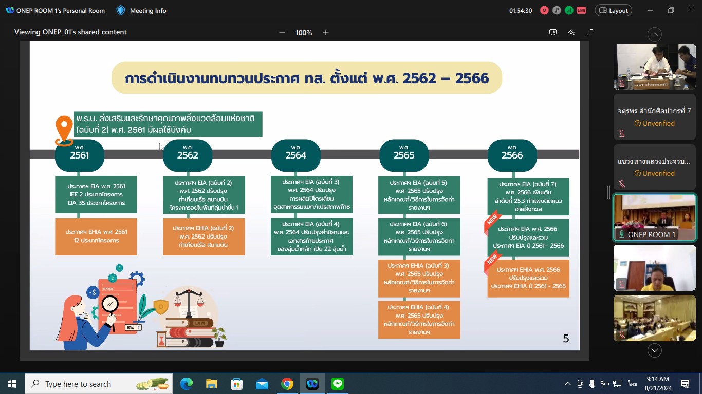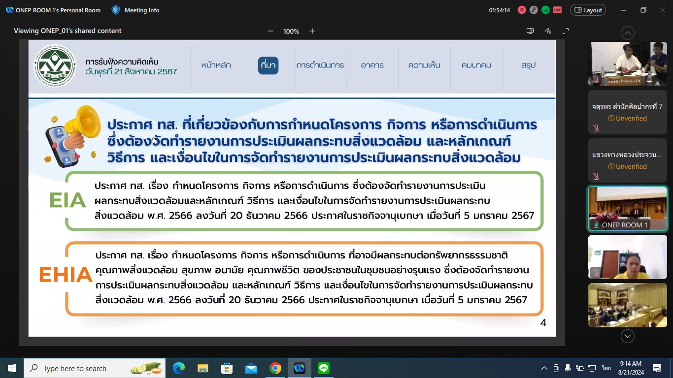 วันที่ 21 สิงหาคม 2567 เวลา 08.00 - 16.00 น. นายพงษ์ศักดิ์ อาจลา ผู้อำนวยการส่วนควบคุมงานก่อสร้างทาง พร้อมด้วย นายธนากรณ์ ติยะบุตร วิศวกรโยธาส่วนแผนงาน เข้าร่วมประชุมรับฟังความคิดเห็นต่อการทบทวนโครงการ กิจการ หรือการดำเนินการซึ่งต้องจัดทำรายงานการประเมินผลกระทบสิ่งแวดล้อม ด้านอาคาร การจัดสรรที่ดิน และบริการชุนชน และด้านคมนาคม เพื่อนำข้อมูลมาประกอบการทบทวนโครงการ กิจการ หรือดำเนินการ ซึ่งต้องจัดทำรายงานการประเมินผลกระทบสิ่งแวดล้อม ผ่านระบบ Cisco Webex Meetings ณ ห้องประชุม ชั้น 2 อาคารหลังใหม่ สำนักงานทางหลวงที่ 3 (สกลนคร) จัดโดย สำนักงานนโยบายและแผนทรัพยากรธรรมชาติและสิ่งแวดล้อม