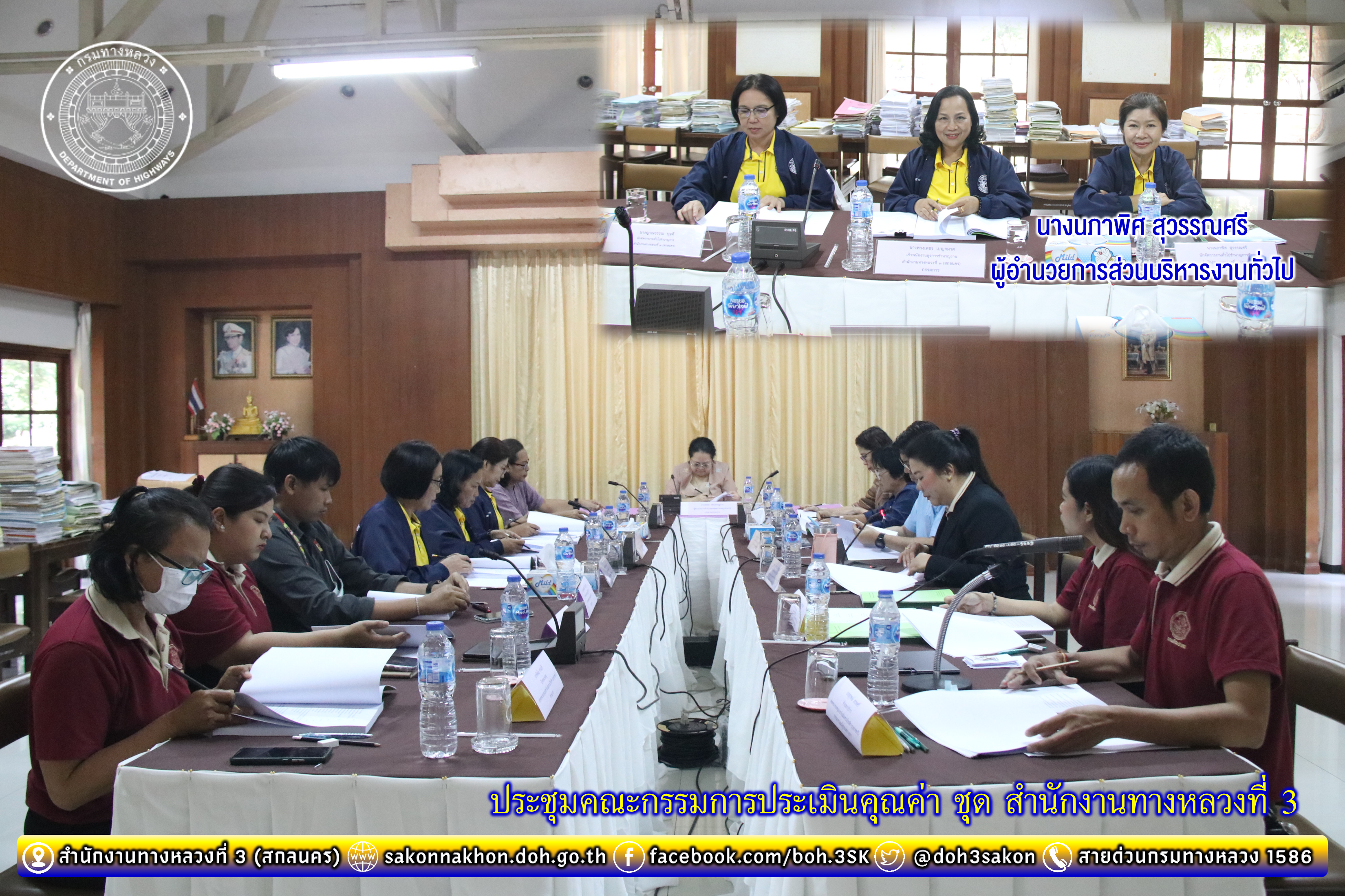 วันที่ 21 สิงหาคม 2567 เวลา 09.00 น. นางนภาพิศ สุวรรณศรี ผู้อำนวยการฝ่ายบริหารงานทั่วไป พร้อมด้วย นางพวงเพชร เบญจมาศ หัวหน้างานสารบรรณ และ นางญาณวรรณ บุษดี นักจัดการงานทั่วไปชำนาญการ ได้รับมอบหมายจาก ผู้อำนวยการสำนักงานทางหลวงที่ 3 ให้เข้าร่วมประชุมคณะกรรมการประเมินคุณค่า ชุด สำนักงานทางหลวงที่ 3 ณ ห้องประชุม หอจดหมายเหตุแห่งชาติเฉลิมพระเกียรติสมเด็จพระบรมโอรสาธิราชฯ สยามมกุฎราชกุมาร อุบลราชธานี โดยมี นางณิชชา จริยเศรษฐการ ผู้อำนวยการสำนักหอจดหมายเหตุแห่งชาติ เป็นประธานฯ
