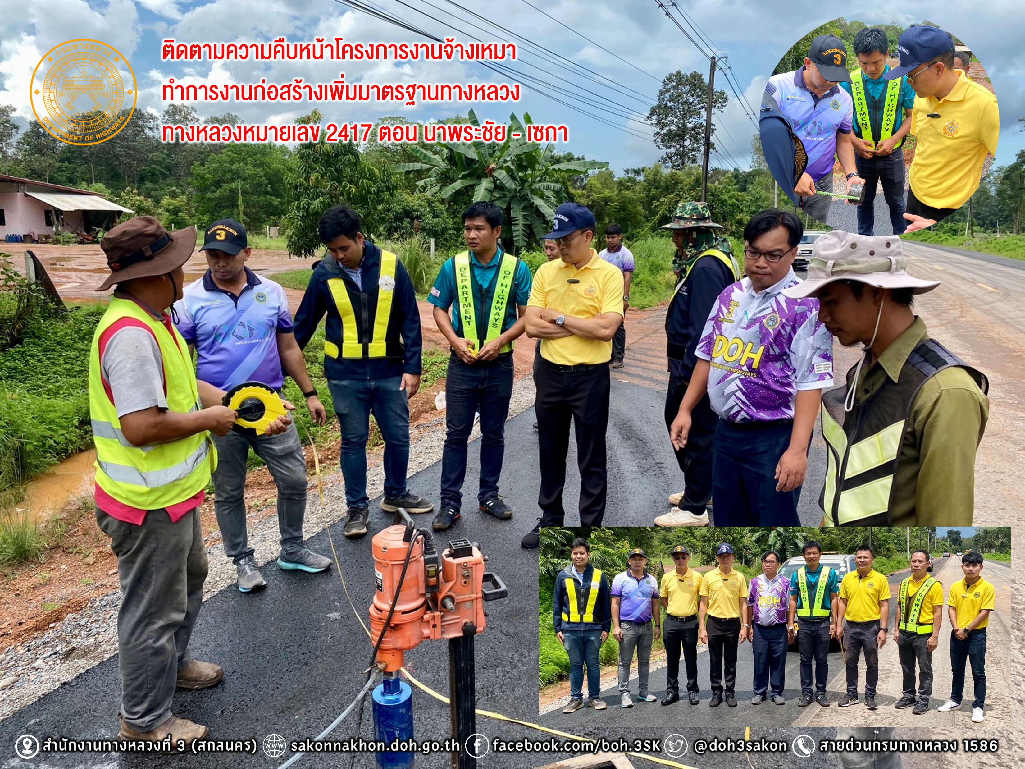 วันที่ 29 สิงหาคม 2567 นายพัลลภ จันทร์งามปภากูล ผู้อำนวยการสำนักงานทางหลวงที่ 3 ประธานกรรมการตรวจรับพัสดุ พร้อมด้วยนายพิชญ รุ่งเรืองวิโรจน์ ผู้อำนวยการแขวงทางหลวงนครพนม กรรมการตรวจรับพัสดุ นายวิริยะ ปากดีสี วิศวกรโยธาปฏิบัติการ นายช่างผู้ควบคุมงานก่อสร้าง และคณะกรรมการตรวจรับพัสดุ ลงพื้นที่ติดตามความคืบหน้าโครงการงานจ้างเหมาทำการงานก่อสร้างเพิ่มมาตรฐานทางหลวง ทางหลวงหมายเลข 2417 ตอน นาพระชัย - เซกา ระหว่าง กม.4+550 - กม.7+467 และ 7+895 - กม.11+400 ปริมาณ 1 แห่ง (6.422 กม.) วงเงิน 79,980,861 บาท มีบริษัท ท่าพระแทรคเตอร์และก่อสร้าง จำกัด เป็นผู้รับจ้าง (ตรวจรับงานงวดที่ 2) เพื่อให้การดำเนินงานก่อสร้างทางหลวงแผ่นดินได้ตามแบบมาตรฐานของกรมทางหลวง ควบคุมการก่อสร้างโดยส่วนควบคุมงานก่อสร้างทาง สำนักงานทางหลวงที่ 3 (สกลนคร) กรมทางหลวง กระทรวงคมนาคม