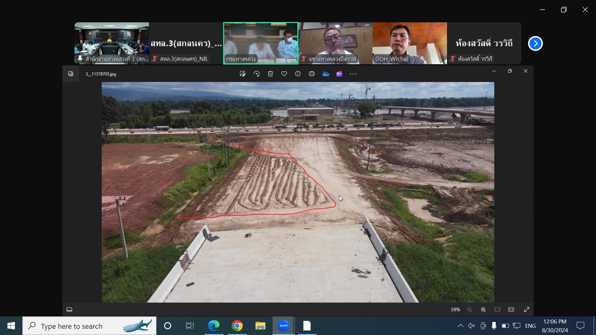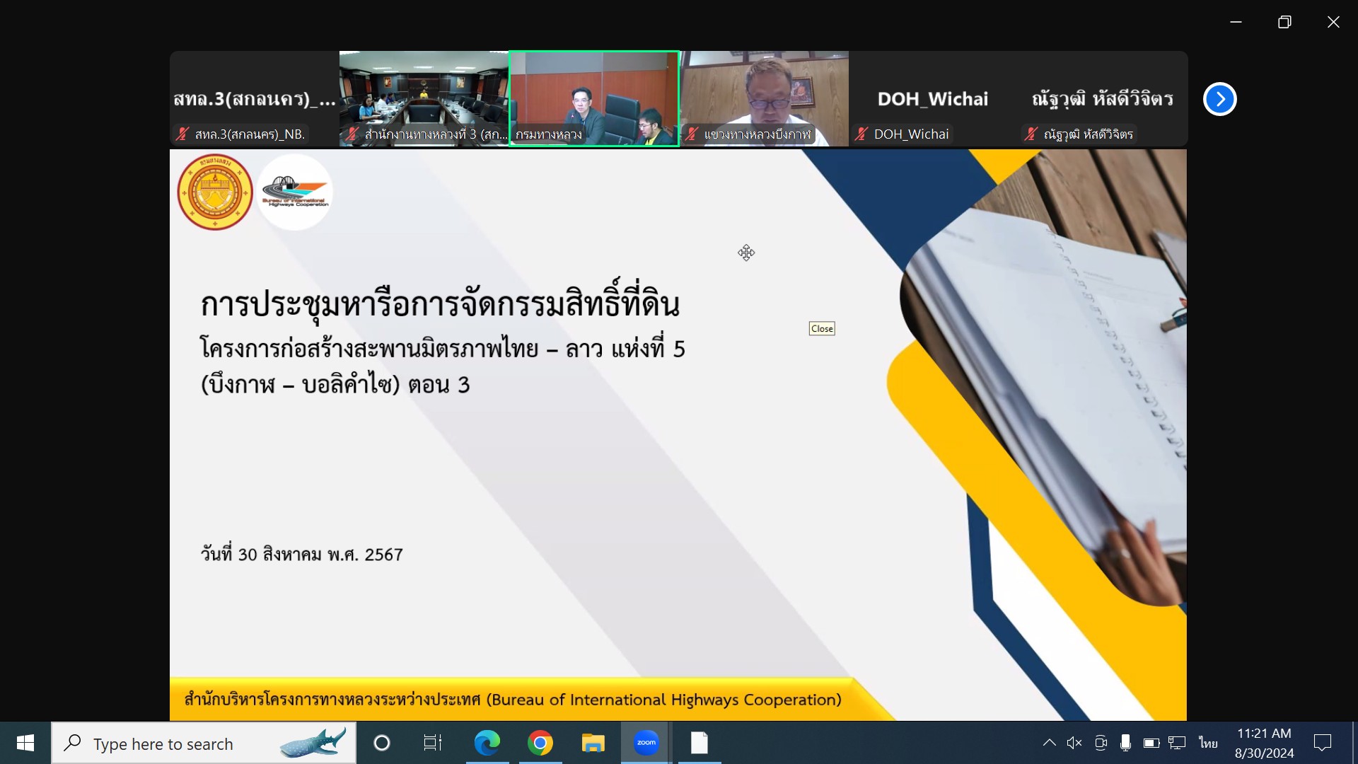 วันที่ 30 สิงหาคม 2567 เวลา 11.00-12.00 น. นายพัลลภ จันทร์งามปภากูล ผู้อำนวยการสำนักงานทางหลวงที่ 3 พร้อมด้วย นายหนูกาญ เจริญไชย ผู้อำนวยการส่วนกฎหมายและกรรมสิทธิ์ที่ดิน และเจ้าหน้าที่ส่วนแผนงาน ส่วนกฎหมายและกรรมสิทธิ์ที่ดิน เข้าร่วมประชุมหารือการจัดกรรมสิทธิ์ที่ดิน โครงการก่อสร้างสะพานมิตรภาพไทย - ลาว แห่งที่ 5 (บึงกาฬ - บอลิคำไซ) ตอน 3 ผ่านสื่ออิเล็กทรอนิกส์ (Zoom Video Conference) ณ ห้องประชุมทวีพัฒน์ ตินะมาส ชั้น 3 อาคารหลังใหม่ จัดโดย สำนักบริหารโครงการทางหลวงระหว่างประเทศ กลุ่มบริหารโครงการเงินกู้และเงินช่วยเหลือ โดยมี นายปิยพงษ์ จิวัฒนกุลไพศาล รองอธิบดีกรมทางหลวง ฝ่ายวิชาการ เป็นประธานฯ