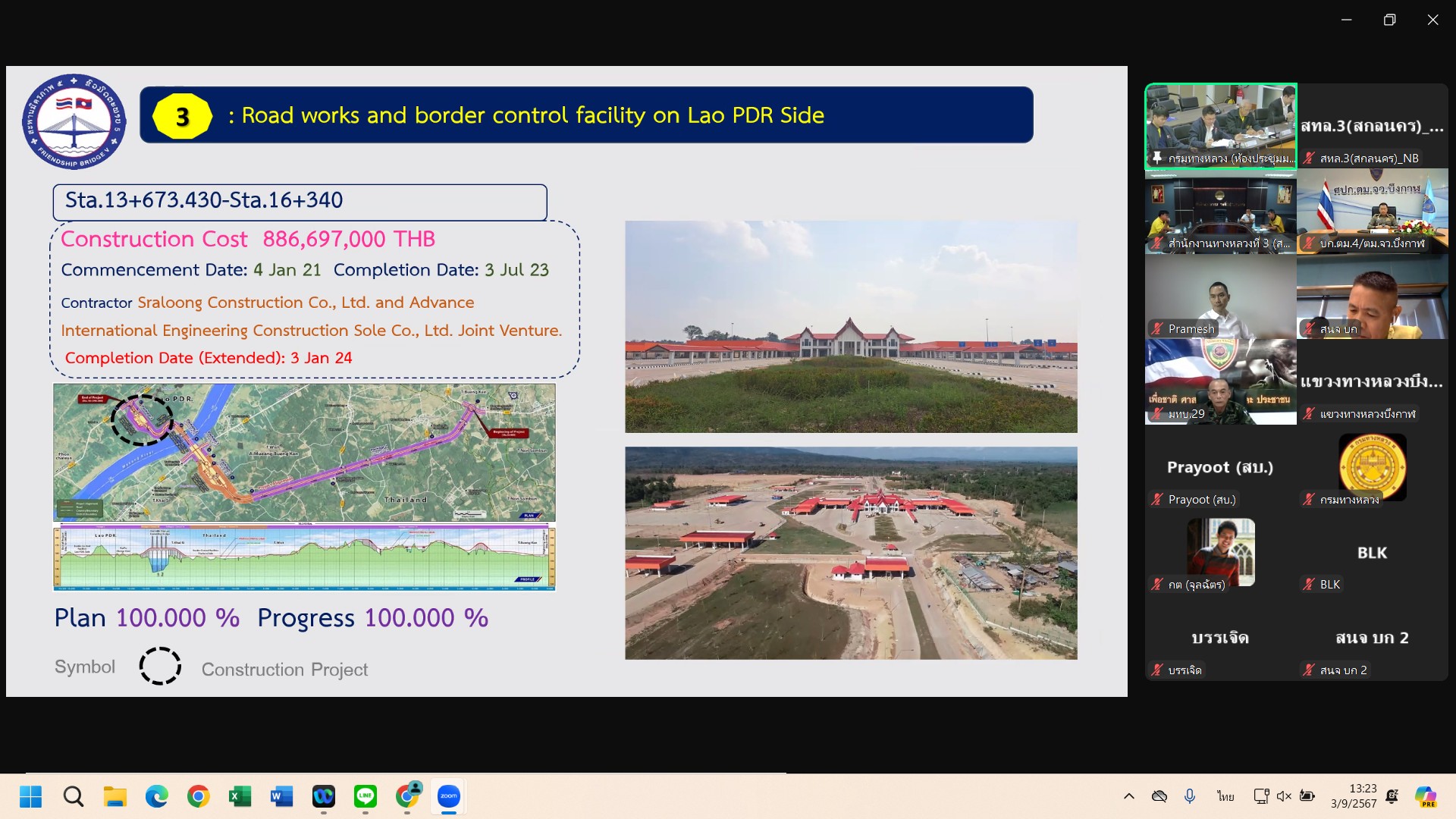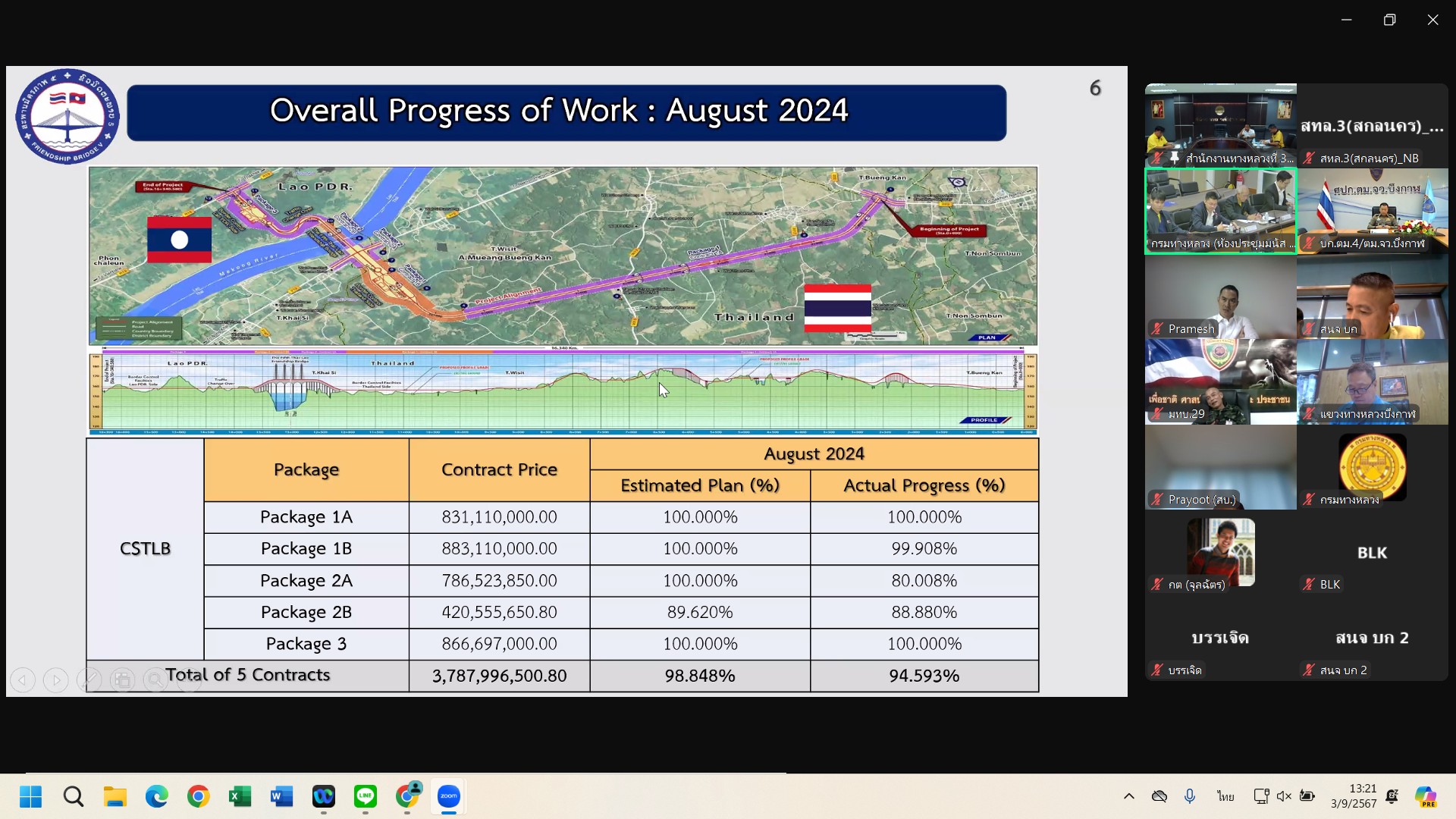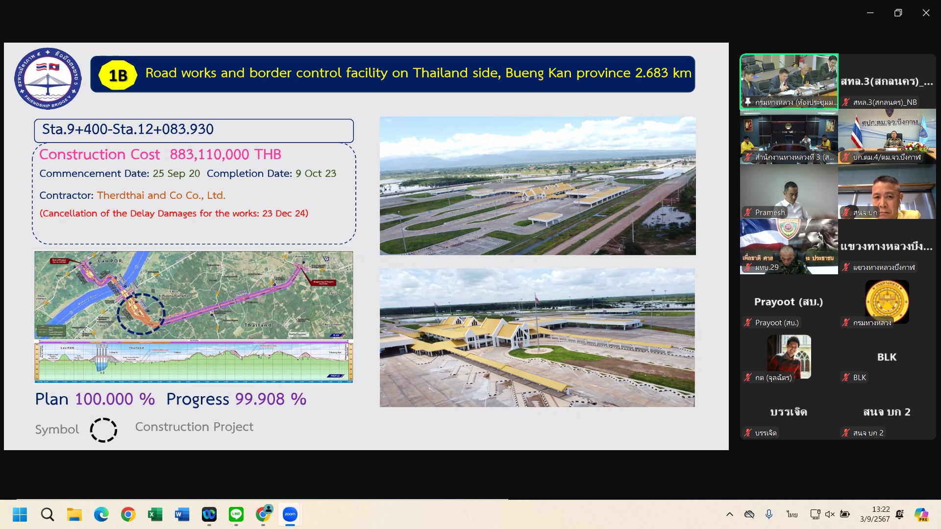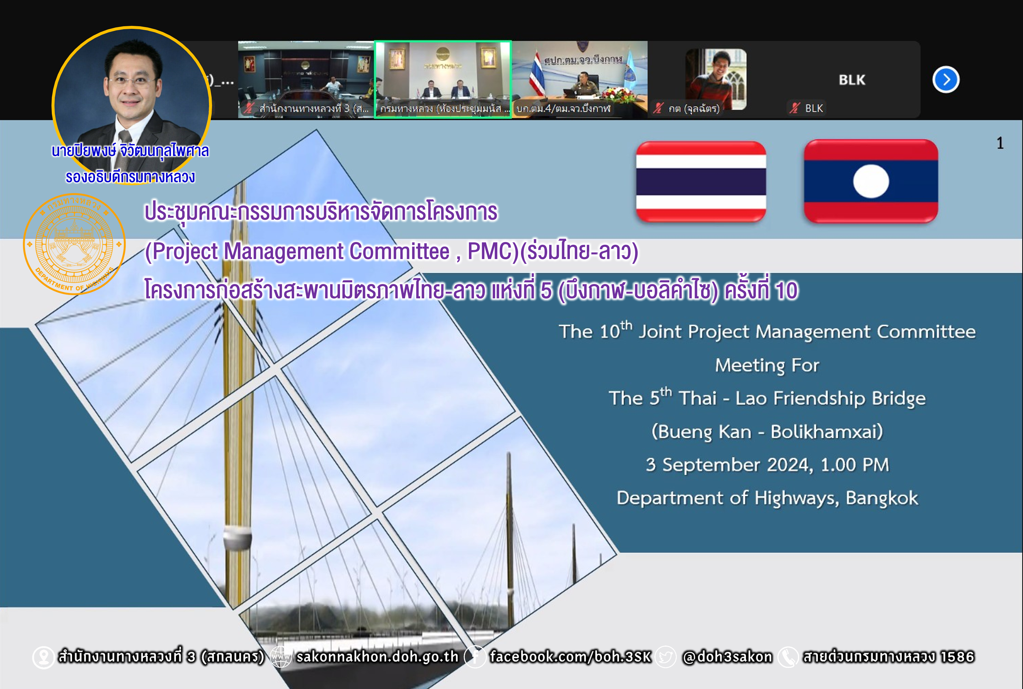 วันที่ 3 กันยายน 2567 นายปิยพงษ์ จิวัฒนกุลไพศาล รองอธิบดีกรมทางหลวง เป็นประธานร่วมฝั่งไทย ประชุมคณะกรรมการบริหารจัดการโครงการ(Project Management Committee , PMC)(ร่วมไทย-ลาว) โครงการก่อสร้างสะพานมิตรภาพไทย-ลาว แห่งที่ 5 (บึงกาฬ-บอลิคำไซ) ครั้งที่ 10 ผ่านระบบ Zoom Cloud Meeting จากห้องประชุมสวัสดิ์วรวิถี ชั้น2 อาคารพลหโยธิน กรมทางหลวง เพื่อติดตามผลการดำเนินงานของโครงการก่อสร้างสะพานมิตรภาพไทย-ลาว แห่งที่ 5 (บึงกาฬ-บอลิคำไซ)