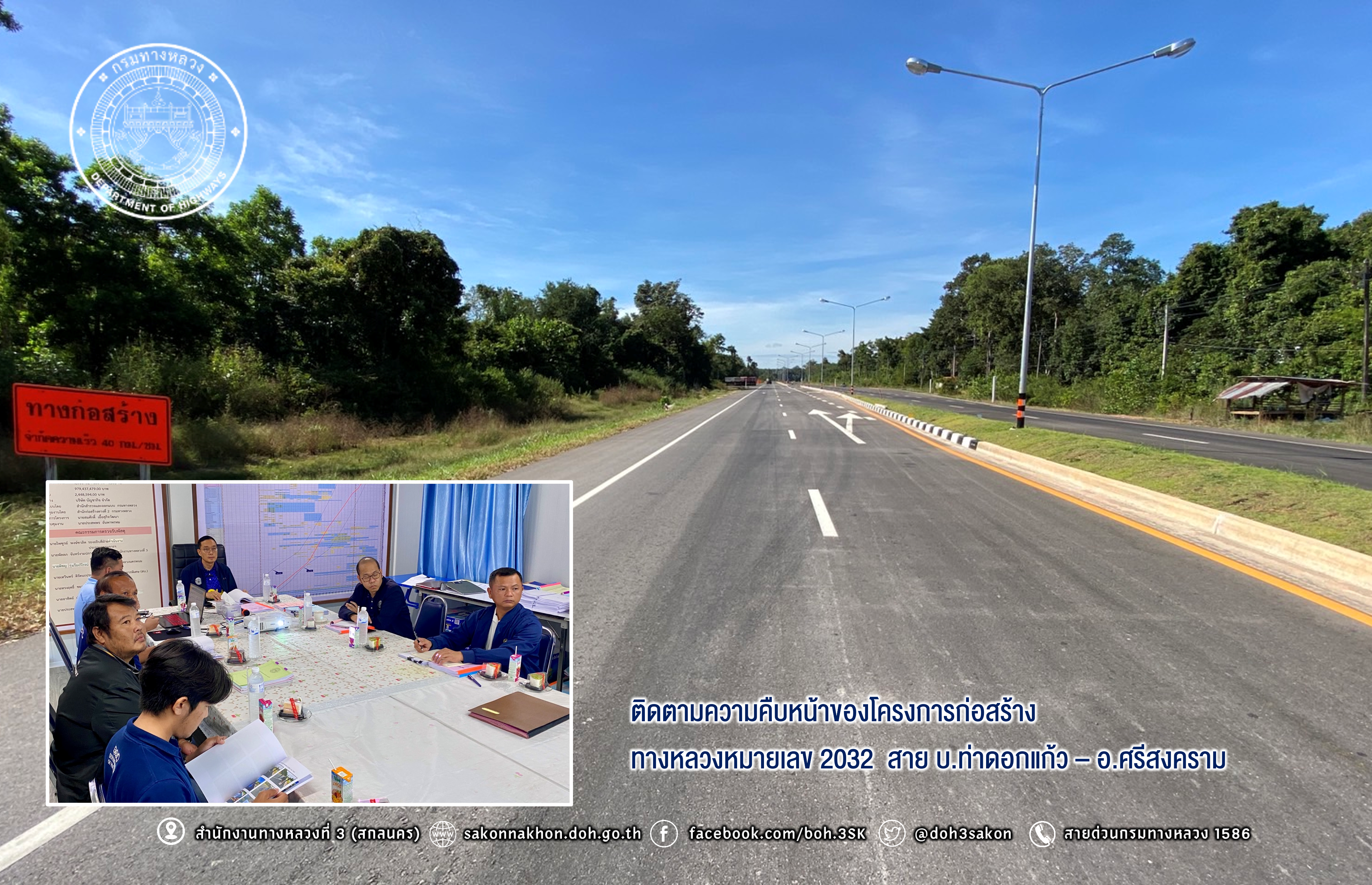 วันที่ 27 พฤศจิกายน 2567 เวลา10.00 น. นายไพฑูรย์ พงษ์ขวลิต รองอธิบดีกรมทางหลวง ฝ่ายดำเนินงาน ประธานกรรมการตรวจรับพัสดุ มอบหมายให้นายพัลลภ จันทร์งามปภากูล ผู้อำนวยการสำนักงานทางหลวงที่ 3 กรรมการตรวจรับพัสดุ พร้อมด้วยนายพิชญ รุ่งเรืองวิโรจน์ ผู้อำนวยการแขวงทางหลวงนครพนม กรรมการตรวจรับพัสดุ และคณะกรรมการตรวจรับพัสดุ ลงพื้นที่ติดตามความคืบหน้าของโครงการก่อสร้างทางหลวงหมายเลข 2032 สาย บ.ท่าดอกแก้ว – อ.ศรีสงคราม ระหว่าง กม.0+000 - กม.28+000 ระยะทางรวม 28.000 กม. วงเงินงบประมาณ 979,437,479 บาท (ตรวจรับงานงวดที่ 14) เพื่อให้การดำเนินงานก่อสร้างทางหลวงแผ่นดินได้มาตรฐานของกรมทางหลวง กระทรวงคมนาคม มีบริษัท บัญชากิจ จำกัด เป็นผู้รับจ้าง พร้อมรับฟังบรรยายสรุปผลการดำเนินงานของโครงการฯ ณ ห้องประชุมสำนักงานชั่วคราวของโครงการฯ ควบคุมการก่อสร้างโดยสำนักก่อสร้างทางที่ 2 กรมทางหลวง