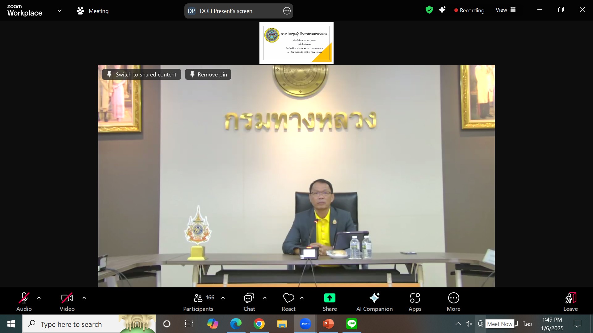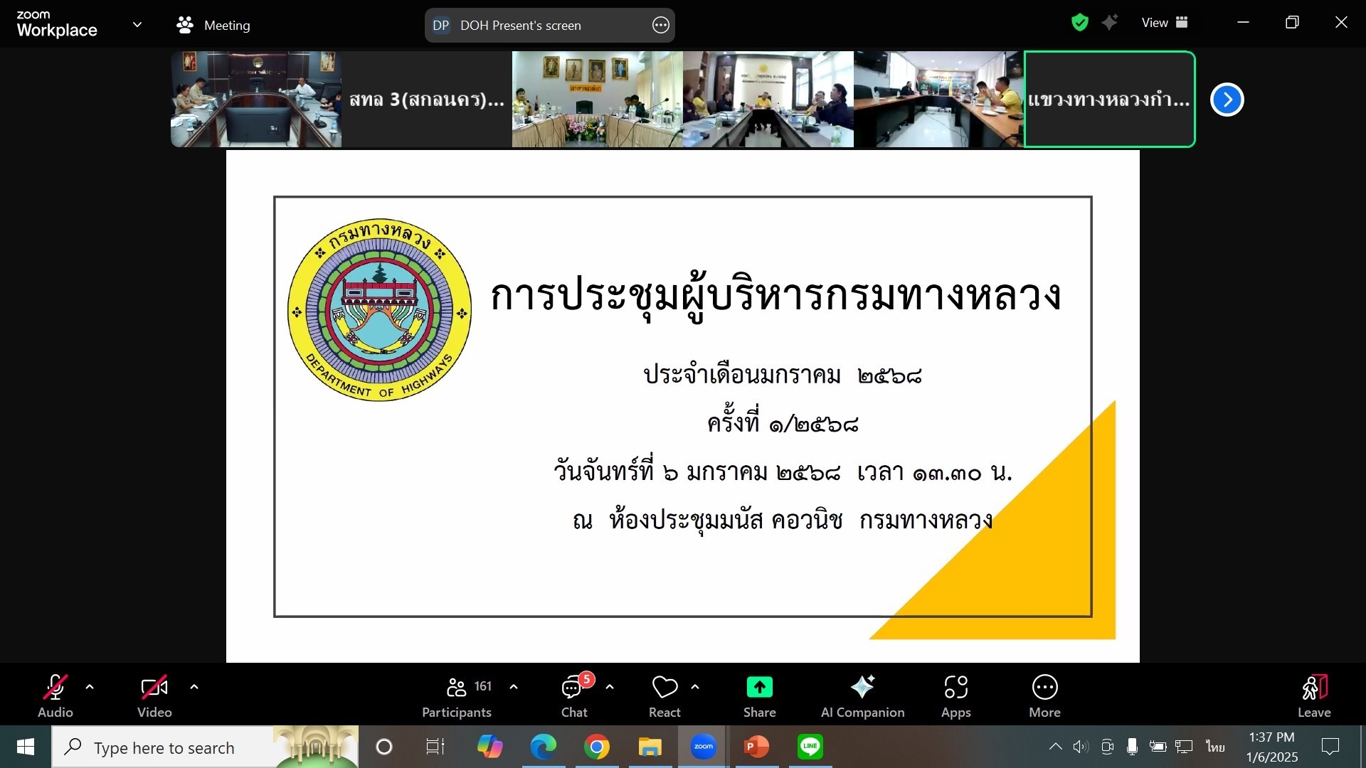 วันที่ 6 มกราคม 2568 เวลา 13.30 - 16.30 น.นายประวัติ เสวตวงษ์ รส.ทล.3.2 พร้อมด้วย ผู้อำนวยการส่วน/ฝ่าย หัวหน้างาน และเจ้าหน้าที่ที่เกี่ยวข้อง ได้รับมอบหมายจาก ผู้อำนวยการสำนักงานทางหลวงที่ 3 ให้เข้าร่วมประชุมผู้บริหารกรมทางหลวง ประจำเดือนมกราคม 2568 ครั้งที่ 1/2568 ผ่านสื่ออิเล็กทรอนิกส์แอปพลิเคชั่น Zoom Cloud Meeting ณ ห้องประชุมทวีพัฒน์ ตินะมาส ชั้น 3 อาคารหลังใหม่ โดยมี นายอภิรัฐ ไชยวงศ์น้อย อธิบดีกรมทางหลวง เป็นประธานฯ