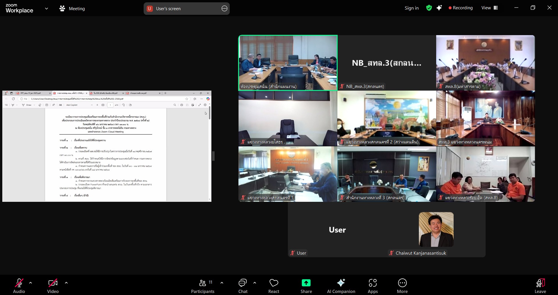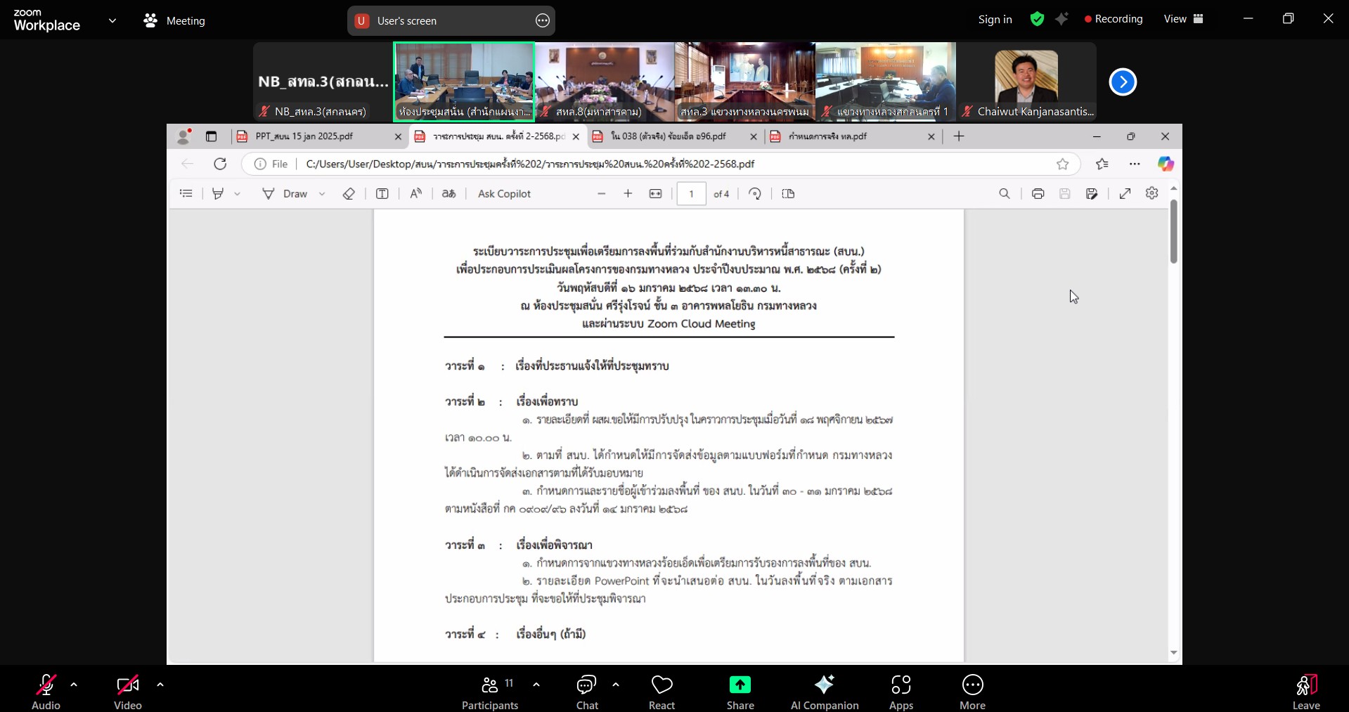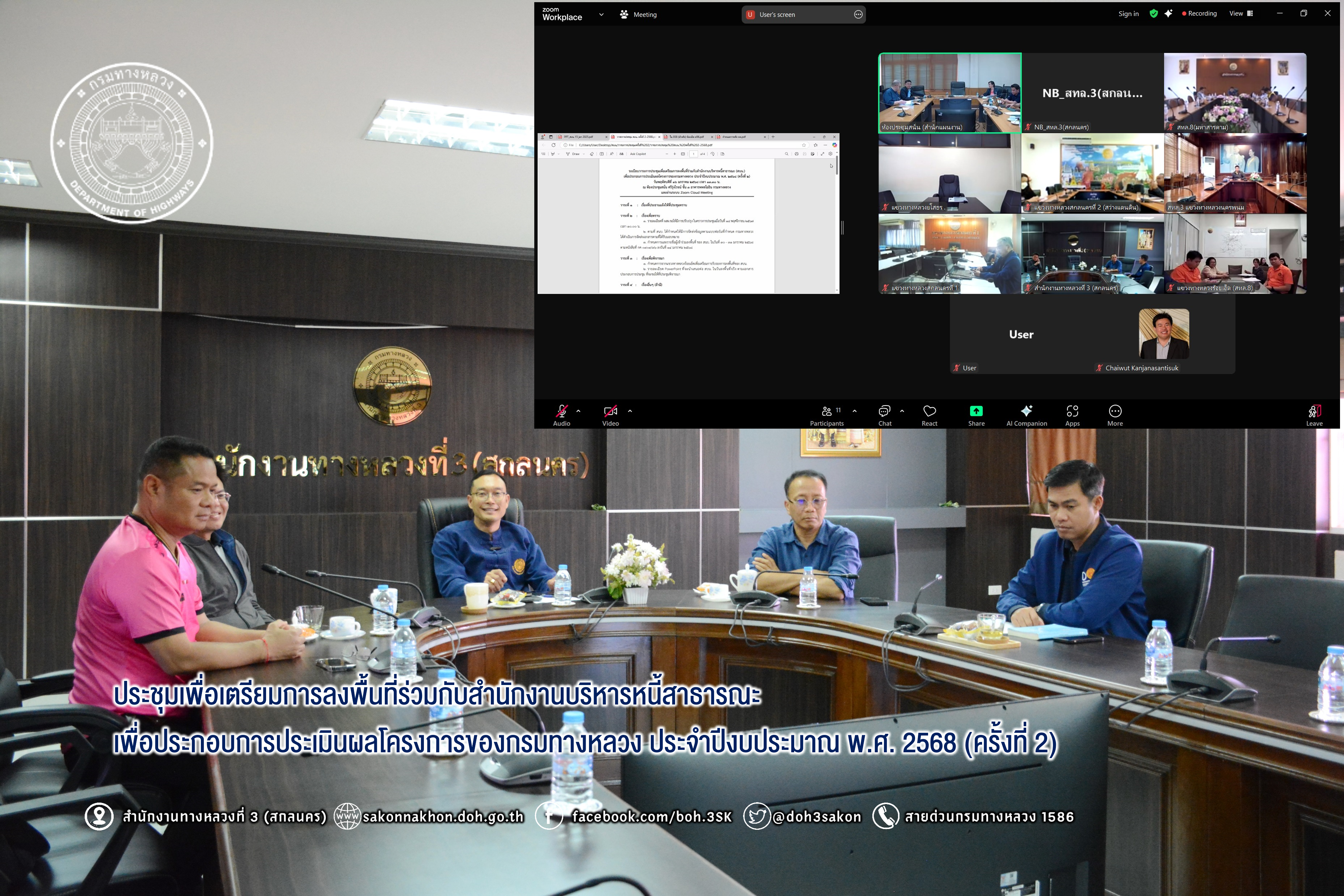 วันที่ 16 มกราคม 2568 เวลา 13.30 - 14.30 น. นายพัลลภ จันทร์งามปภากูล ผู้อำนวยการสำนักงานทางหลวงที่ 3 พร้อมด้วย นายเดชา พรวนพิทักษ์ รส.ทล.3.1, นายประวัติ เสวตวงษ์ รส.ทล.3.2, นายประสิทธิ์ สาขา ผอ.ขท.สกลนครที่ 1 และนายชินนพัทธ์ มุลทาทอง วผ.ทล.3 เข้าร่วมประชุมเพื่อเตรียมการลงพื้นที่ร่วมกับสำนักงานบริหารหนี้สาธารณะเพื่อประกอบการประเมินผลโครงการของกรมทางหลวง ประจำปีงบประมาณ พ.ศ. 2568 (ครั้งที่ 2) ผ่านระบบ Zoom Cloud Meeting ณ ห้องประชุมทวีพัฒน์ ตินะมาส ชั้น 3 อาคารหลังใหม่