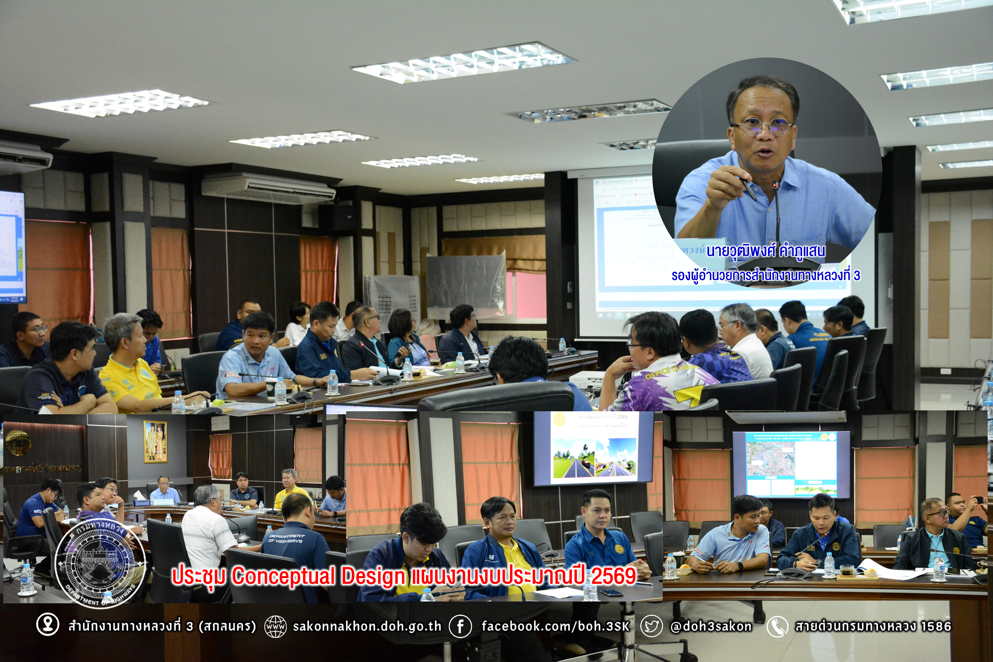 วันที่ 16 พฤษภาคม 2568 เวลา 09.00 น.นายประวัติ เสวตวงษ์ รองผู้อำนวยการสำนักงานทางหลวงที่3 เป็นประธานประชุม Conceptual Design การจัดทำแผนงานประจำปีงบประมาณปี 2569 โดยมี รองผู้อำนวยการแขวงทางหลวงในสังกัด (ฝ่ายปฎิบัติการ) พร้อมด้วยนายพงษ์ศักดิ์ อาจลา ผู้อำนวยการส่วนควบคุมงานก่อสร้างทาง, นายเอกชัย แสนสงค์ ผู้อำนวยการส่วนตรวจสอบฯ หัวหน้าฝ่ายงานวางแผนของแขวงทางหลวงในสังกัด วิศวกรโยธา/นายช่างโยธา ส่วนควบคุมงานก่อสร้างทาง ส่วนตรวจสอบฯ ส่วนแผนงาน ร่วม ประชุม Conceptual Design งบประมาณปี 2569 เพื่อเตรียมความพร้อมในการแผนรายประมาณประจำปีงบประมาณ 2569 ณ ห้องประชุมทวีพัฒน์ ตินะมาส ชั้น 3 อาคารหลังใหม่