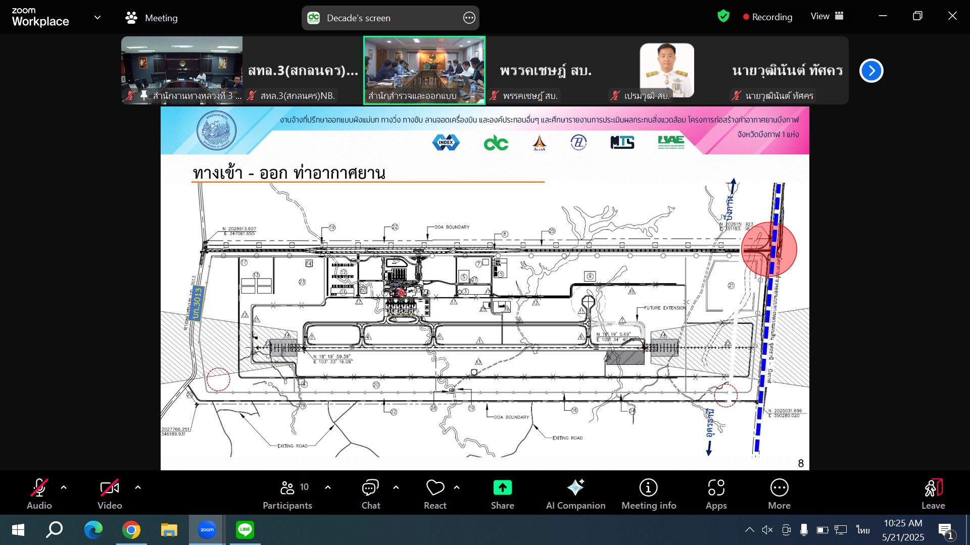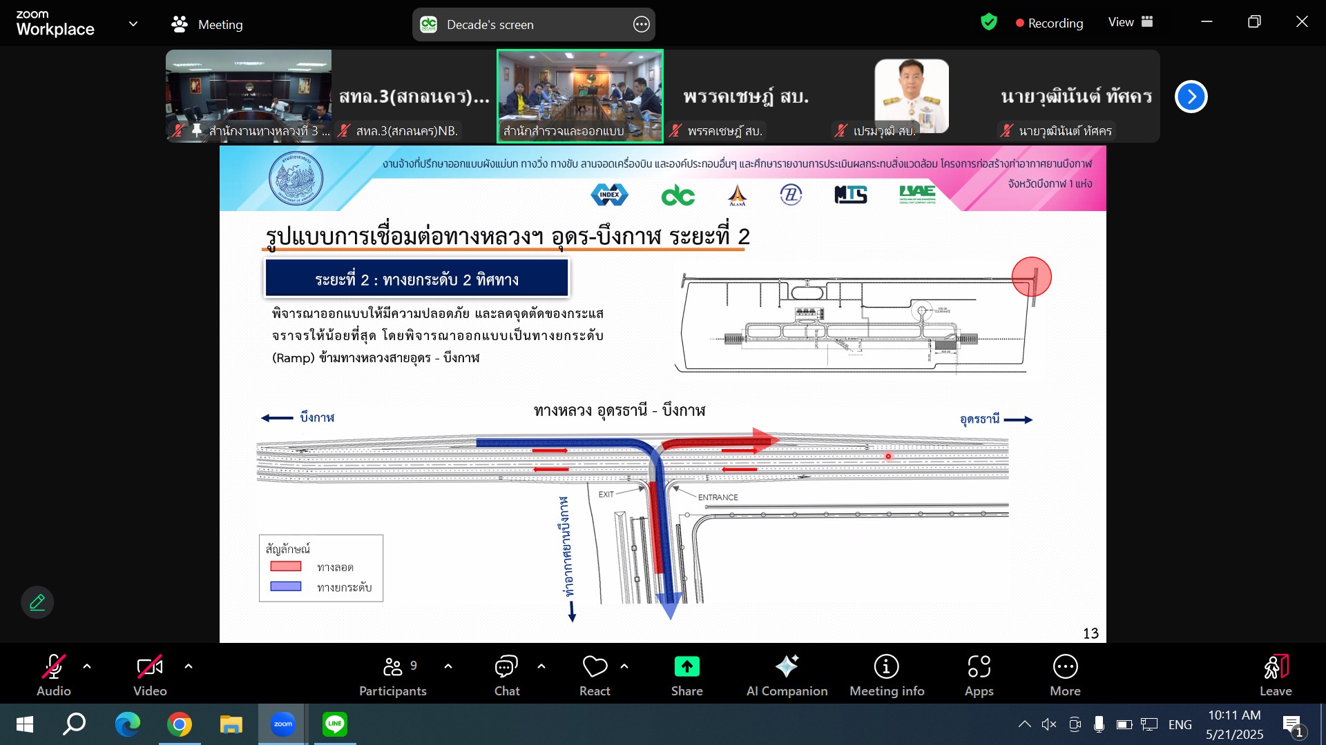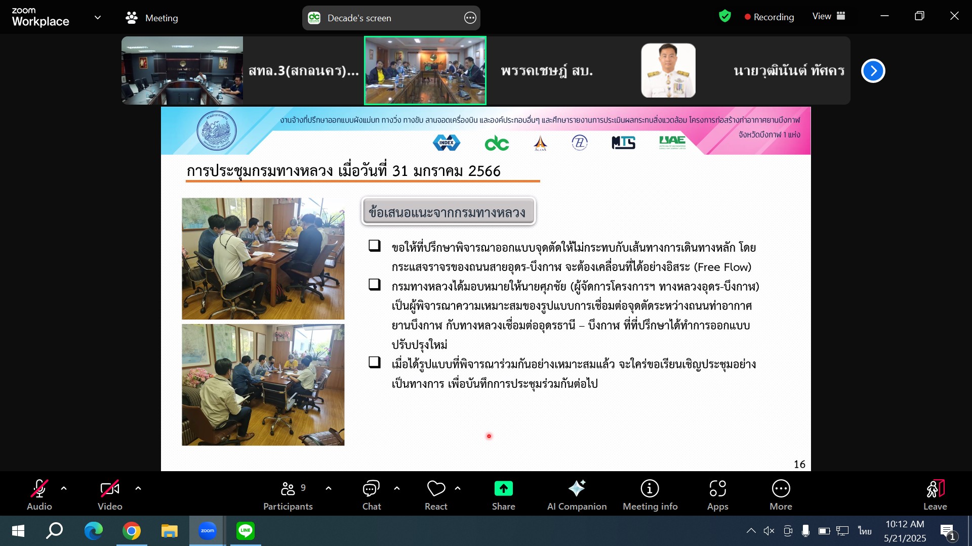 วันที่ 21 พฤษภาคม 2568 เวลา 10.00 น.นายประวัติ เสวตวงษ์ รองผู้อำนวยการสำนักงานทางหลวงที่ 3 พร้อมด้วย วิศวกรโยธา ส่วนแผนงาน เข้าร่วมประชุมการออกแบบถนนภายในโครงการก่อสร้างท่าอากาศยานบึงกาฬ และจุดเชื่อมต่อทางหลวงแนวใหม่เชื่อมโยงทางหลวง 2 - ทางหลวงหมายเลข 222 อุดรธานี - บึงกาฬ ผ่านสื่ออิเล็กทรอนิกส์ โปรแกรม Zoom ณ ห้องประชุมทวีพัฒน์ ตินะมาส ชั้น 3 อาคารหลังใหม่ โดยมี นายสิทธิชัย บุญสะอาด วิศวกรใหญ่ด้านสำรวจและออกแบบ เป็นประธานฯ