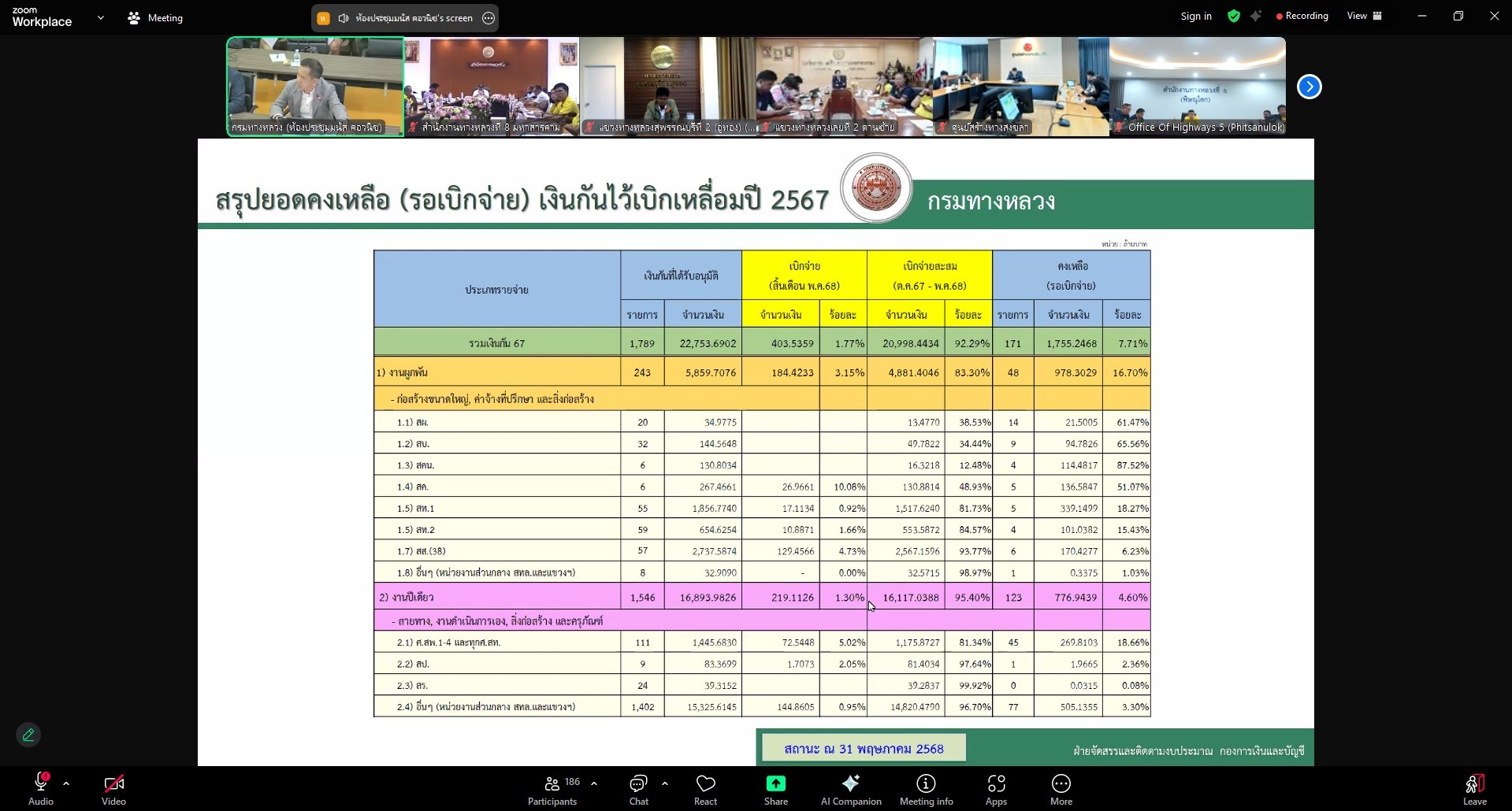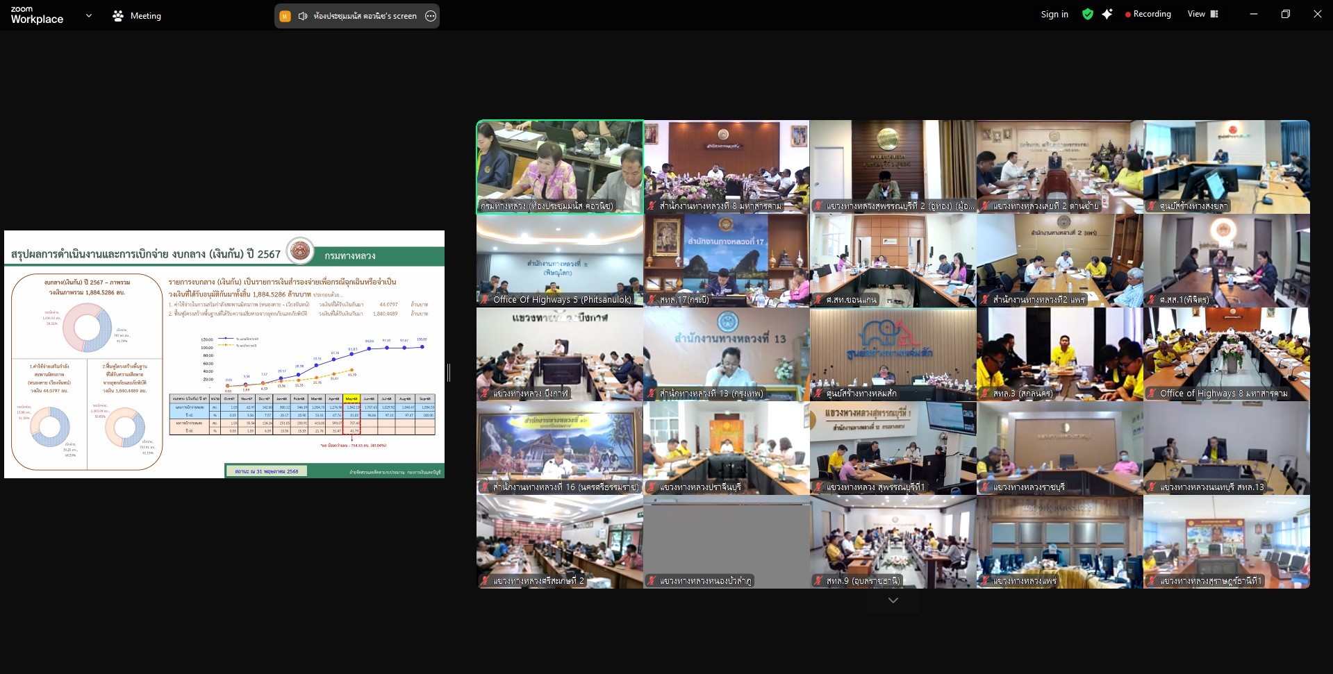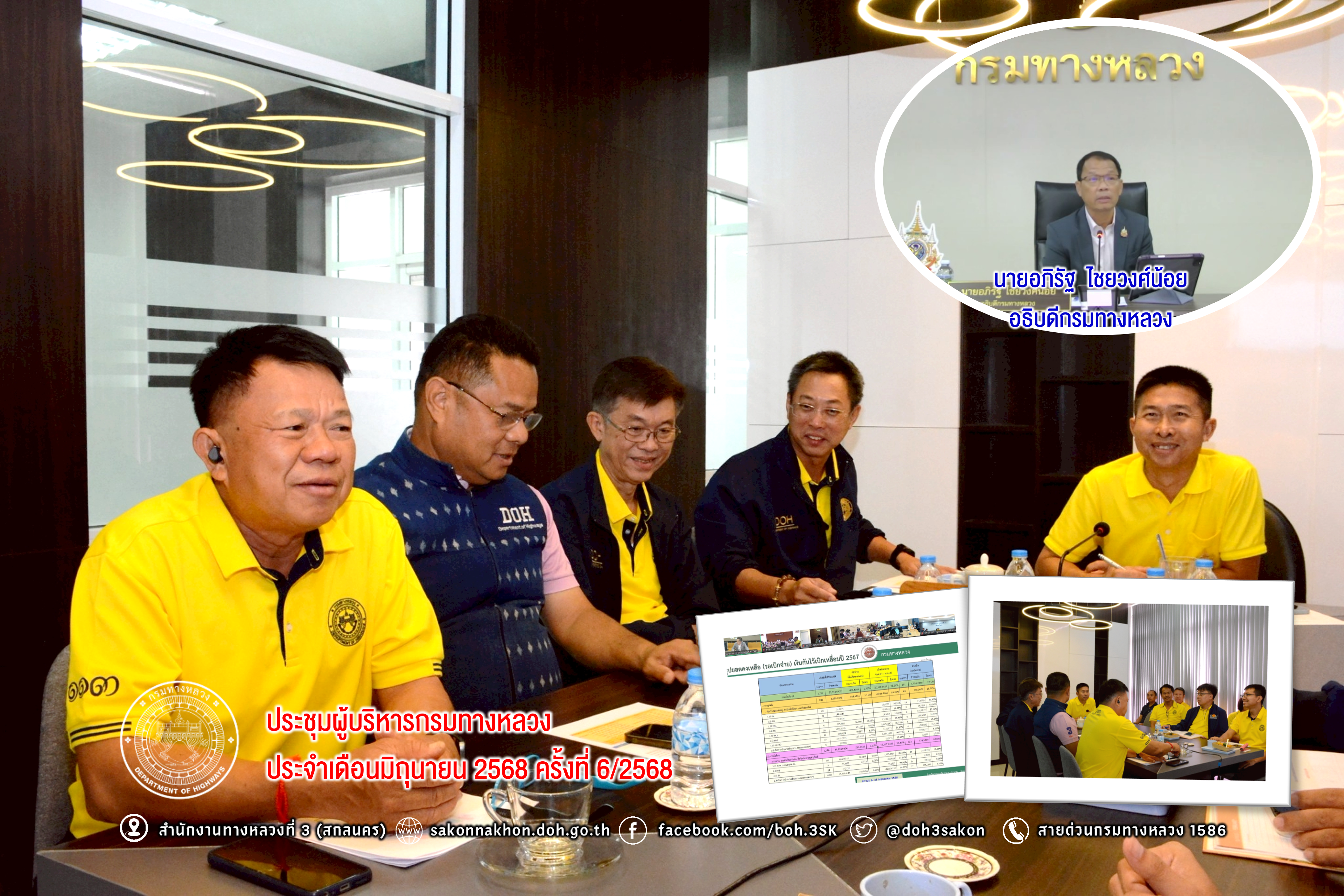 วันที่ 10 มิถุนายน 2568 นายชัยธวัช พรหมวิชัย ผู้อำนวยการสำนักงานทางหลวงที่ 3 พร้อมด้วยผู้อำนวยการแขวงทางหลวงในสังกัด, ผู้อำนวยการส่วน/ฝ่าย หัวหน้างาน และเจ้าหน้าที่ที่เกี่ยวข้อง เข้าร่วมประชุมผู้บริหารกรมทางหลวง ประจำเดือนมิถุนายน 2568 ครั้งที่ 6/2568 เพื่อติดตามผลการเบิกจ่ายงบประมาณรายจ่าย ประจำเดือนพฤษภาคม 2568 และติดตามสถานะความคืบหน้าโครงการก่อสร้างขนาดใหญ่ ณ ห้องประชุมชั้น 2 อาคารหลังใหม่ สำนักงานทางหลวงที่ 3 (สกลนคร)